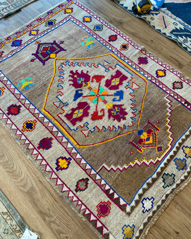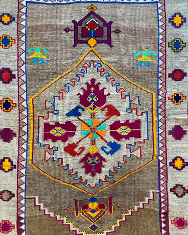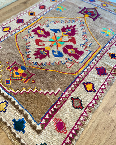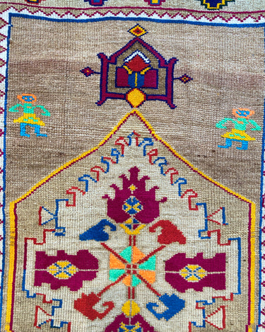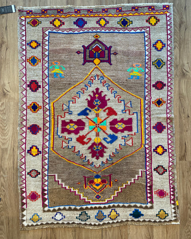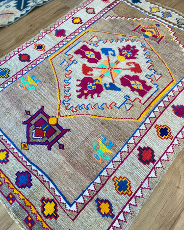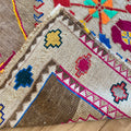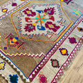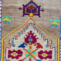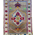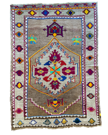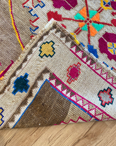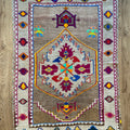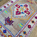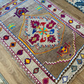 Unique Vintage Kars rug in excellent condition. Cool toned taupe field with pops of magenta, neon green, orange, yellow and blue. Very special and collectible rug.