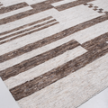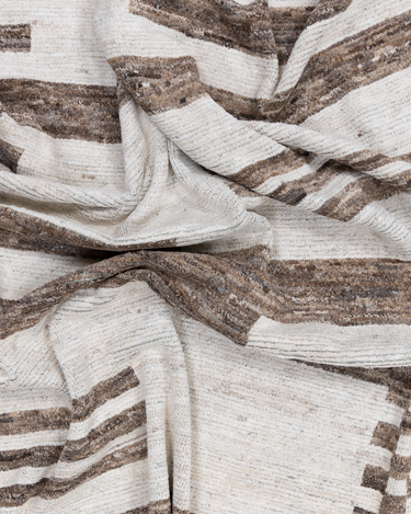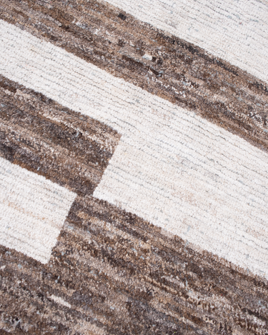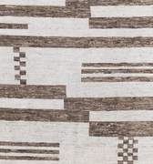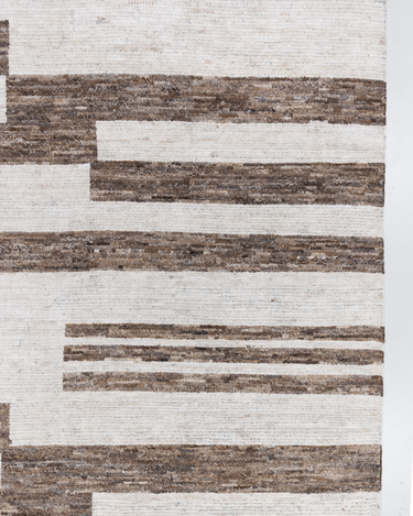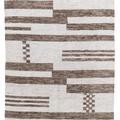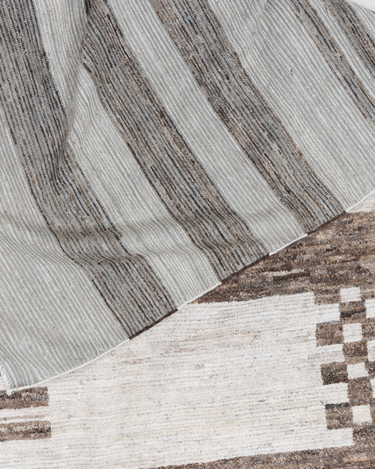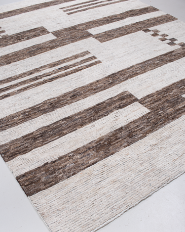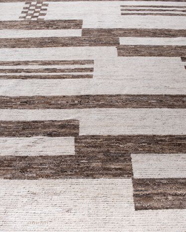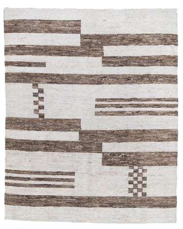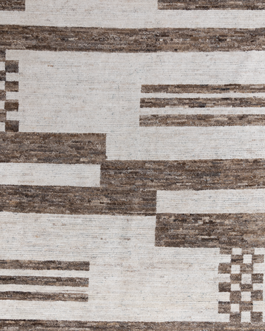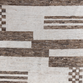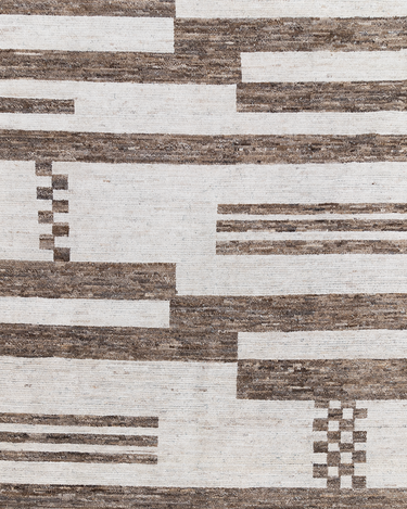 Crafted by hand using 100% wool, this Tulu pile rug features a neutral palette of off-white and brown with a stylish geometric pattern and checkered accents, providing a modern look that is also soft and inviting.