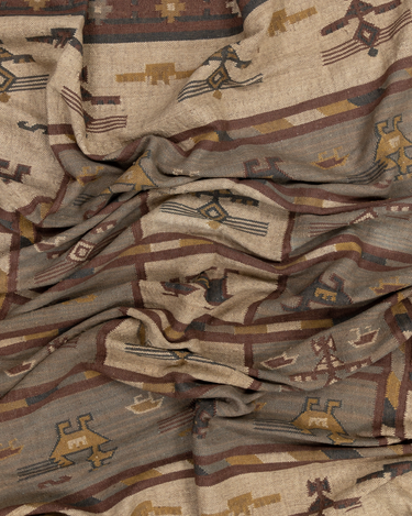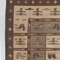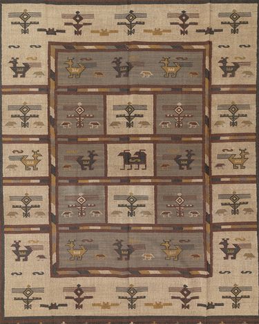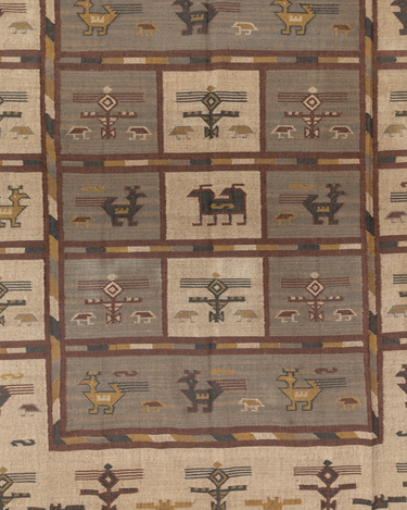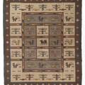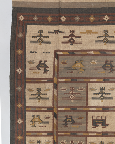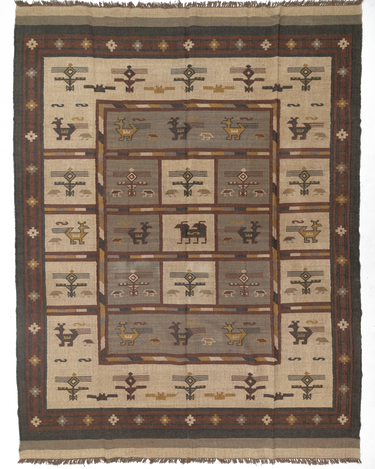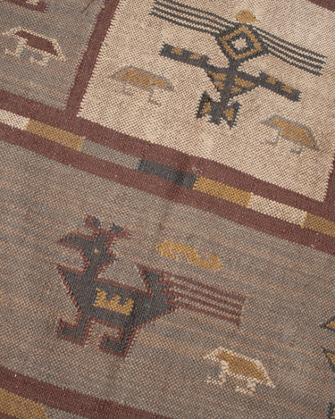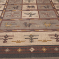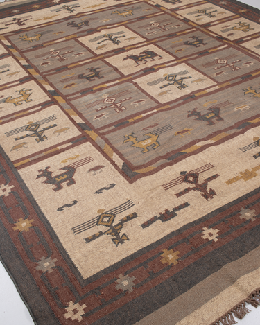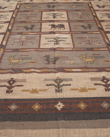 This unique hand knotted Indian flatweave rug dates back to the fourth quarter of the twentieth century and boasts an array of earthy tones and a detailed pictorial design.