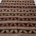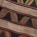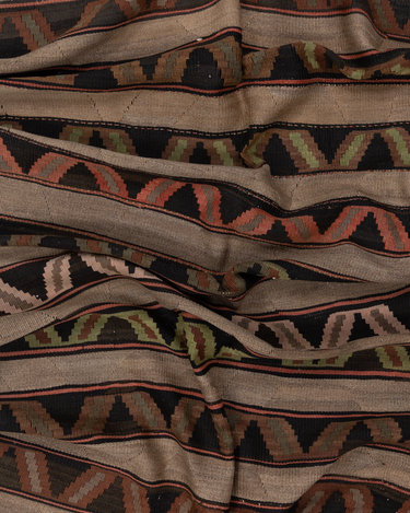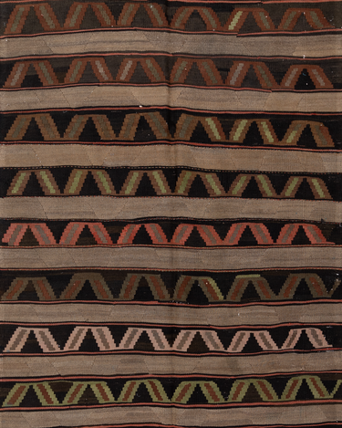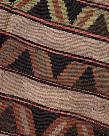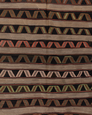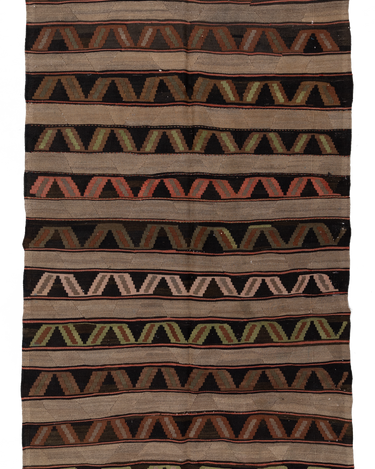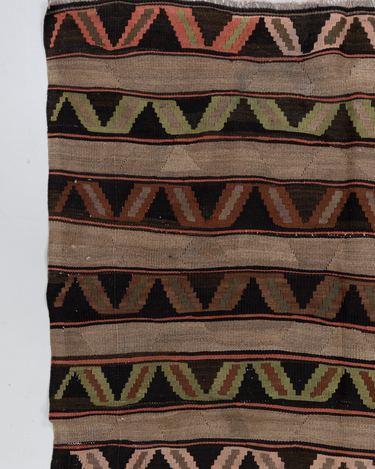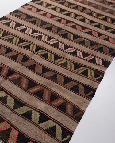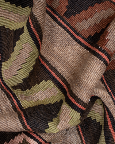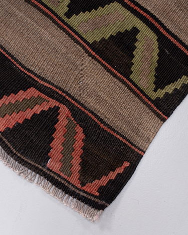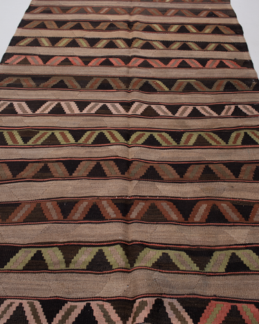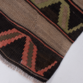 This Vintage Turkish Kilim Rug is a true one-of-a-kind. Crafted with a unique flatwoven style, this rug features a stunning geometrical pattern in rich brown, pink, and green tones. A timeless addition to any home.