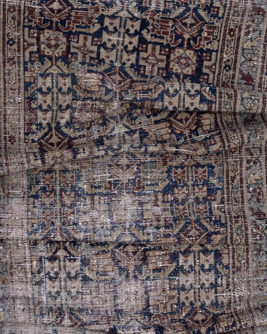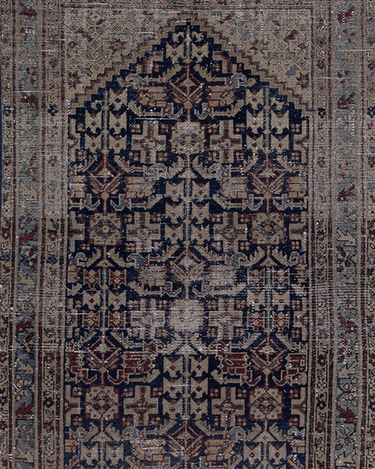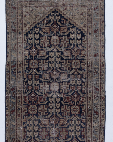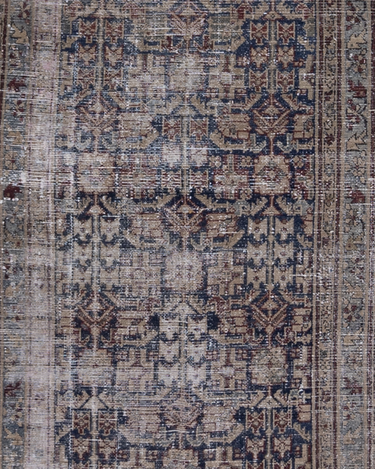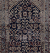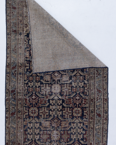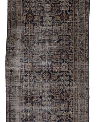 Moody and deep, this midnight blue runner has an alluring and mysterious quality to it. The always popular herati design in shades of gray, taupe and brown are subtle against the deep field. Even wear and distressing. Safe for high traffic.