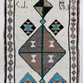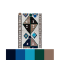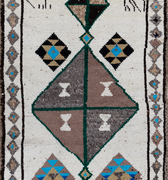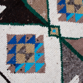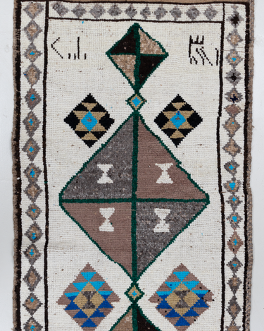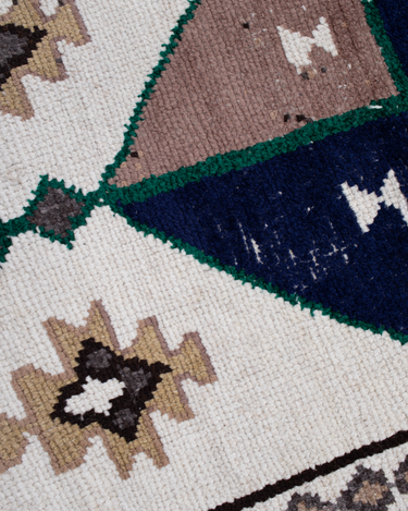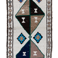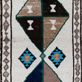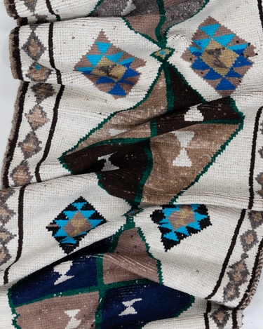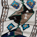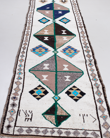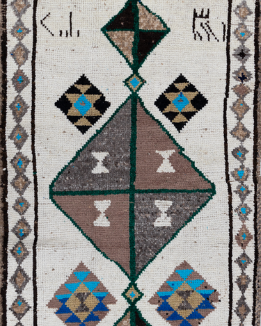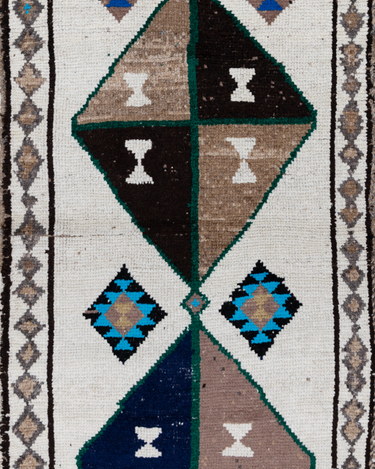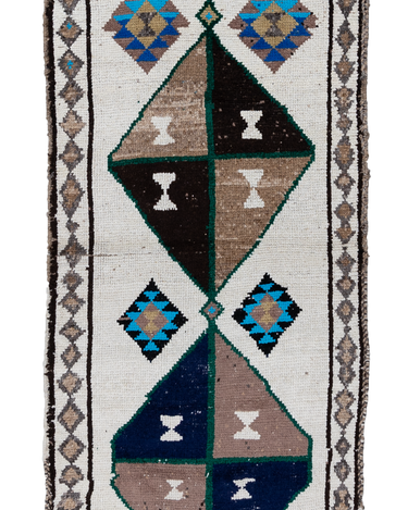 Wool on wool herki runner with an unusual white field. Bold medallions for a statement in lovely blue, brown and gold tones. Soft underfoot.