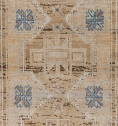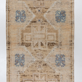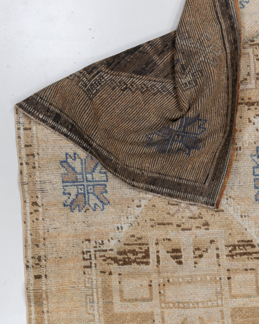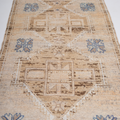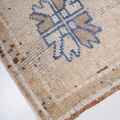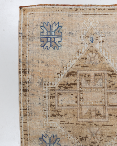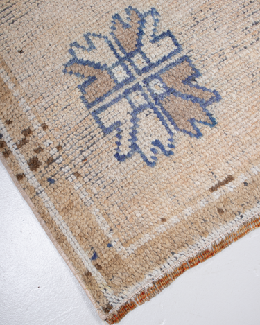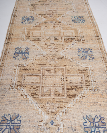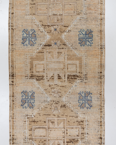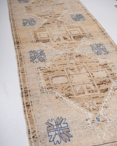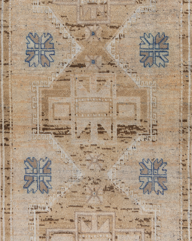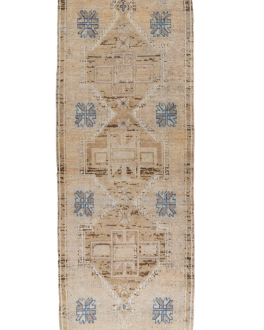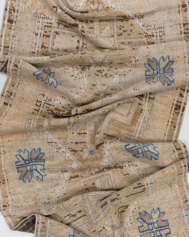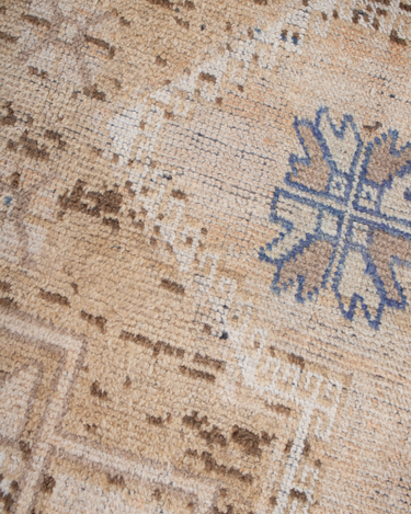 Lovely textural runner in a hard to find size. We love the subtle neutral field and pops of blue in the design.