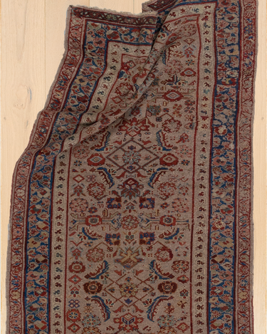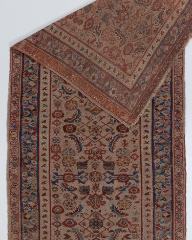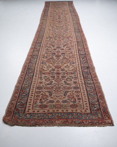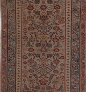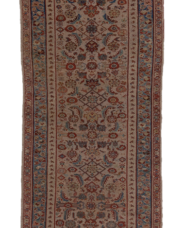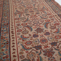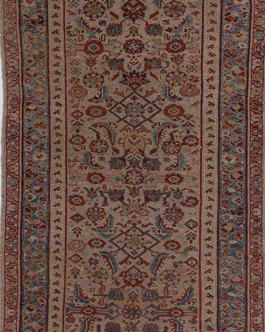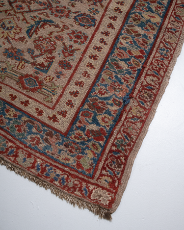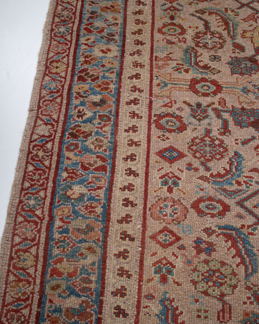 Good condition. Beautiful warm camel field with all over herati pattern. Faded soft reds and blue tones.
