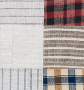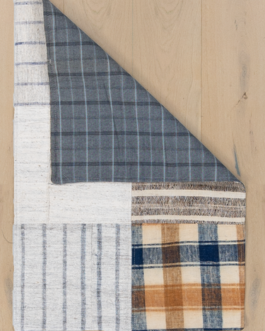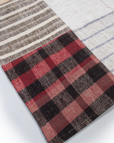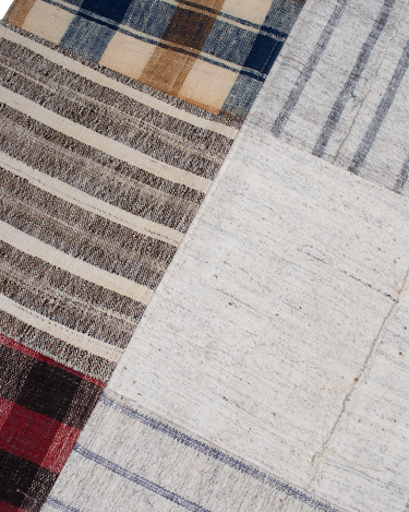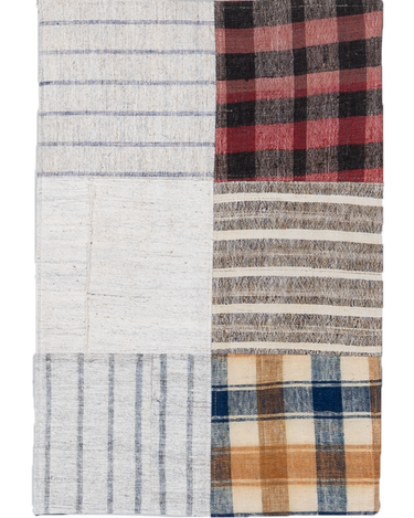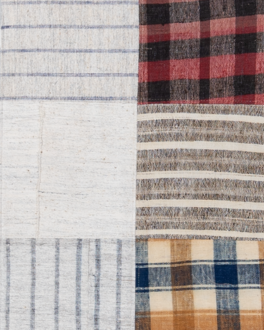 Textile fragments newly reimagined and sewn into a patchwork rug