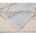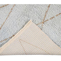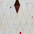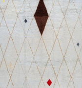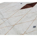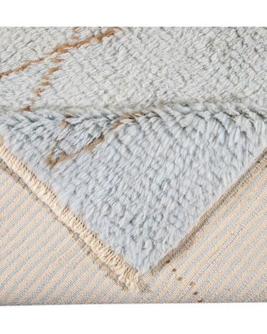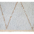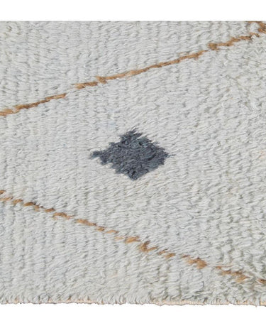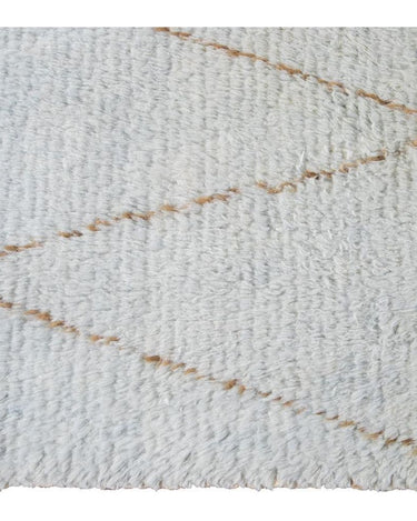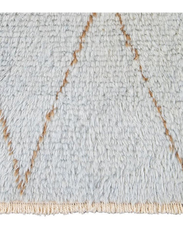 Beautiful contemporary Moroccan-style rug, hand knotted wool with a light blue field, tan subtle multi-color accents in a gorgeous midcentury inspired tribal design.