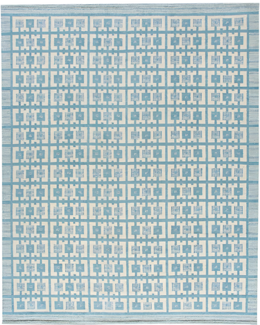 Beautiful modern oversize Swedish style wool rug with a blue field. This Swedish rug has accents of ivory in a gorgeous all-over geometric square pattern design.