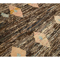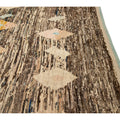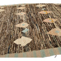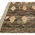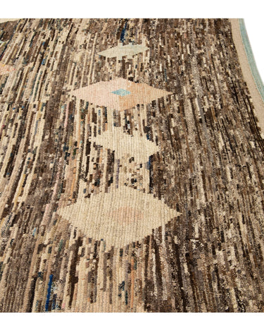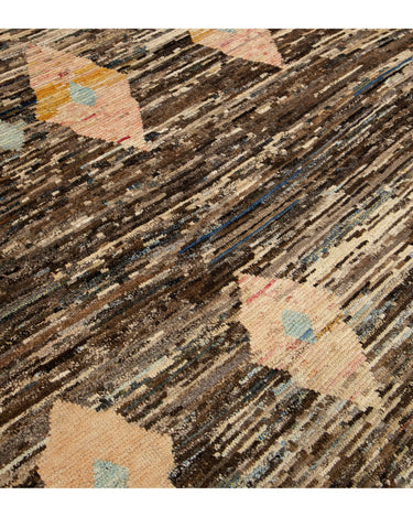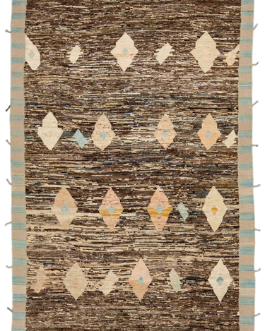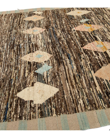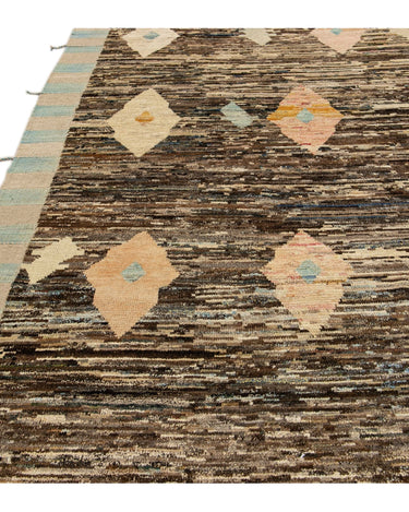 Beautiful Moroccan style handmade wool rug with a brown field. This Modern rug has peach and beige accents and beige-blue braid fringes featuring a gorgeous all-over geometric boho design.