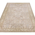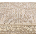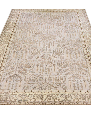 Beautiful contemporary Oushak hand-knotted wool rug with a beige field. This Oushak rug has a scattered brown and blue spray of vine scroll designed frame and an all-over geometric floral design.