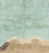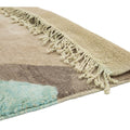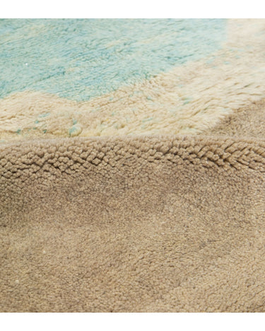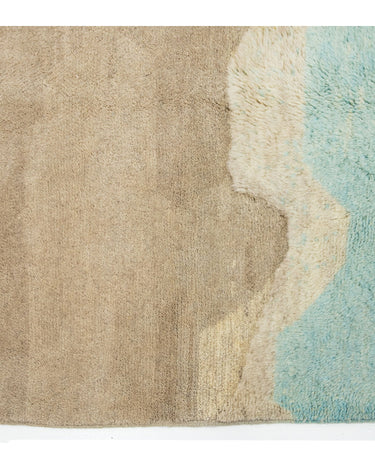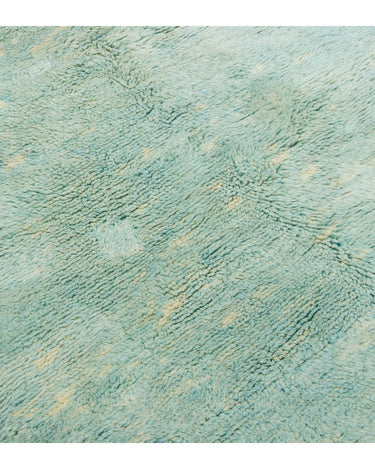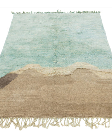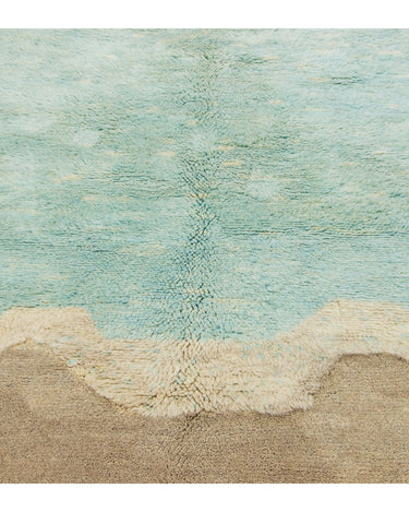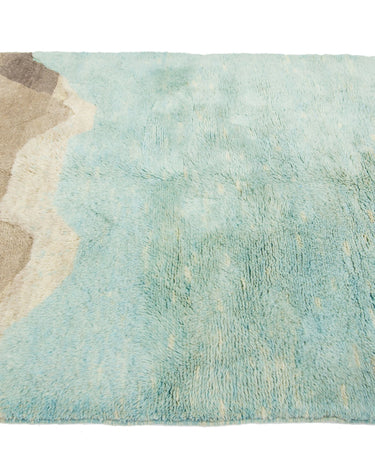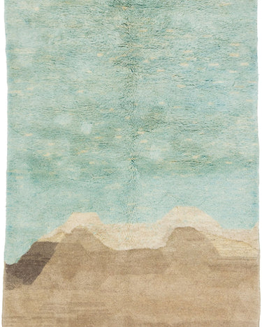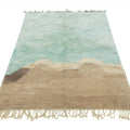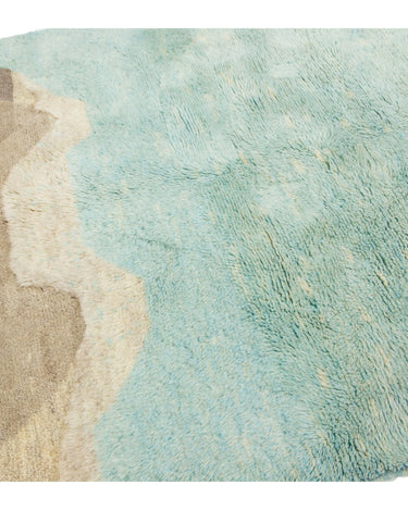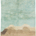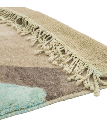 This hand-knotted wool rug showcases a stunning contemporary Moroccan. It features a beautiful abstract design with a green and light brown field. Crafted with utmost precision, this luxury rug is a masterpiece that adds a touch of sophistication to interior decor.
