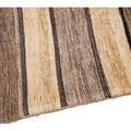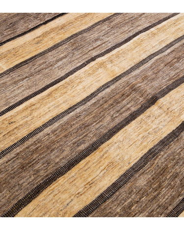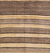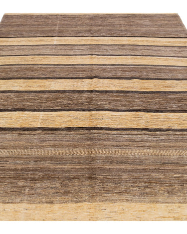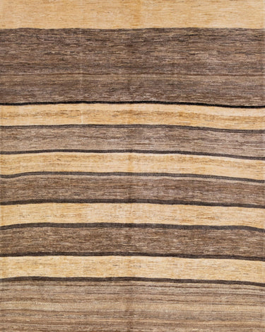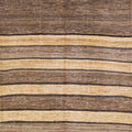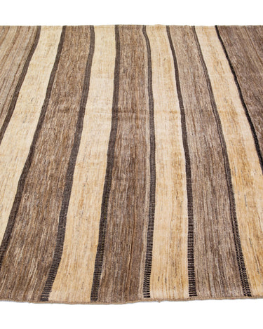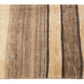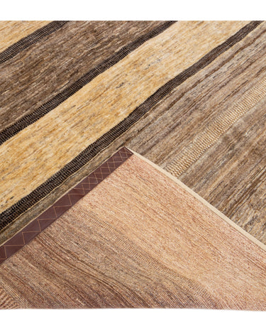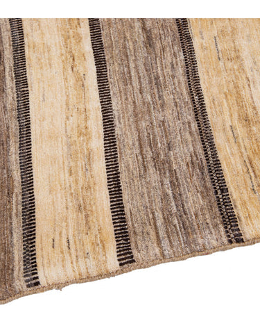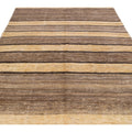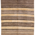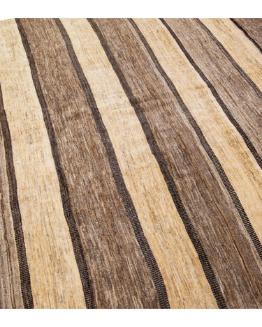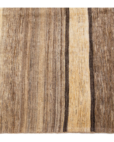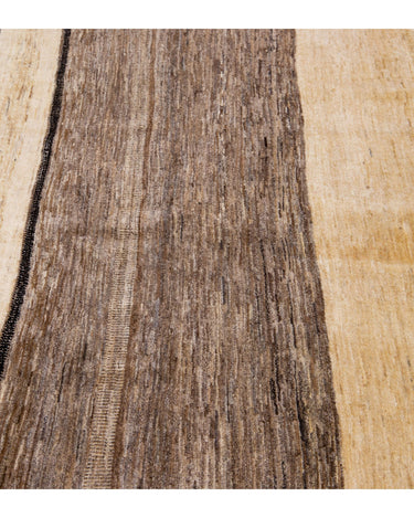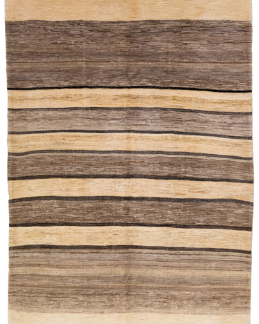 Beautiful modern Gabbeh-style hand-woven wool rug with a beige color field. This piece has brown accents in a gorgeous abstract design.