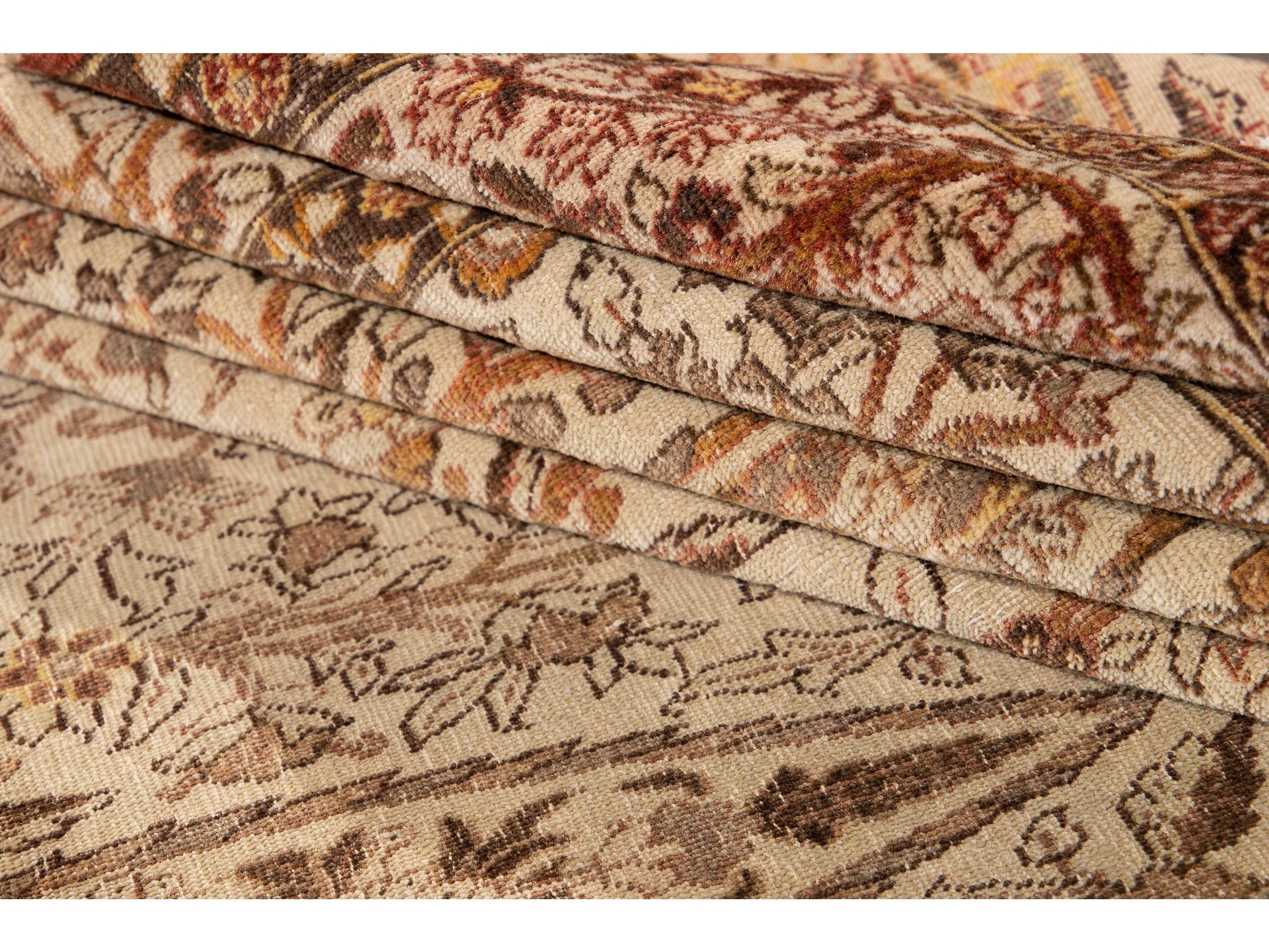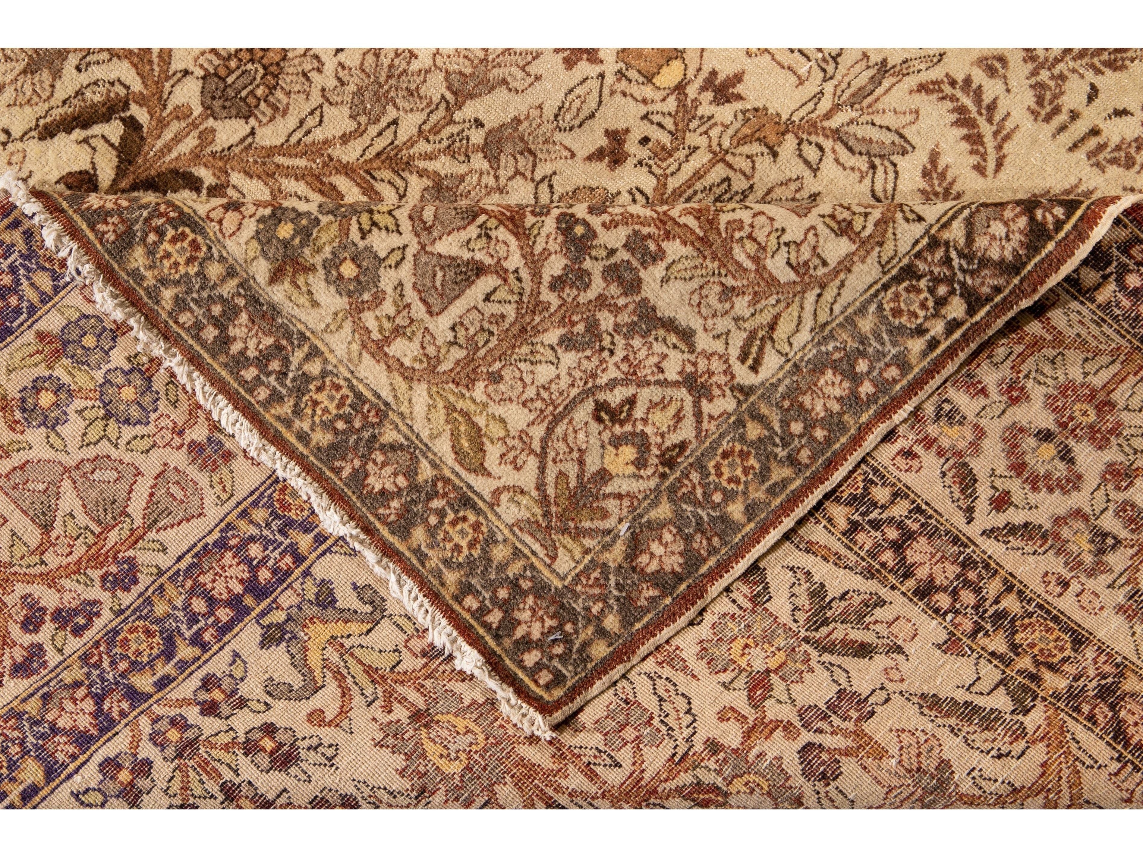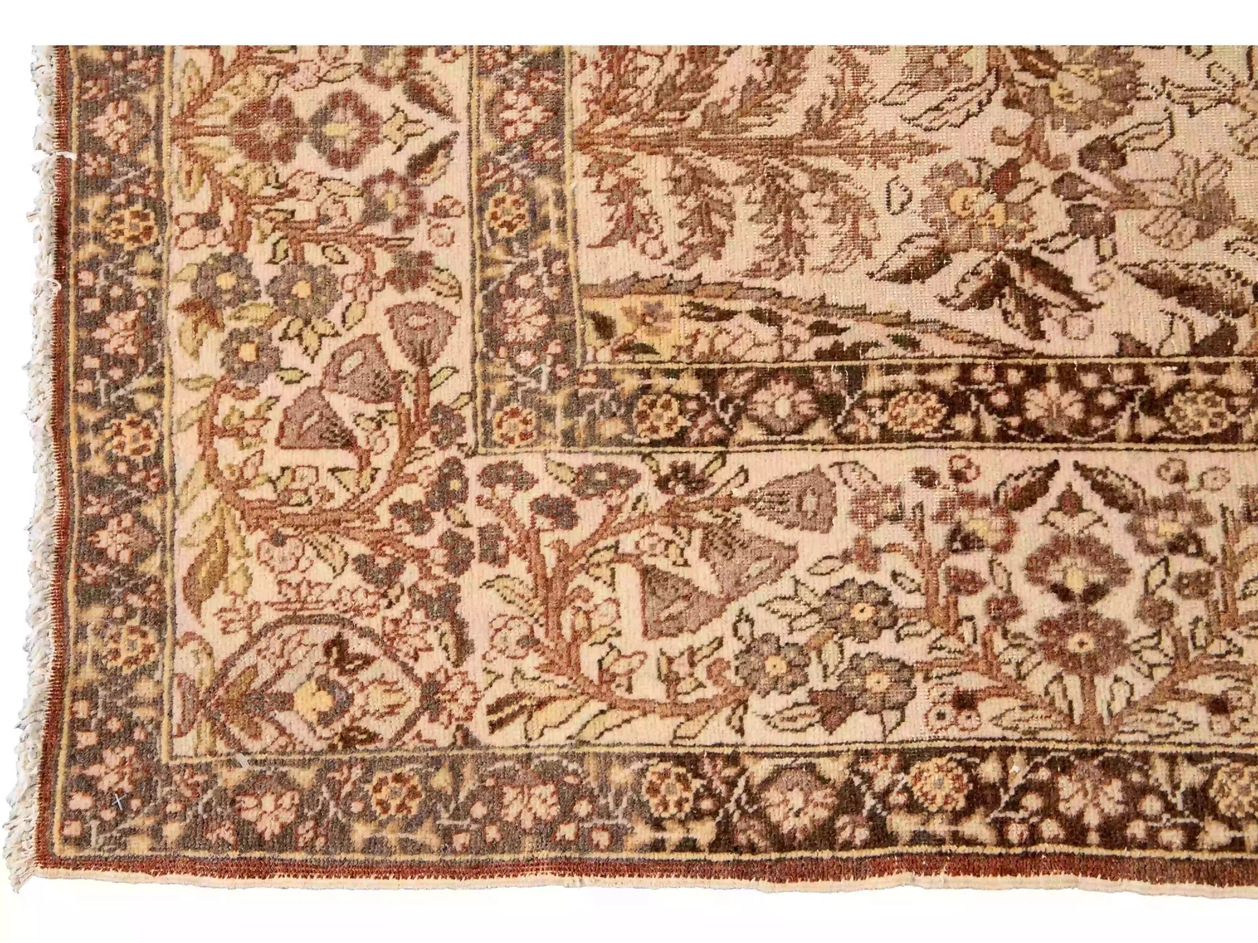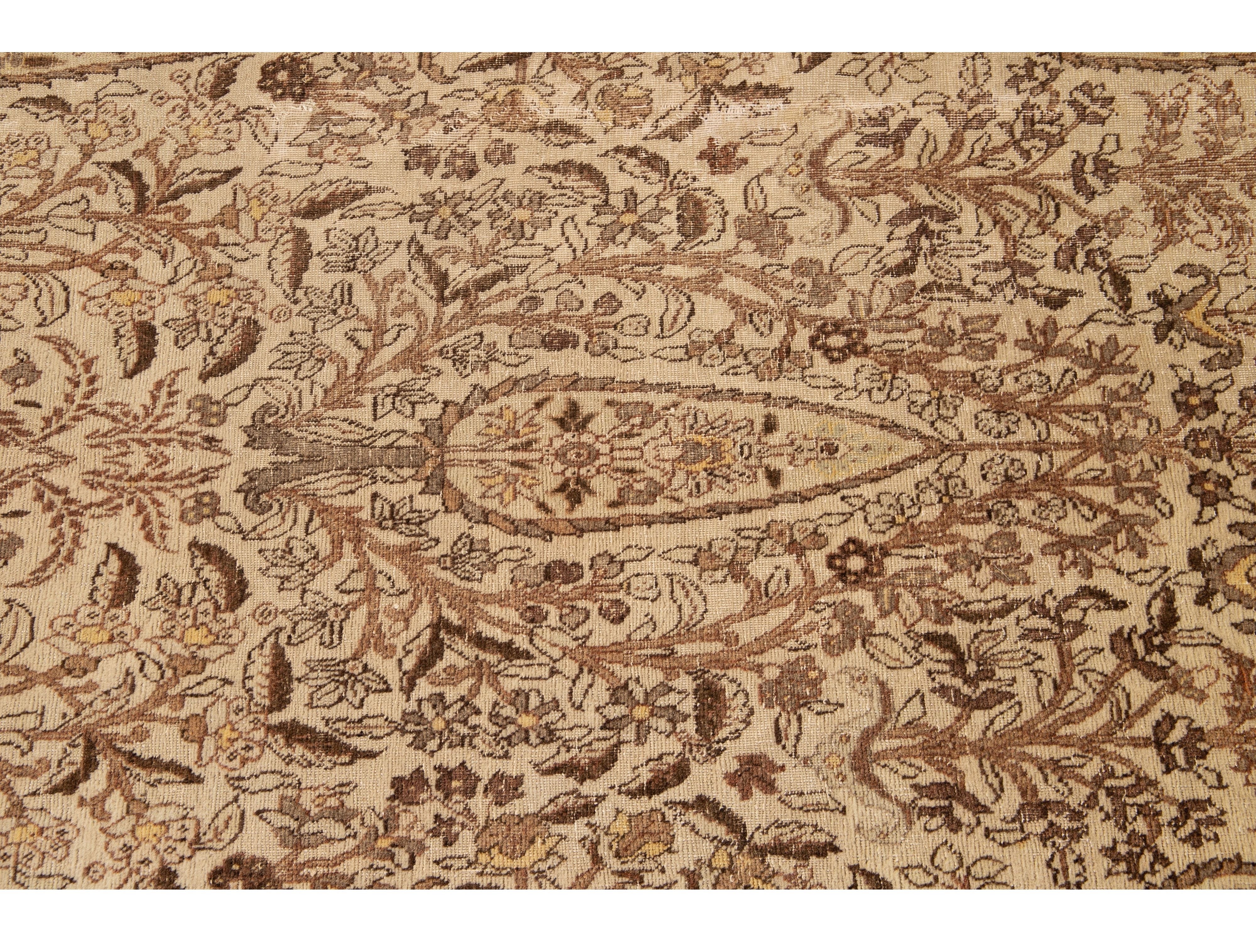 Beautiful vintage Persian distressed hand-knotted wool rug with a beige field. This piece has gray, rust, and yellow accents in a gorgeous all-over floral Pattern design.