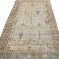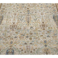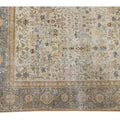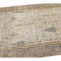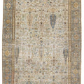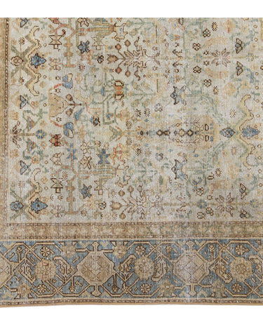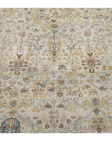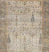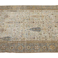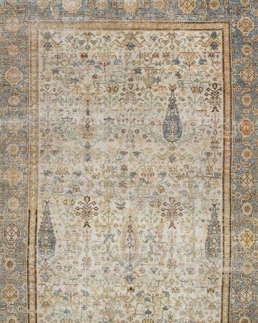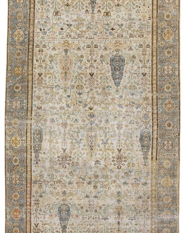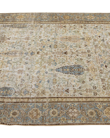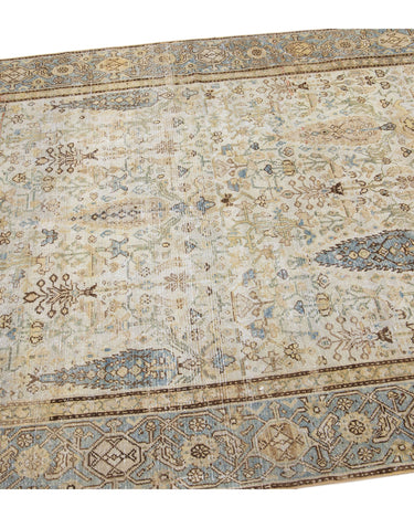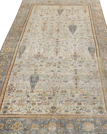 Beautiful antique Malayer hand-knotted wool rug with a beige color field. This Persian rug has beige, blue, and rust accents in a gorgeous traditional floral design.