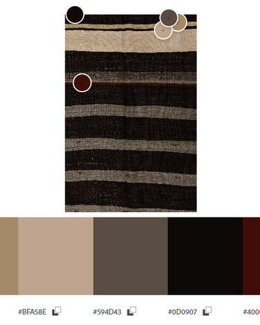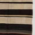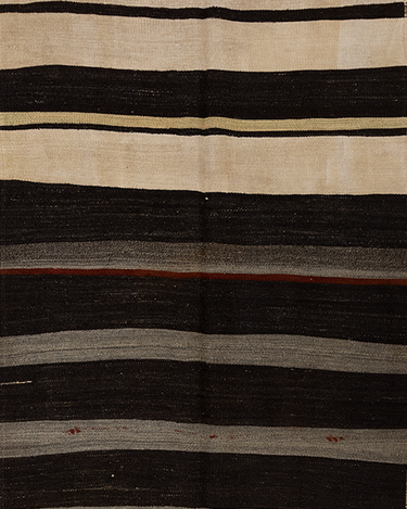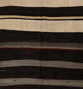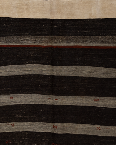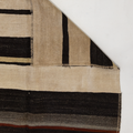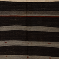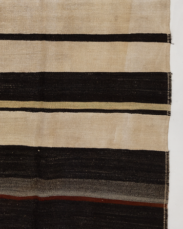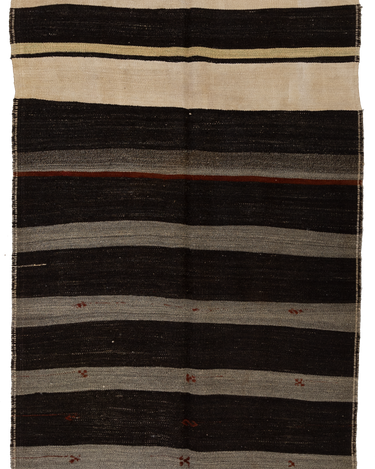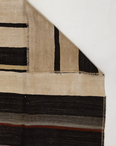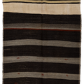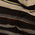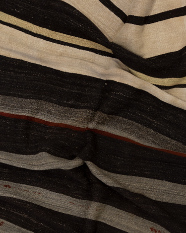 Moody traditional striped hemp Kilim. The inclusion of ribbon and evil eye symbols are said to represent good luck. Best used with a rug pad or layered to prevent slipping. Can also be used for upholstery.