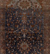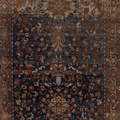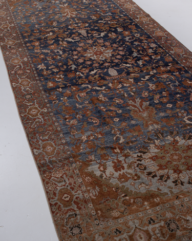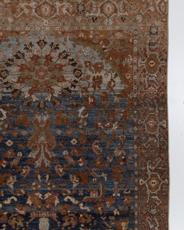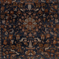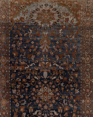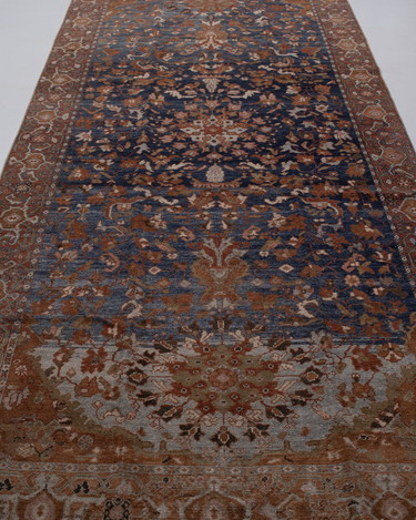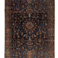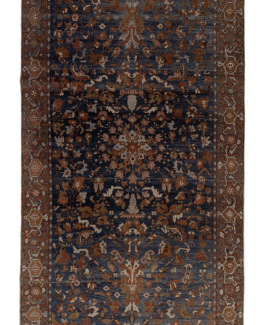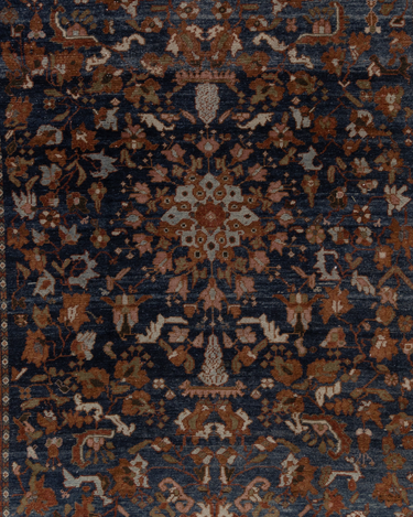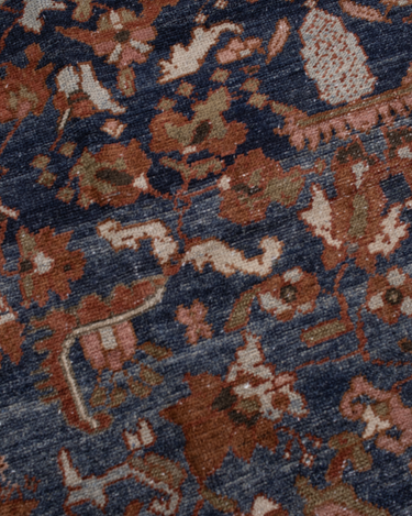 Deep blue with abrash, well detailed with an interested motif of foliage bursting in bloom. Excellent condition with a soft pile.