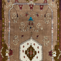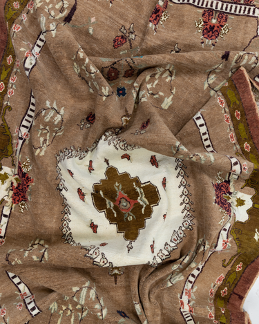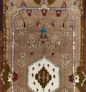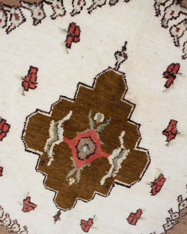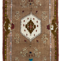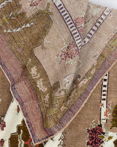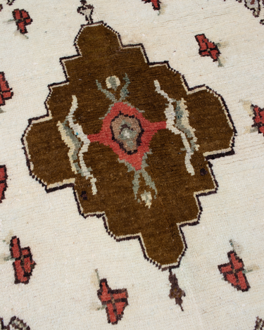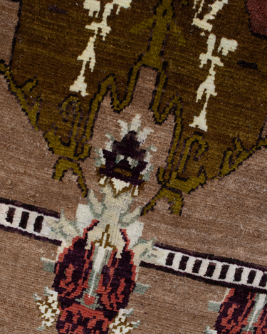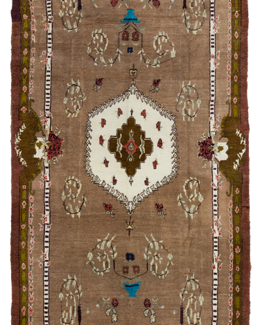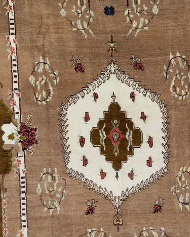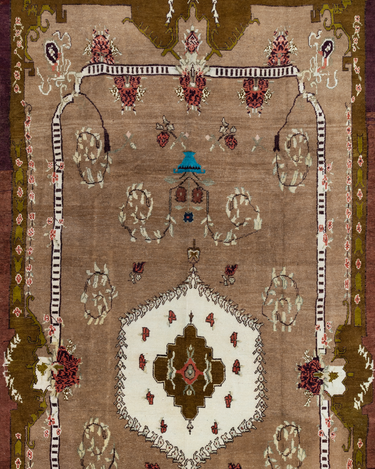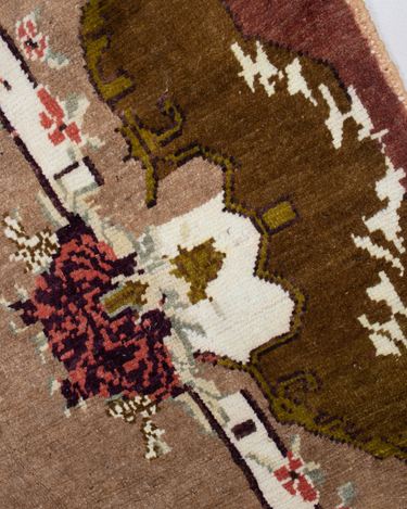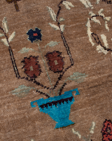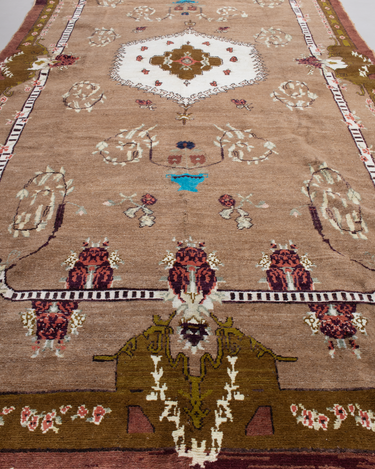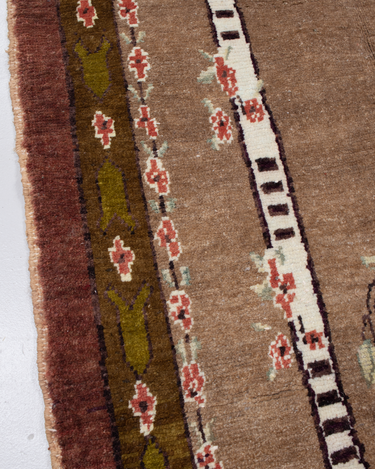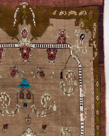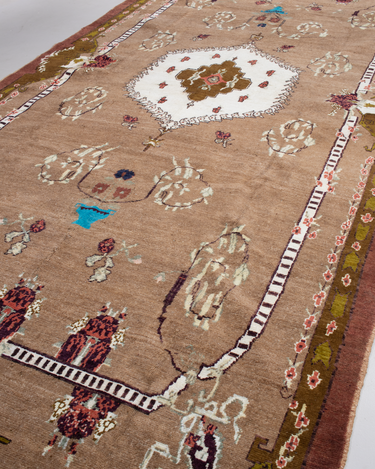 Whimsical Anatolian gallery rug with a warm taupe field and playful florals. Features a Russian influence in the motif.
