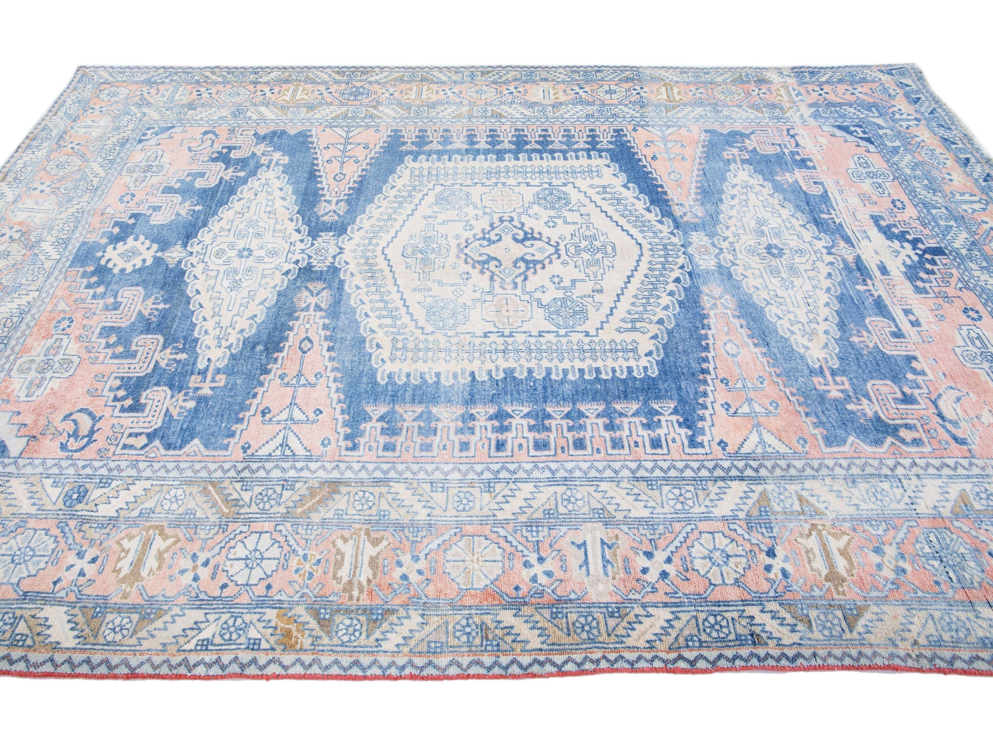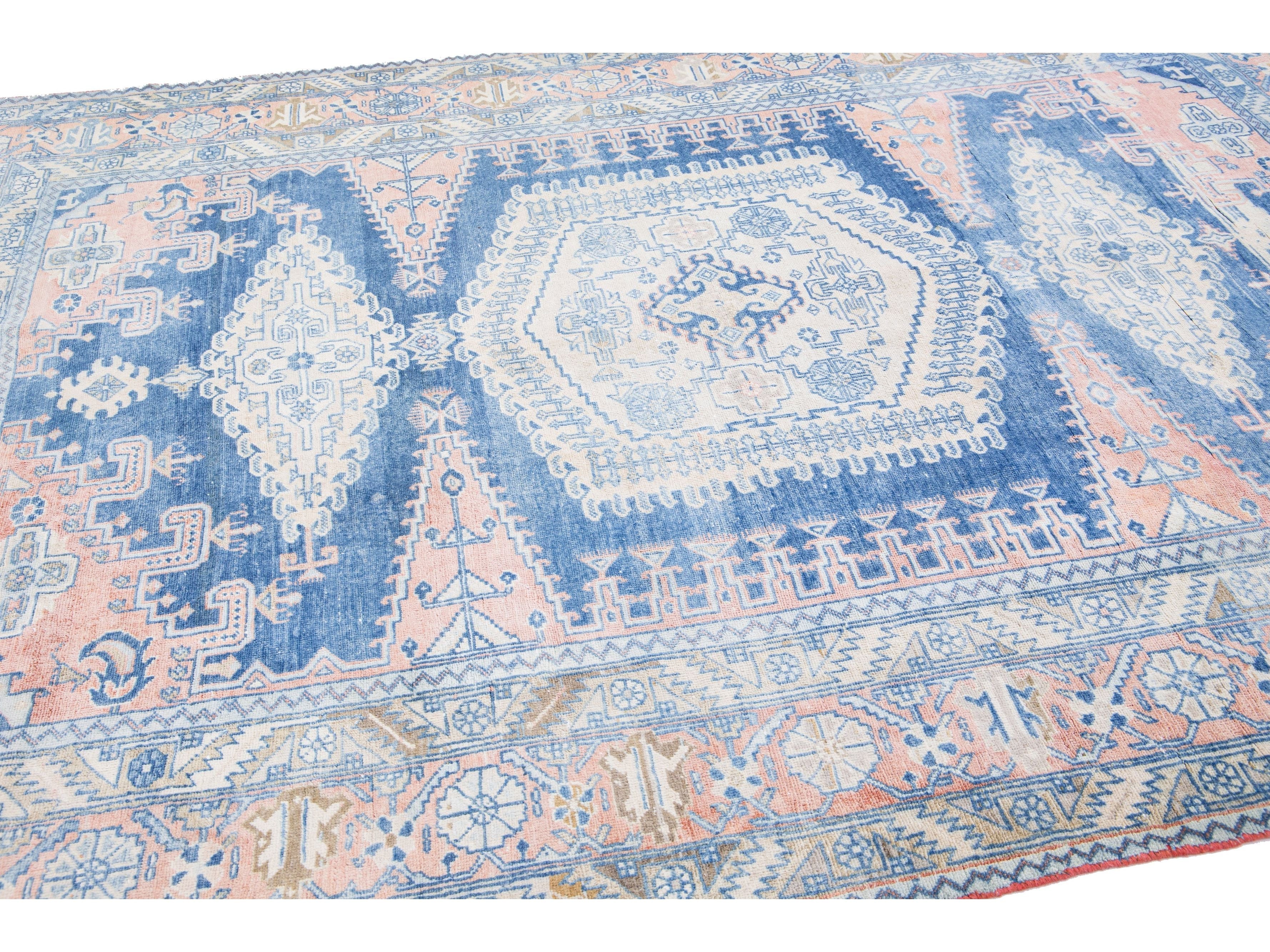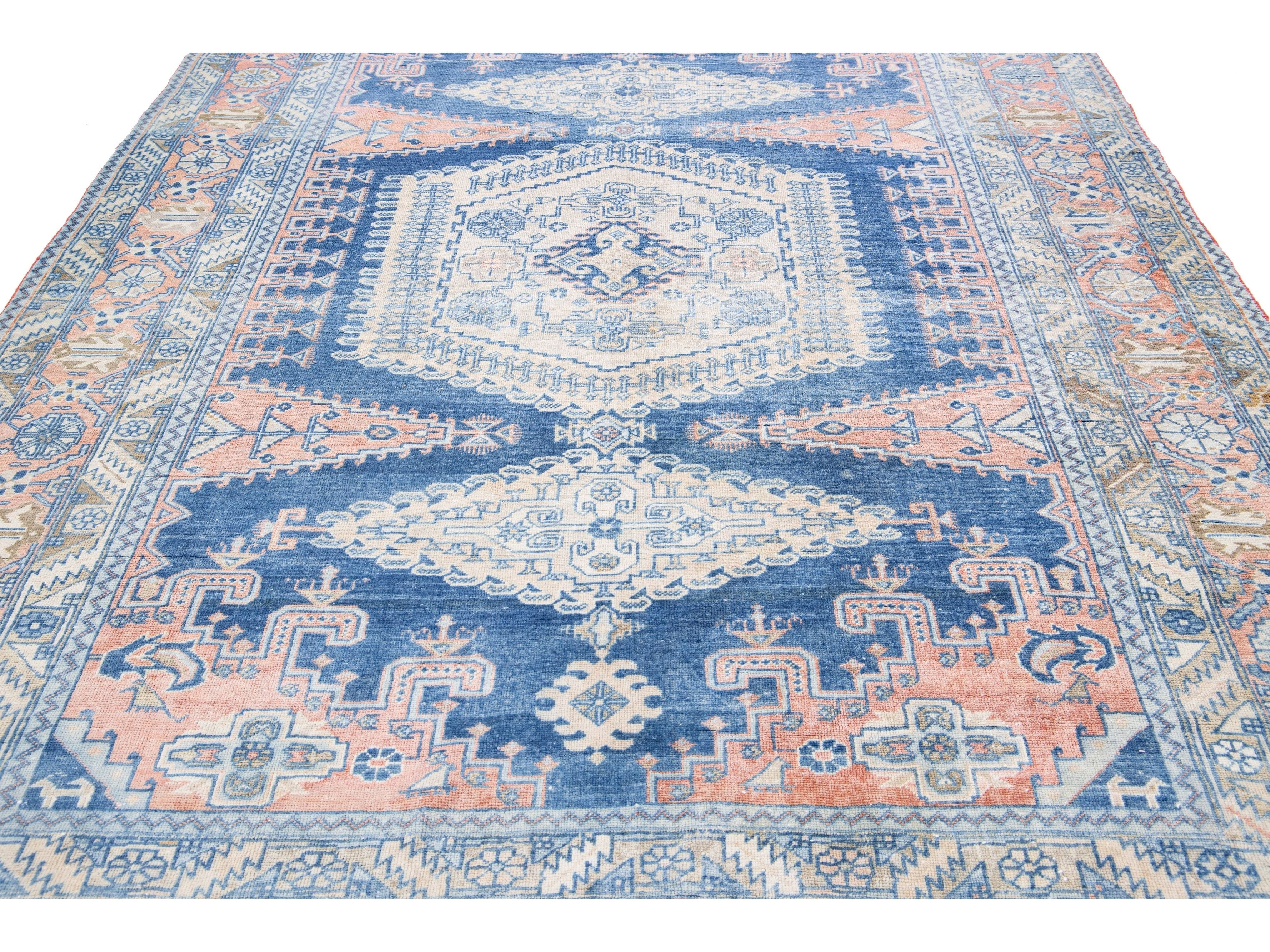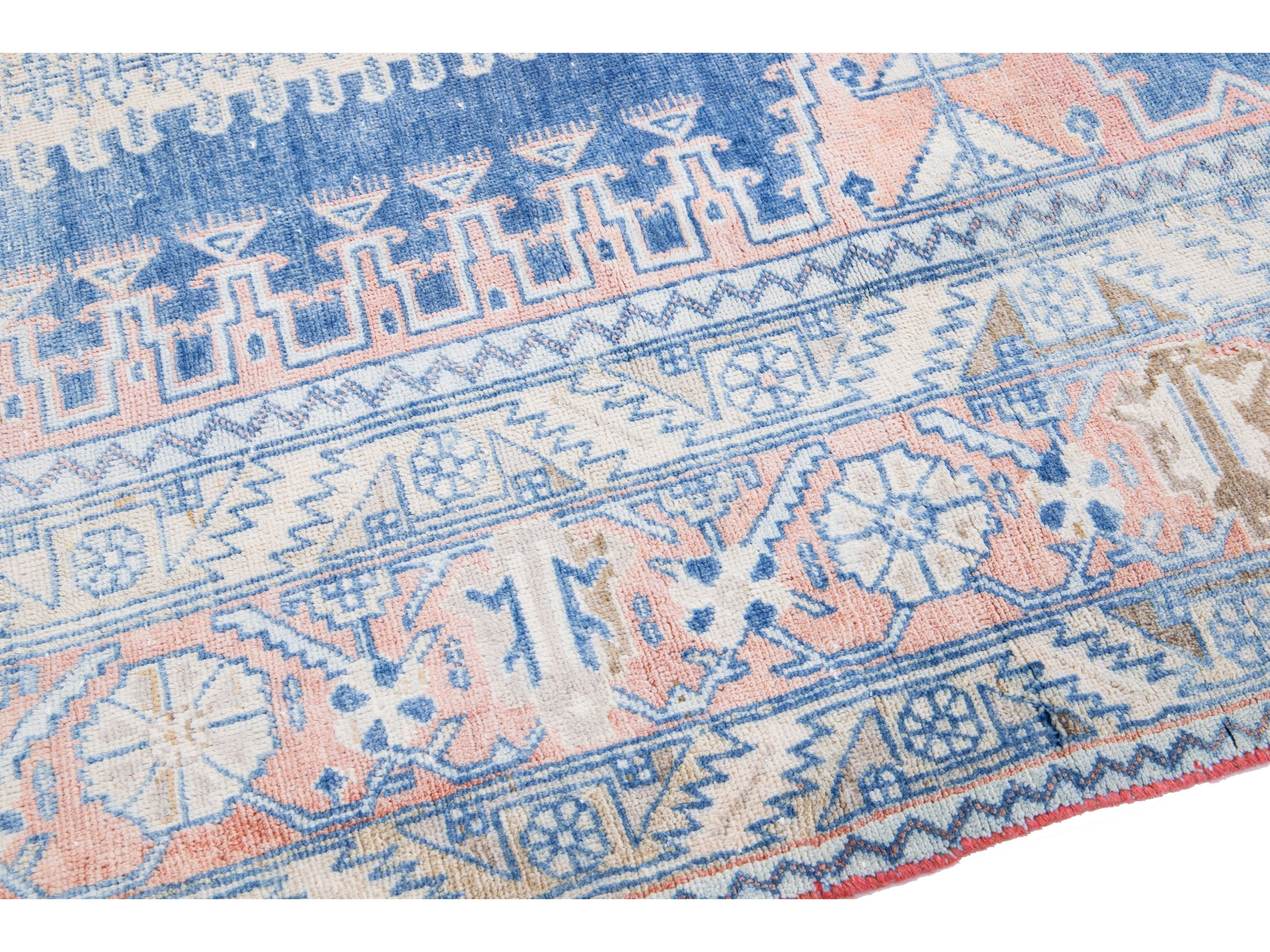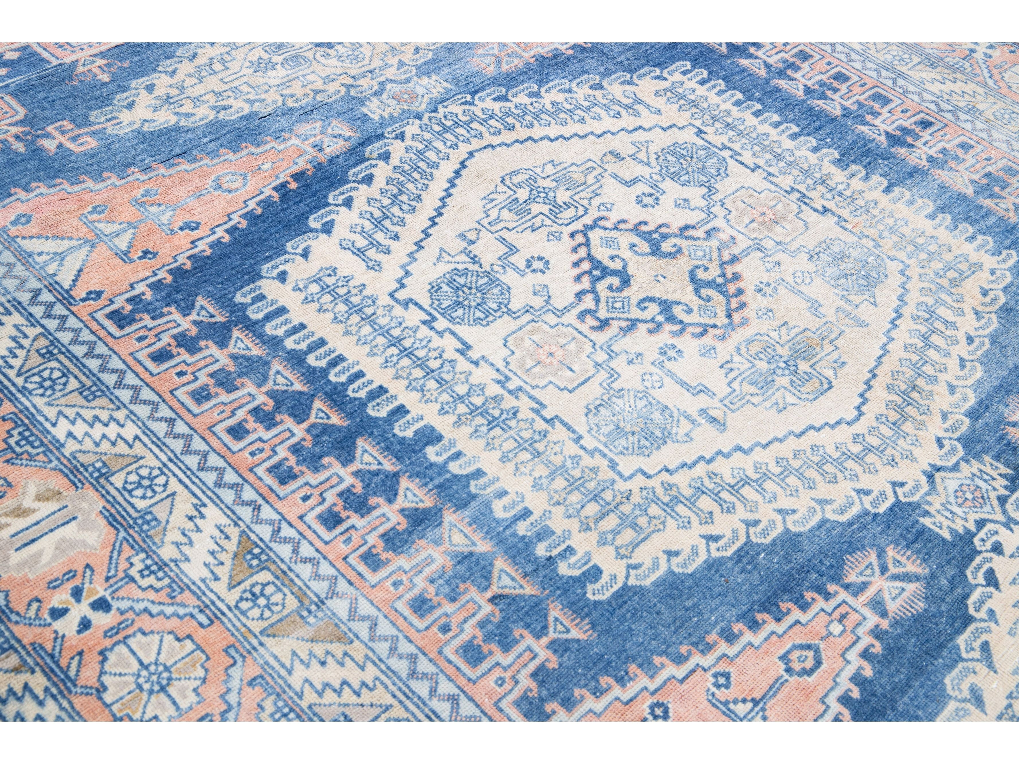 This handwoven Caucasian rug presents a hexagonal medallion flanked by stepped geometric motifs and framed by multiple patterned borders. Produced in the Caucasus during the early to mid-20th century, it is constructed with a wool pile on a wool foundation, reflecting the durable tribal weaving techniques of the region. The medallion structure and geometric ornamentation are defining features of this Caucasian tradition.
