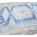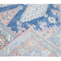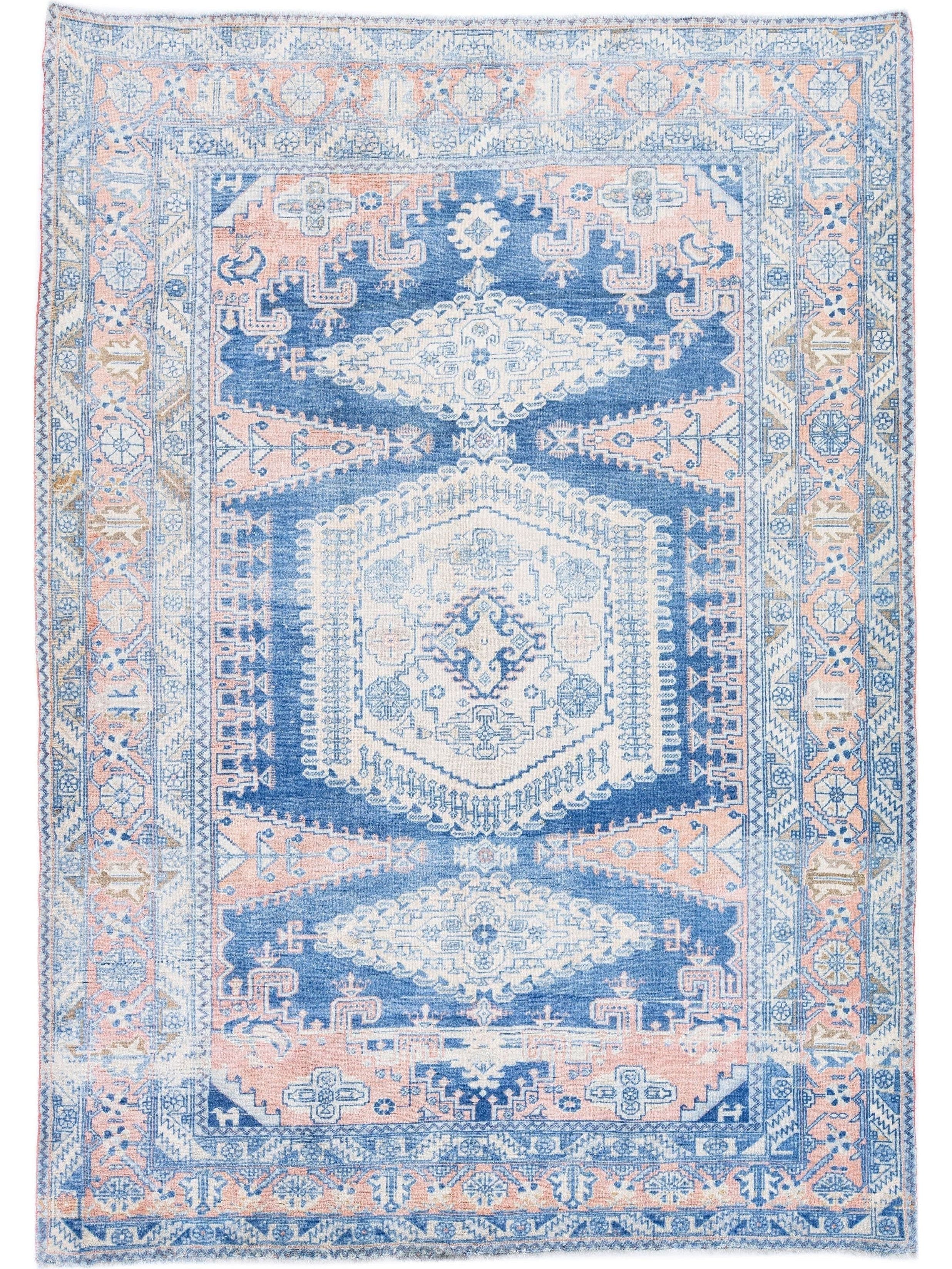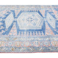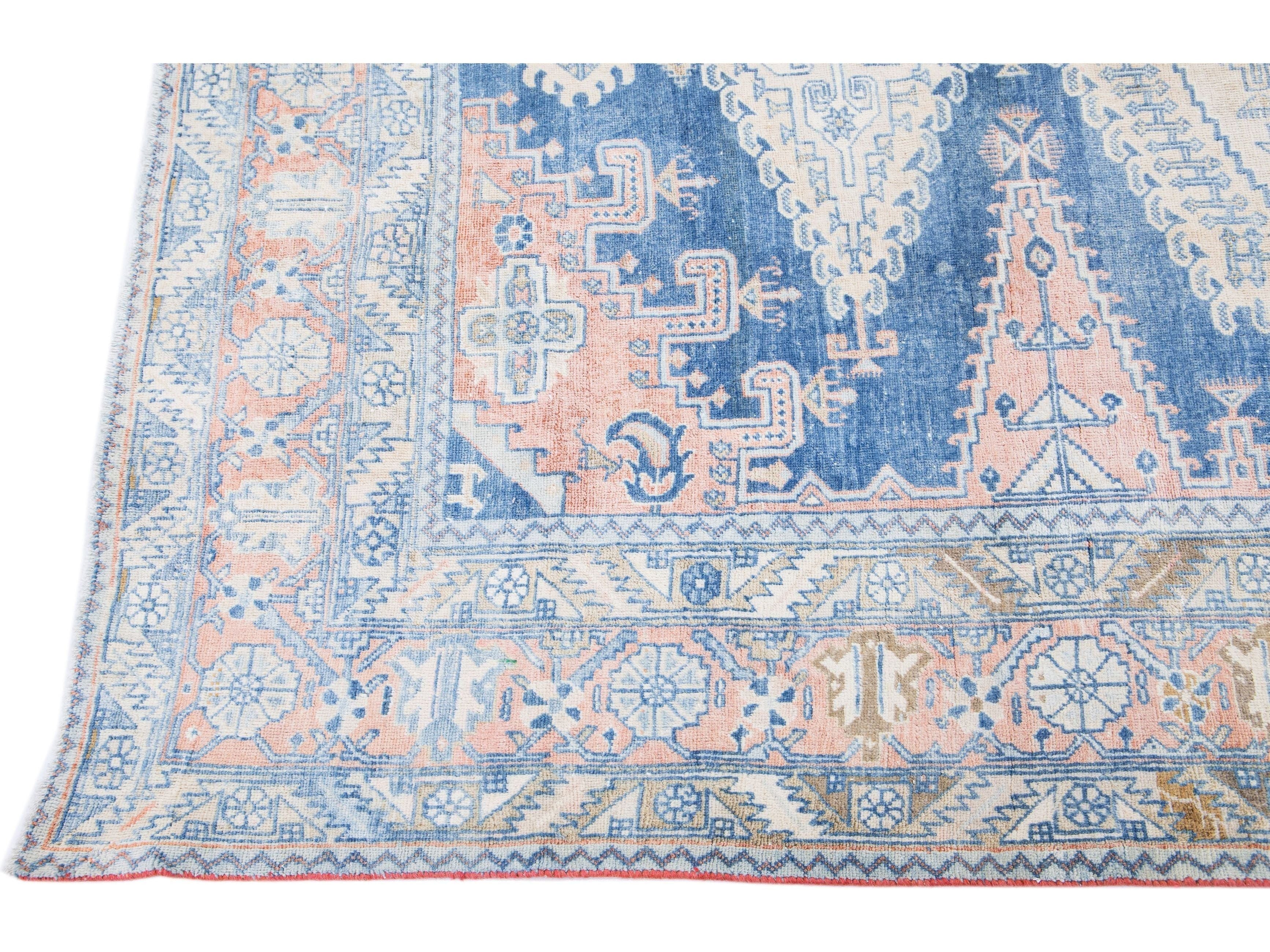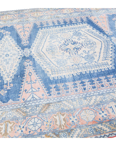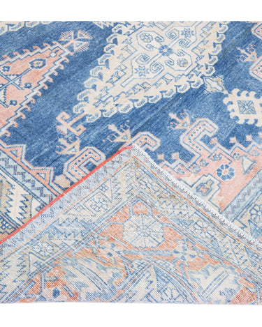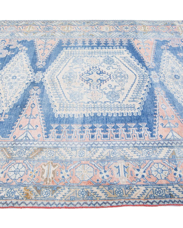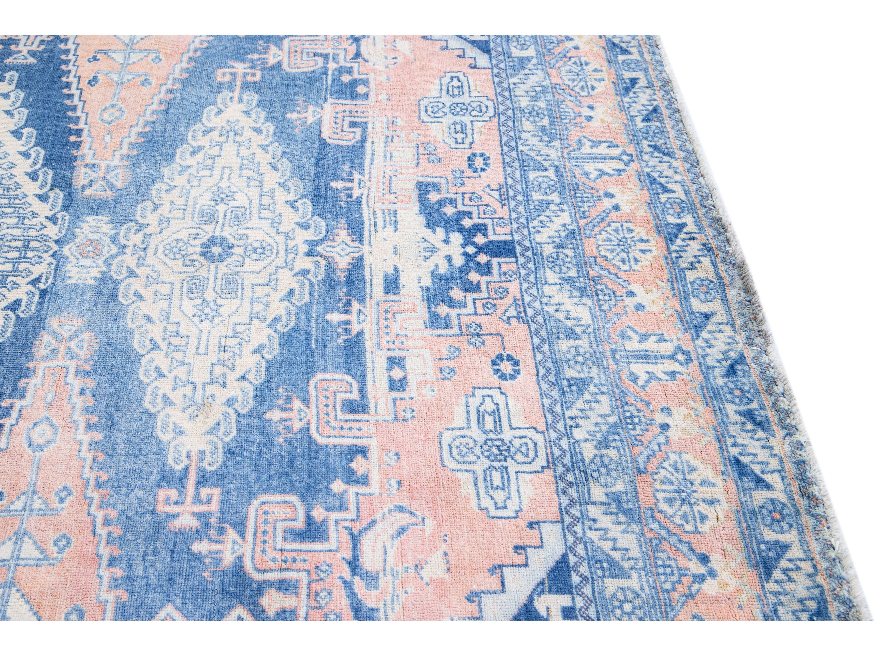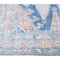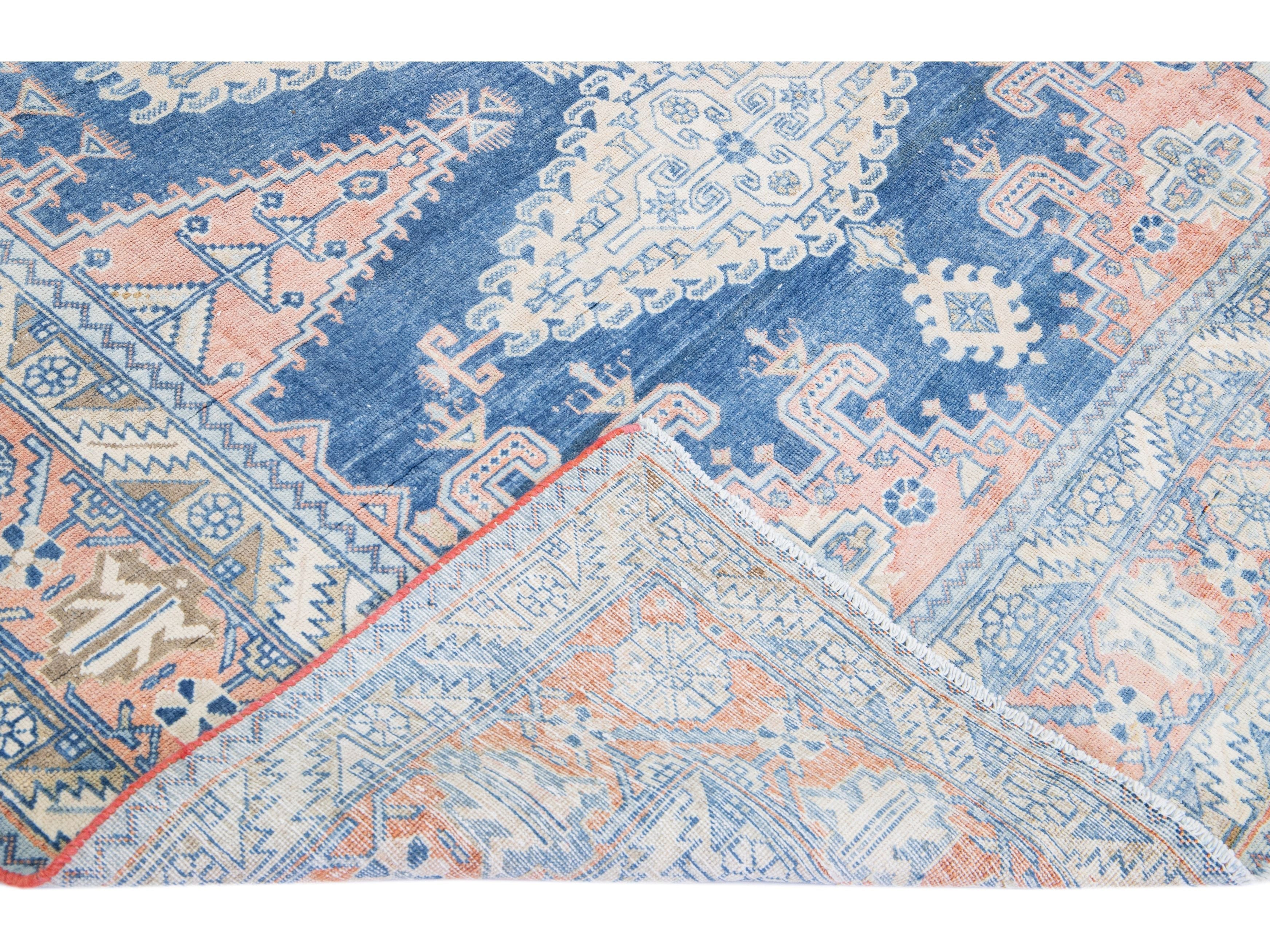 This handwoven Caucasian rug presents a hexagonal medallion flanked by stepped geometric motifs and framed by multiple patterned borders. Produced in the Caucasus during the early to mid-20th century, it is constructed with a wool pile on a wool foundation, reflecting the durable tribal weaving techniques of the region. The medallion structure and geometric ornamentation are defining features of this Caucasian tradition.