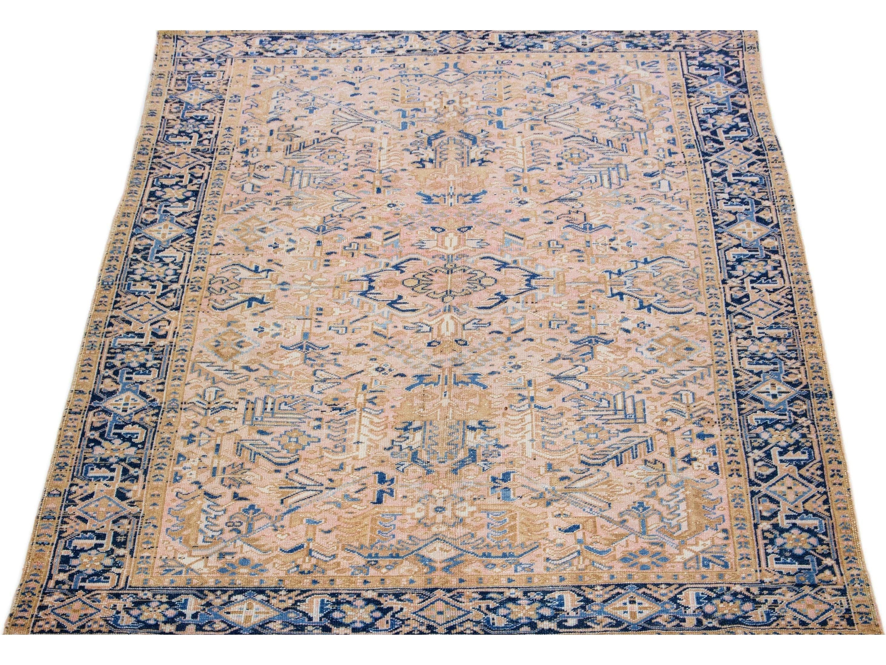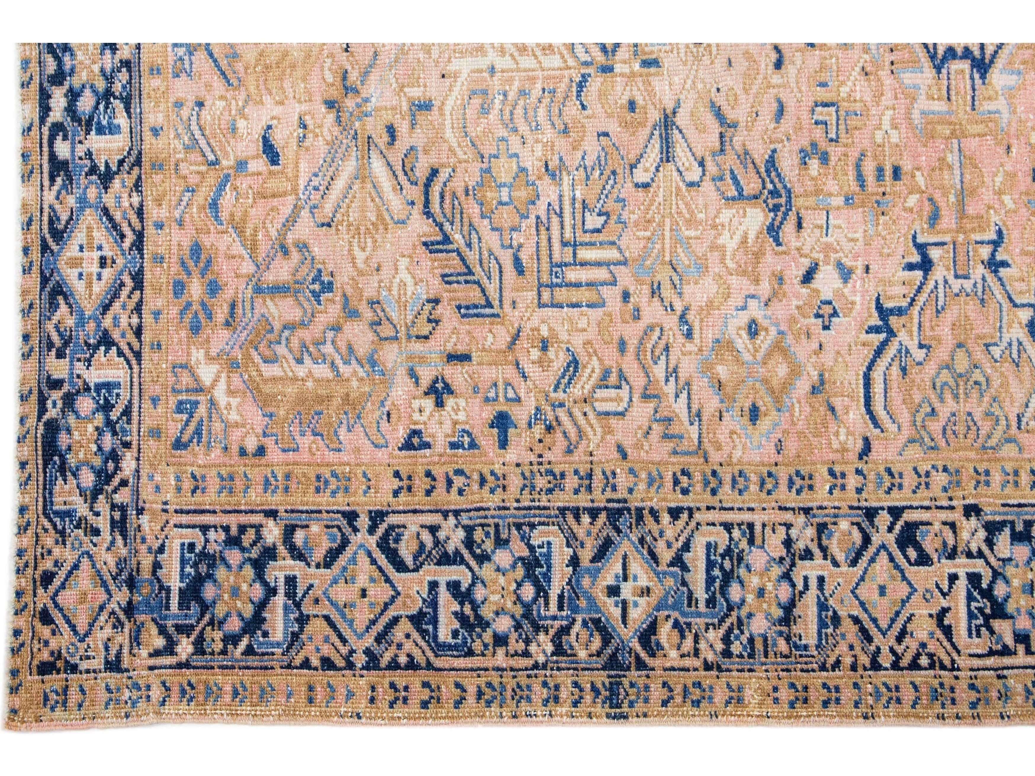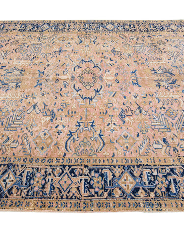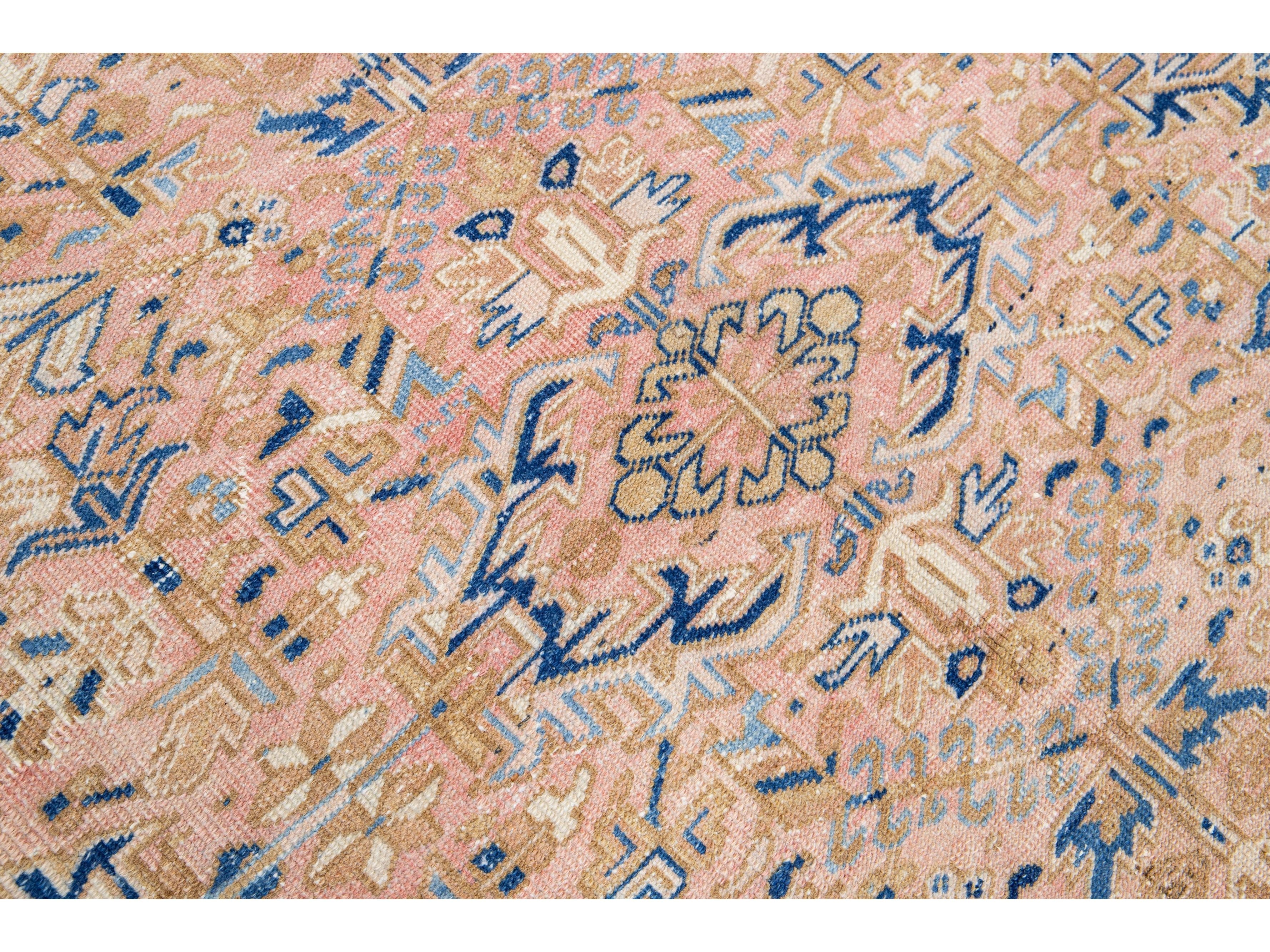 This handwoven Serapi rug features a central medallion with branching geometric motifs and an angular field framed by patterned borders. Produced in Northwest Iran in the late 19th to early 20th century, it is woven with a wool pile on a cotton foundation, representing the durable construction associated with Heriz-Serapi weaving. The large-scale design and structured layout are hallmarks of this tradition, which has maintained a lasting reputation for strength and artistry.