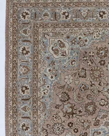Soft toned and feminine antique Persian rug with a field of blossoms in various pastel tones. Good condition, soft underfoot and safe for high traffic.