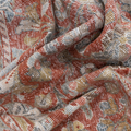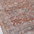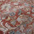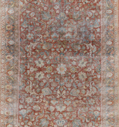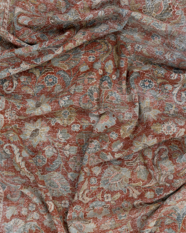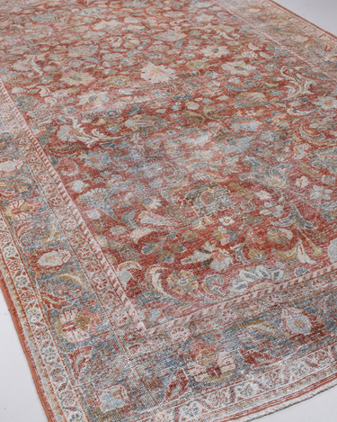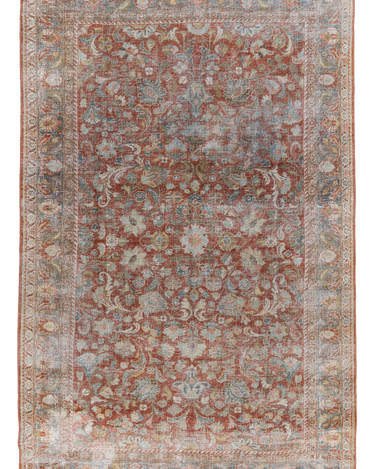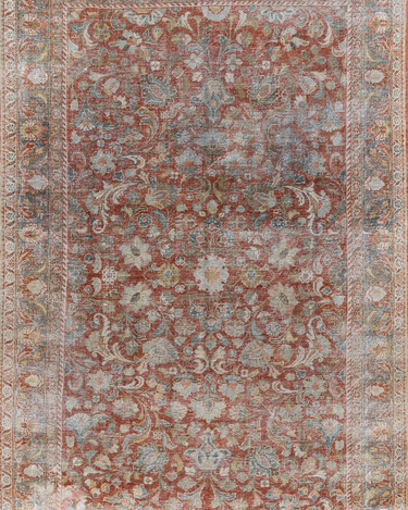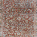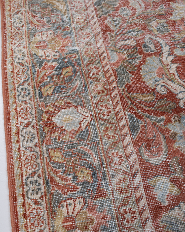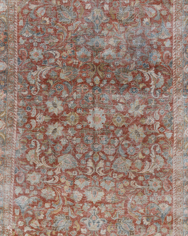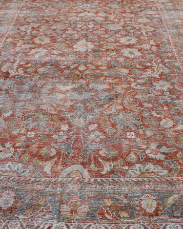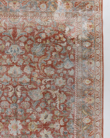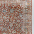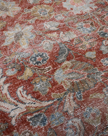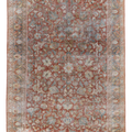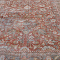 Antique Persian Mahal with classic coloration that been gently softened by a light antique washing and sun fading. A plethora of large scale whimsical flowers adorns the cheerful tomato toned field. The accent colors are brilliant jewel tones. A truly beautiful piece in a hard to find size.