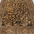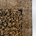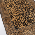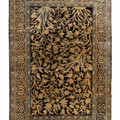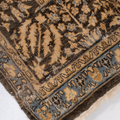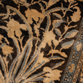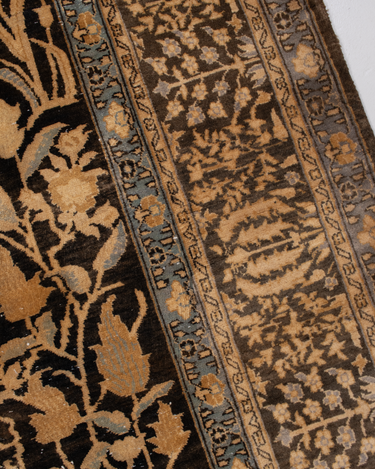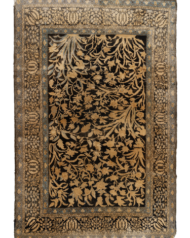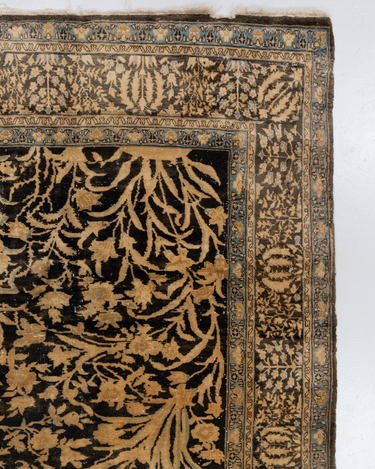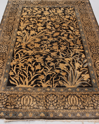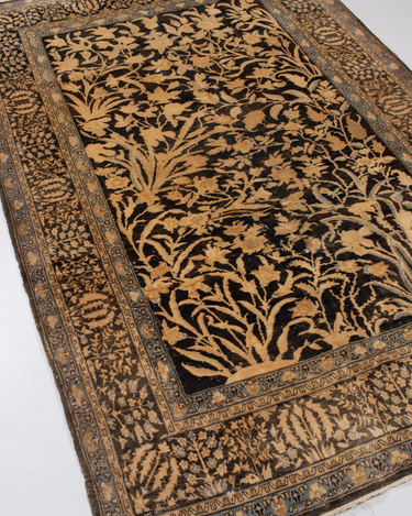This exquisite Persian rug originated from the city of Qum and is a gorgeous example of the finely woven rugs produced there. It features a deep majestic blue pile with a golden tree of life design. It is in original condition with a lovely soft pile.