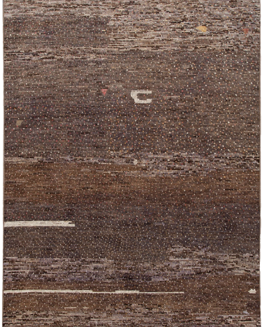 Beautiful Moroccan-style hand-knotted wool rug with a Brownfield. This Rug has multi-color accents in a gorgeous all-over abstract geometric design.