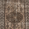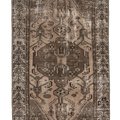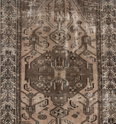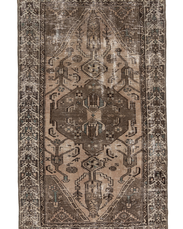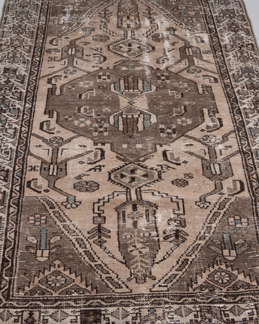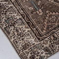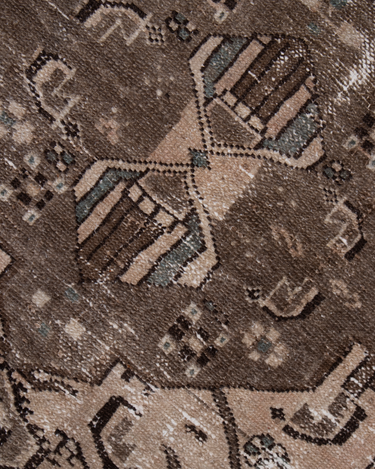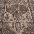 This handwoven Heriz rug features a bold central medallion flanked by angular motifs within a structured field. Produced in Northwest Iran during the mid-20th century, it is constructed with a wool pile on a cotton foundation, exemplifying the durable village weaving practices of the region. The geometric design and strong medallion format are characteristic of the Heriz tradition, which has been maintained by generations of weavers in northern Iran.