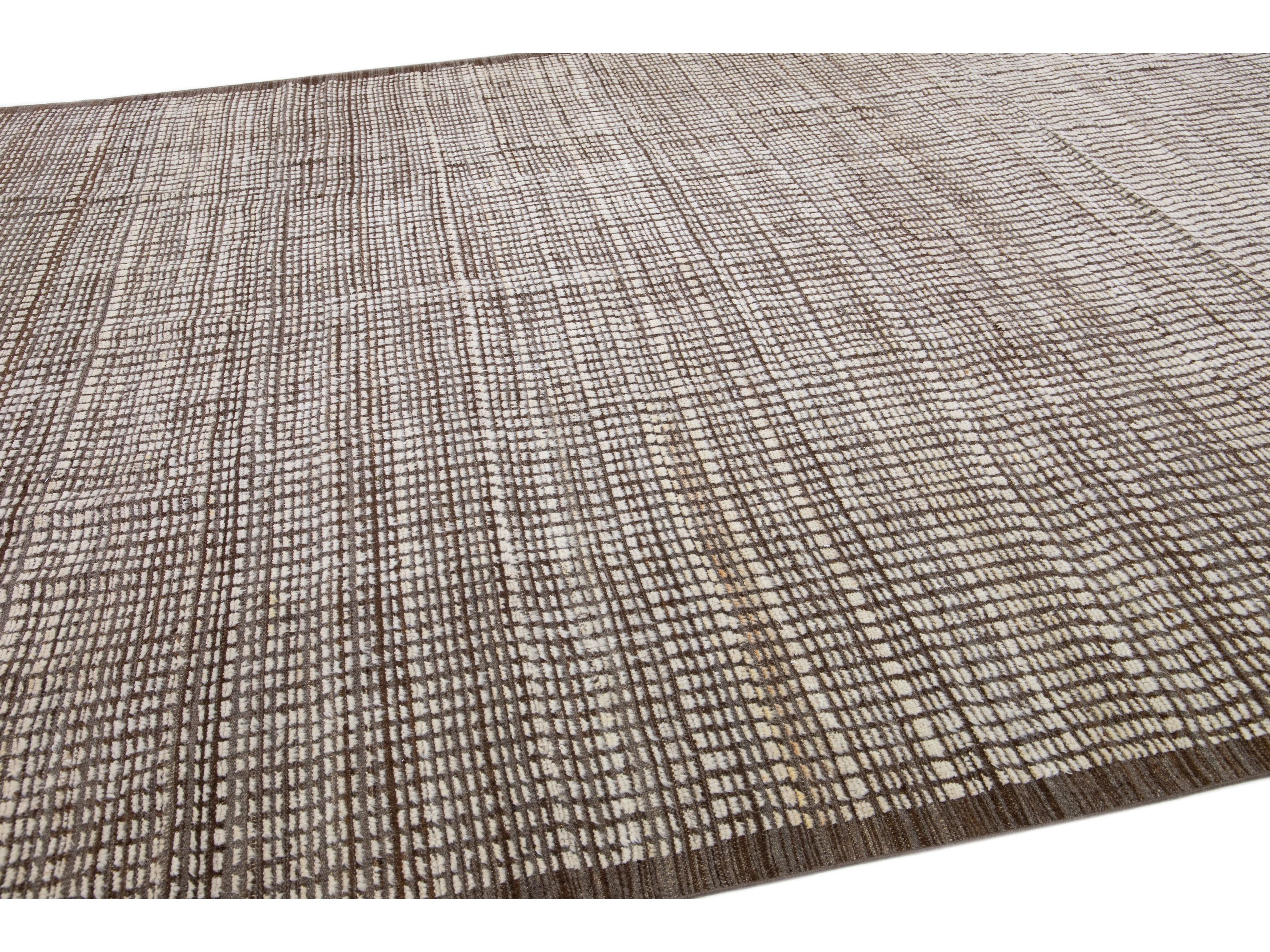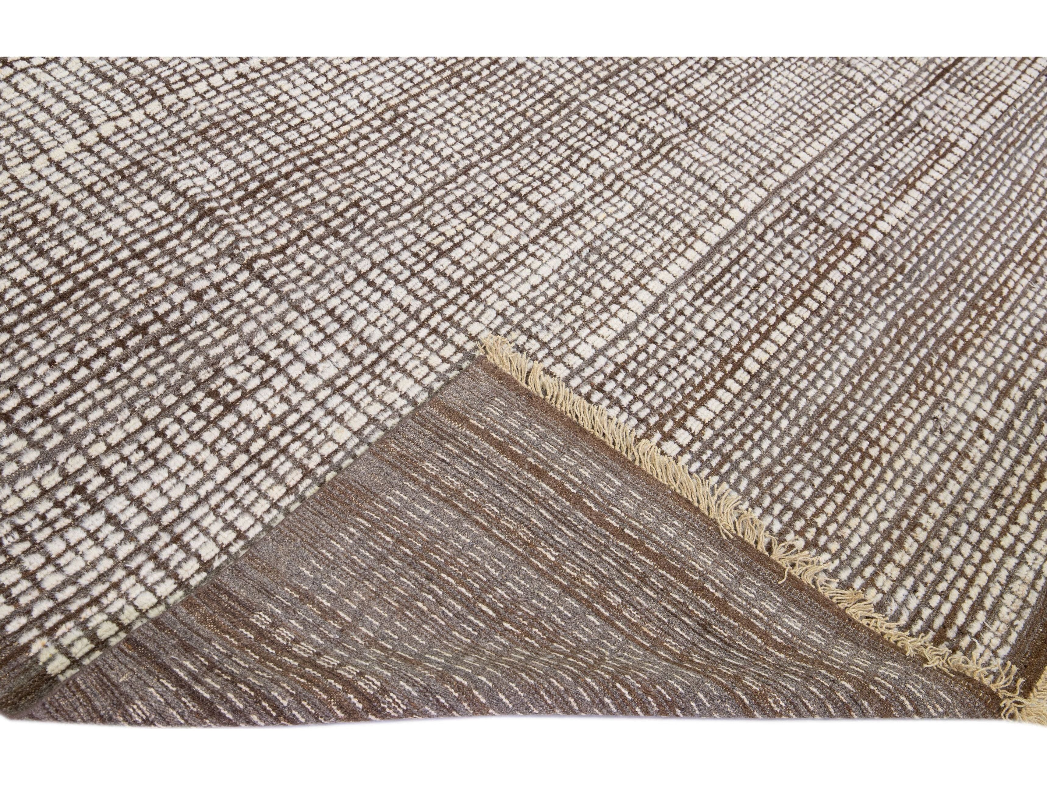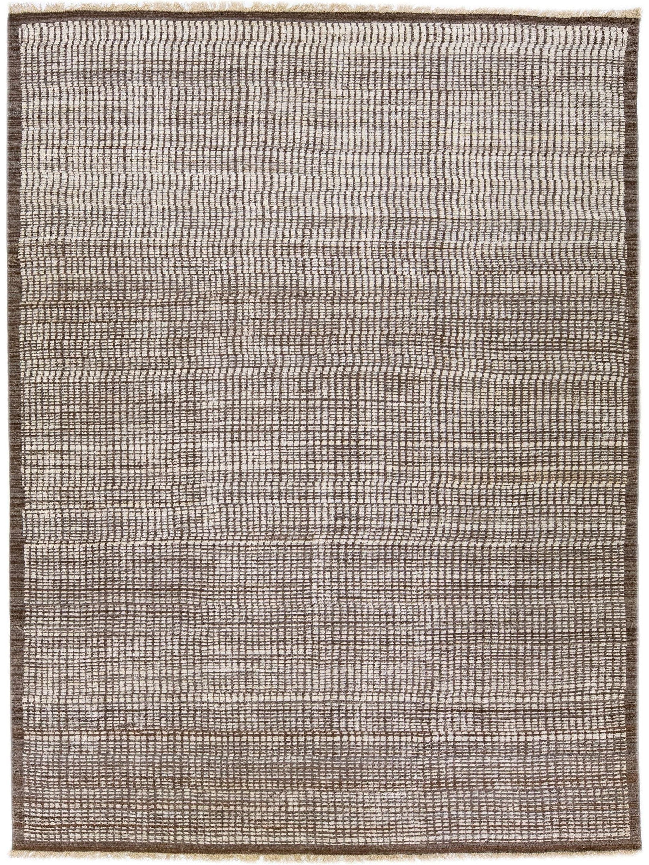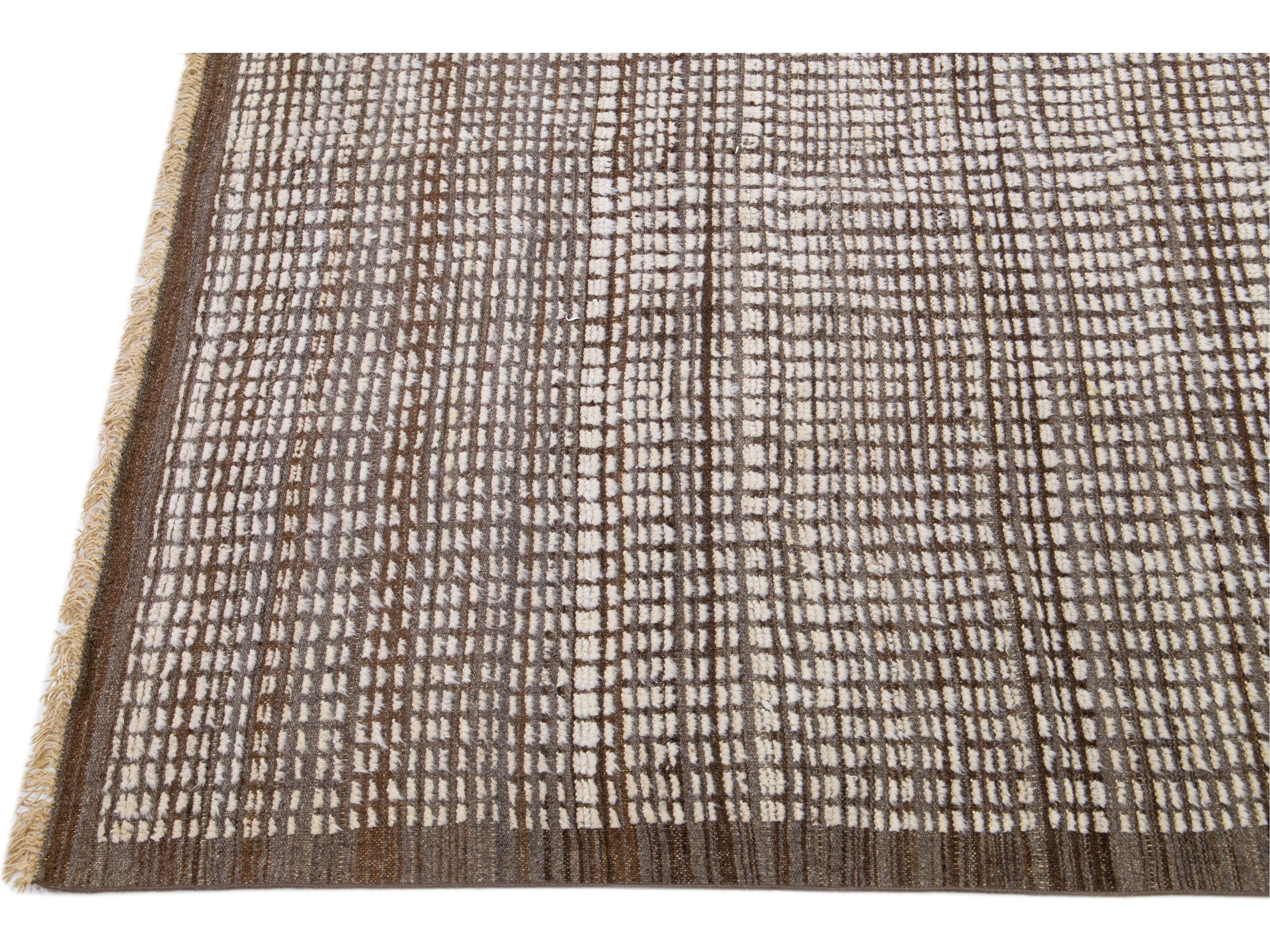 Beautiful modern Moroccan style hand-knotted wool rug with a brown field. This piece has a gorgeous subtle geometric pattern design.