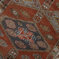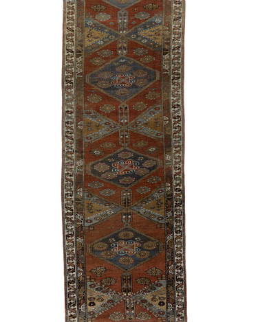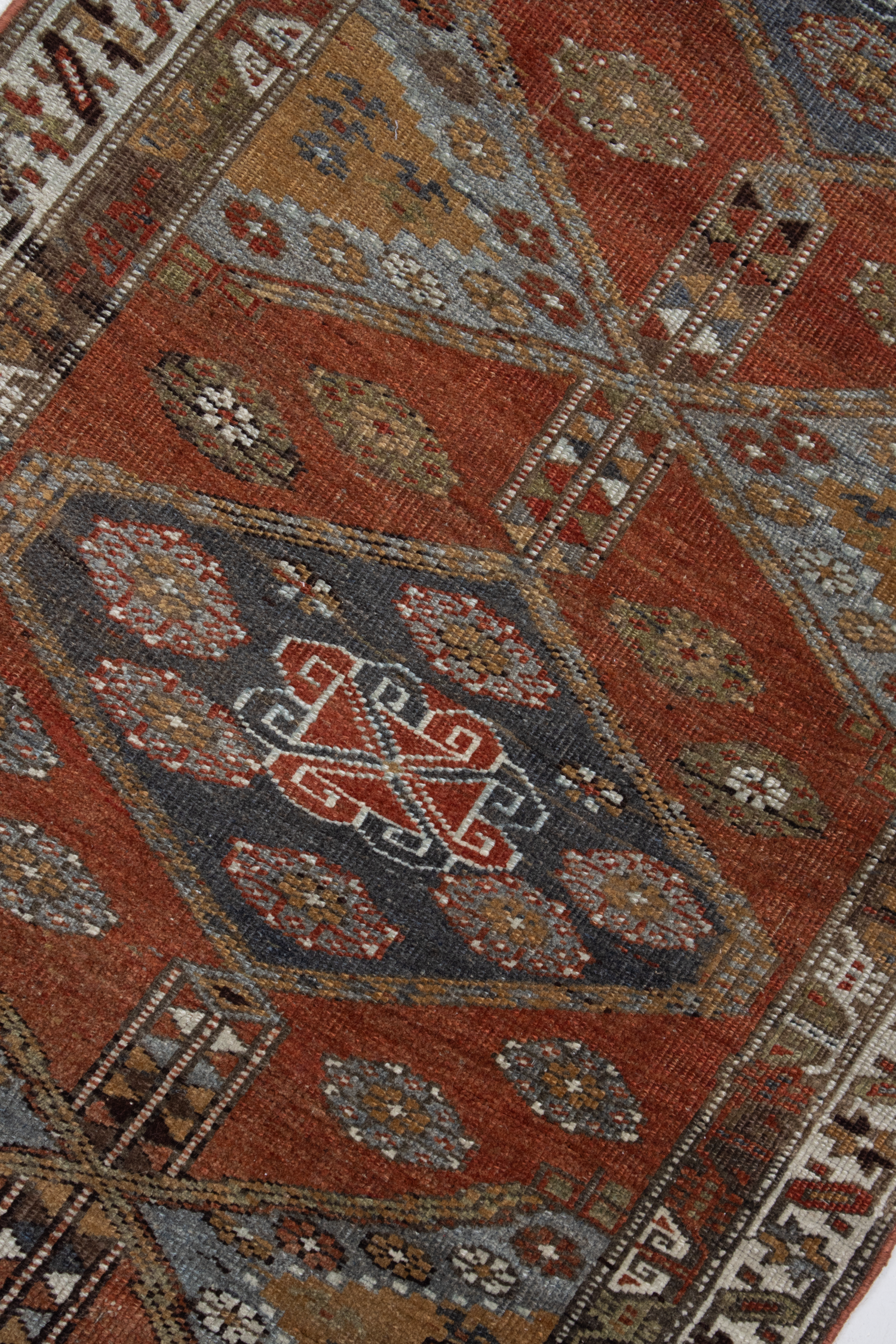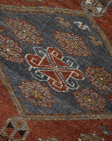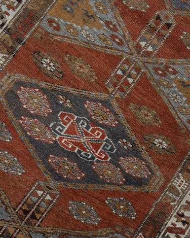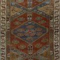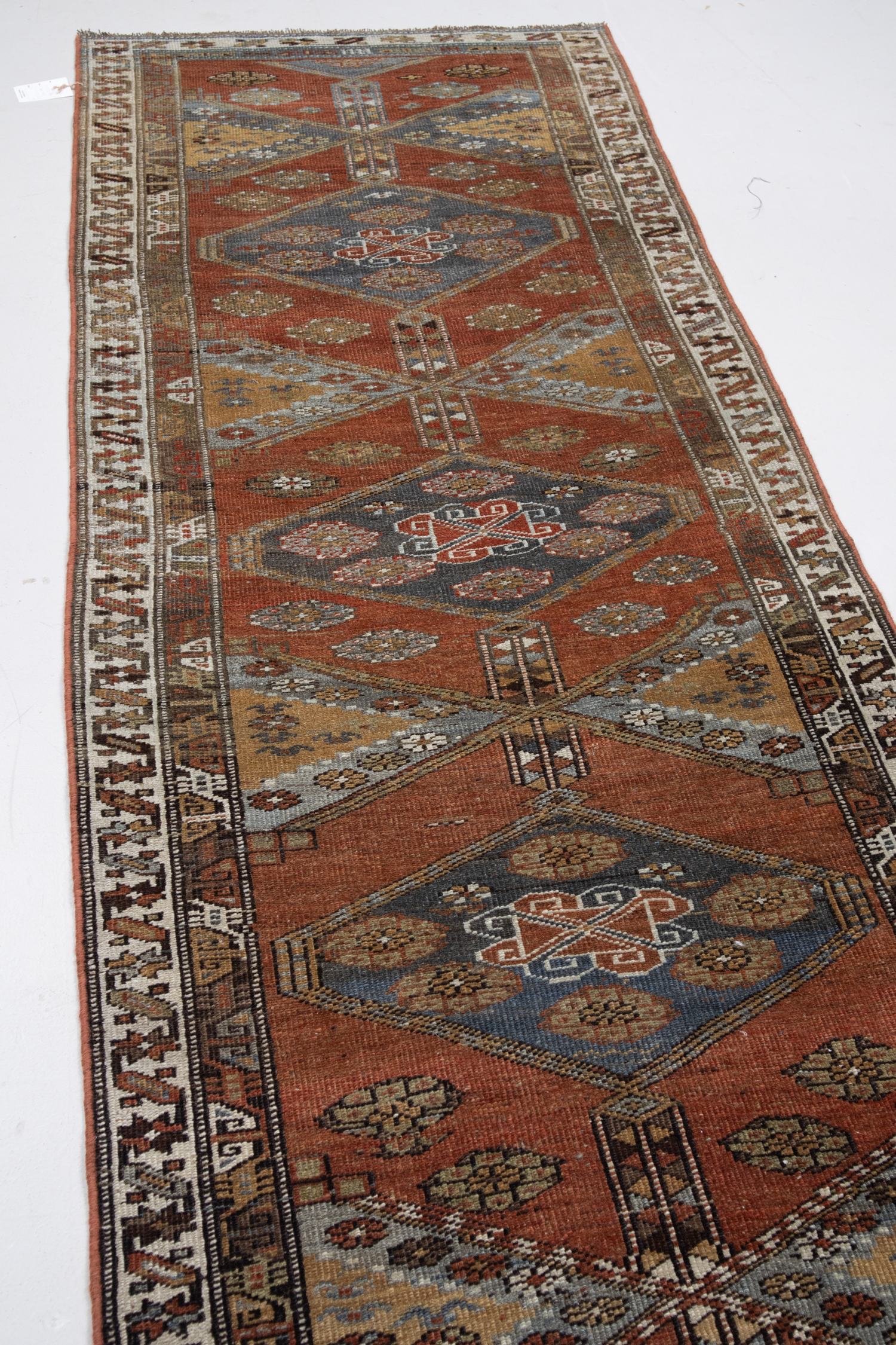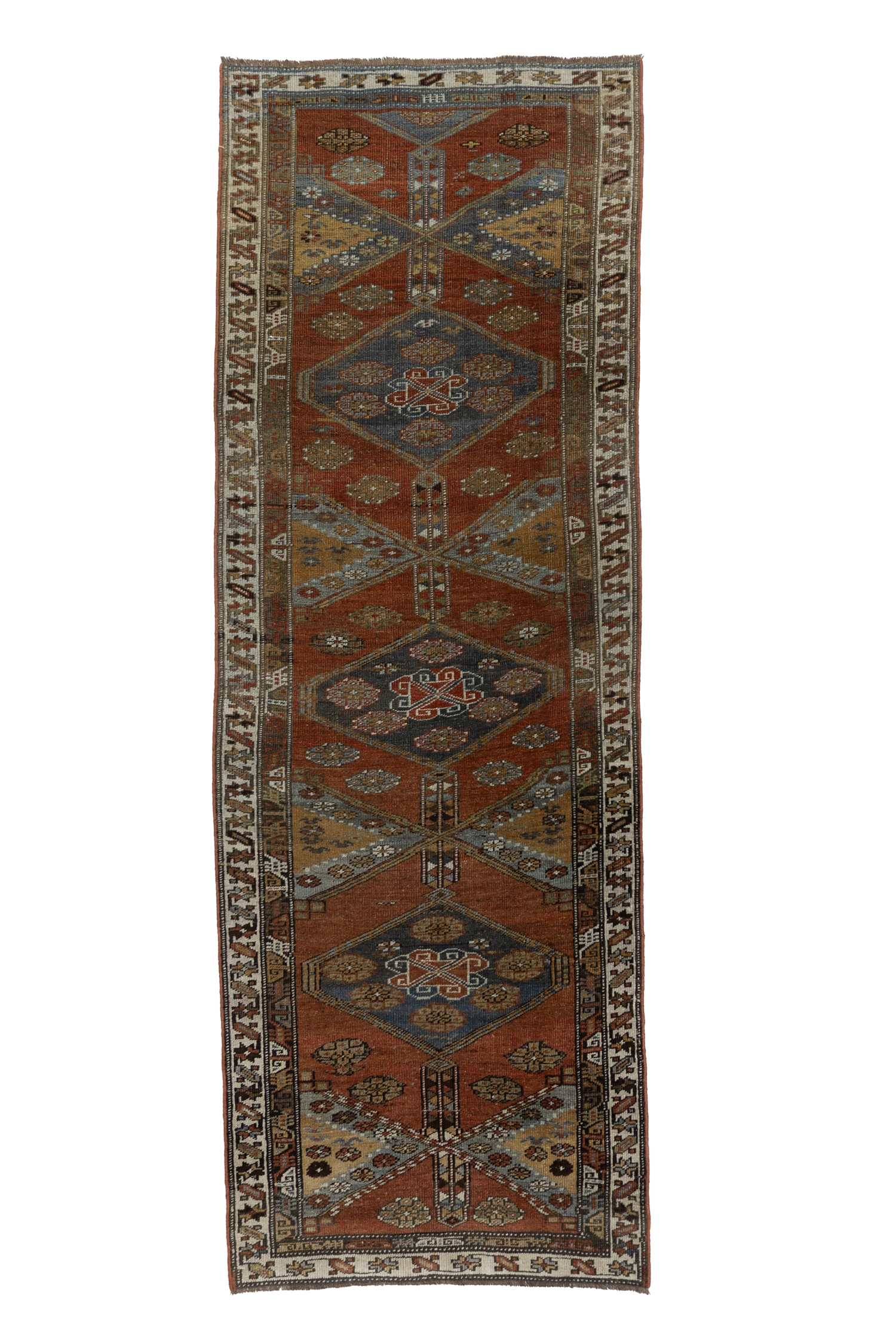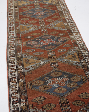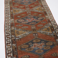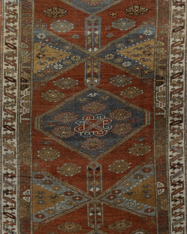This handwoven Kazak runner was produced in the South Caucasus in the late 19th century. It is constructed with a wool pile on a traditional foundation, reflecting the craftsmanship of the region. The design features a series of hooked diamond medallions arranged along the central field, flanked by stylized rosettes and tribal motifs. A narrow border frames the composition with repeating geometric elements, characteristic of Kazak and Karabagh weaving traditions.