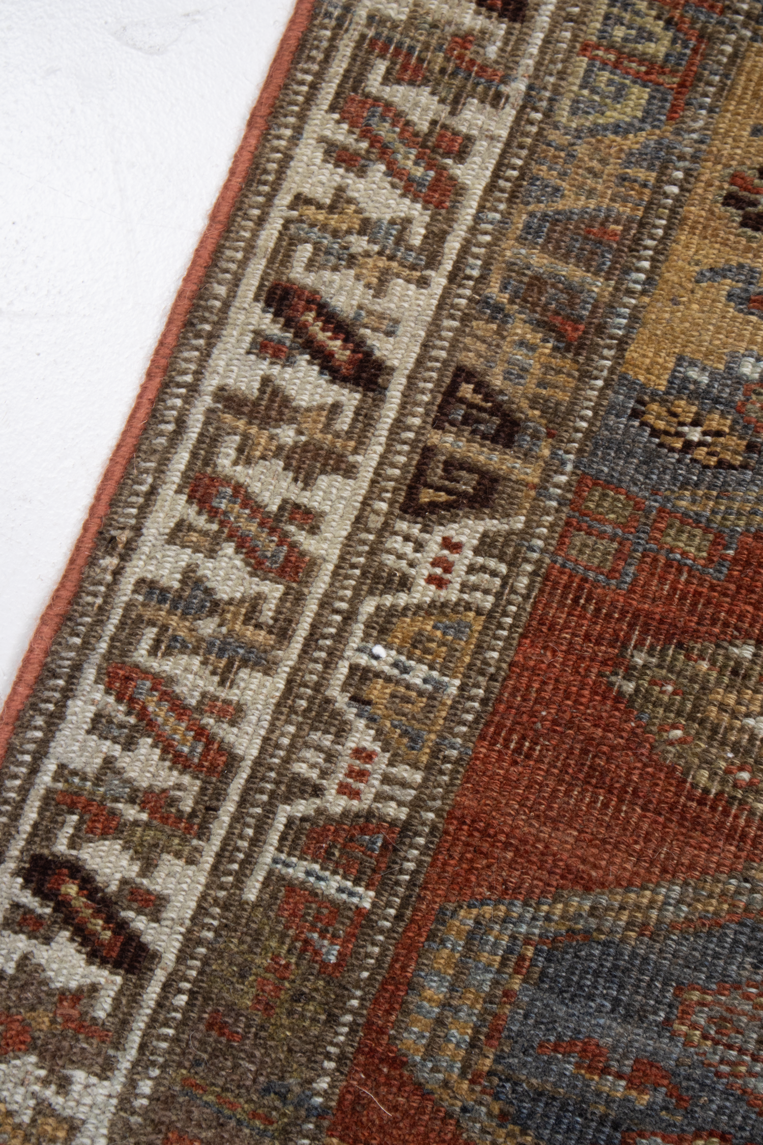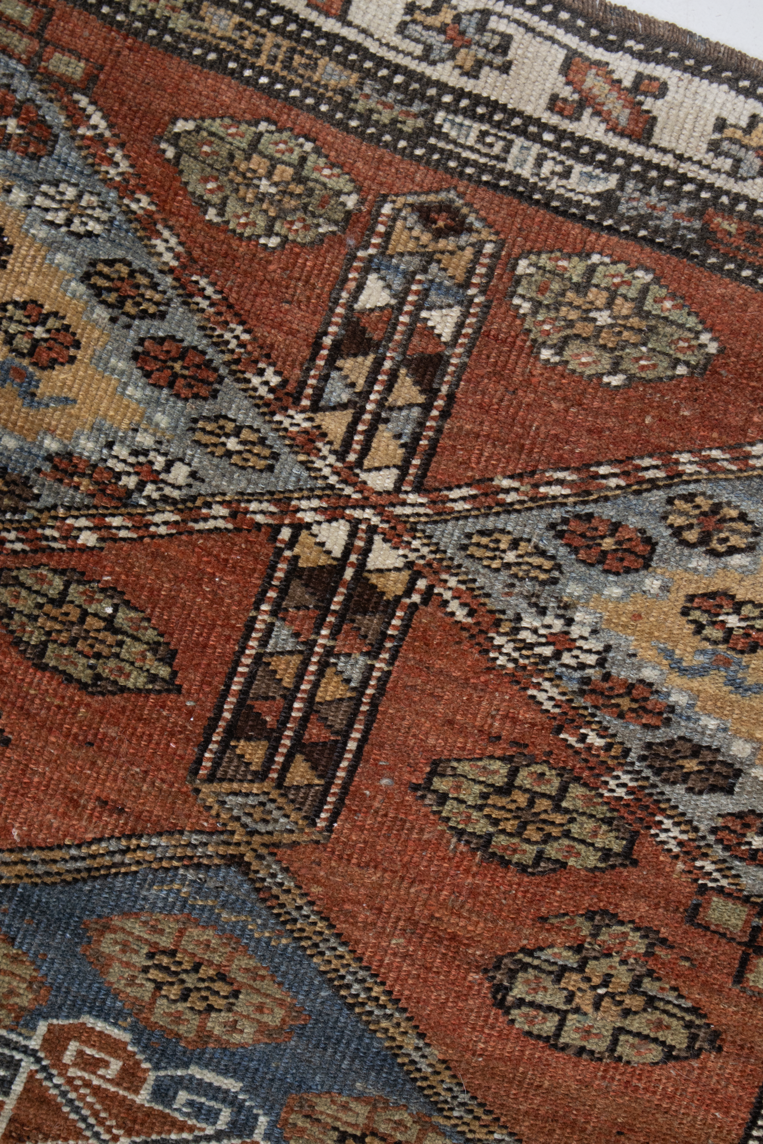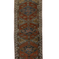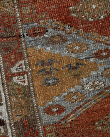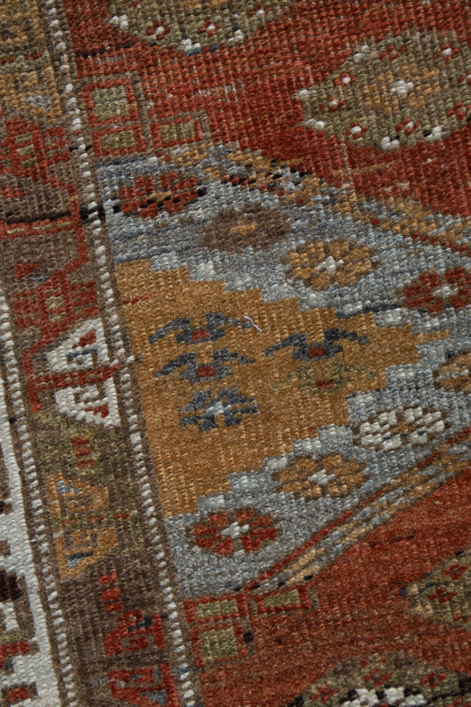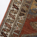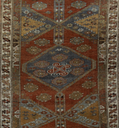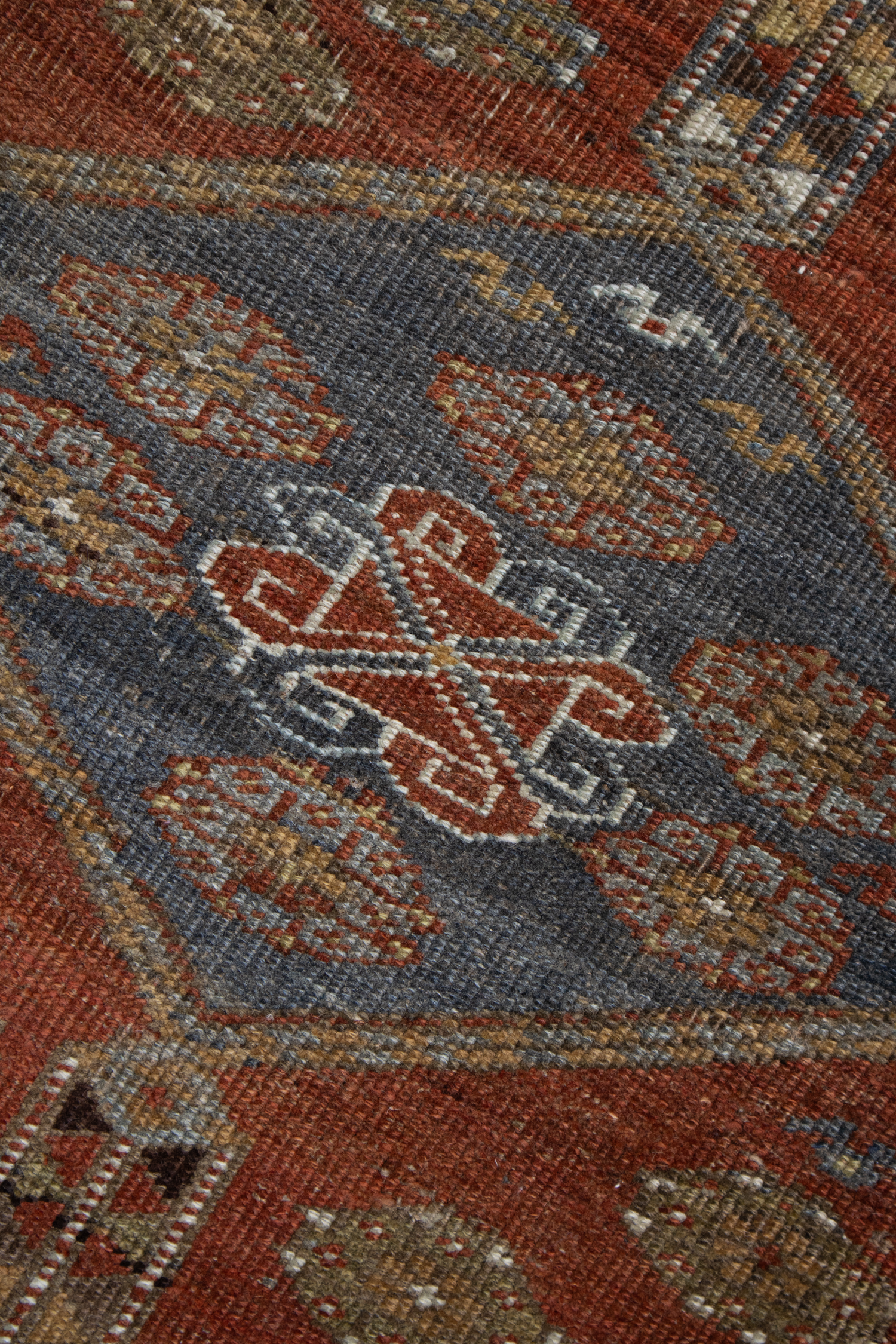 This handwoven Kazak runner was produced in the South Caucasus in the late 19th century. It is constructed with a wool pile on a traditional foundation, reflecting the craftsmanship of the region. The design features a series of hooked diamond medallions arranged along the central field, flanked by stylized rosettes and tribal motifs. A narrow border frames the composition with repeating geometric elements, characteristic of Kazak and Karabagh weaving traditions.