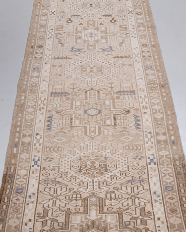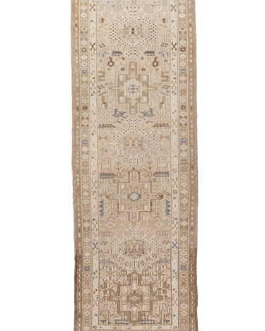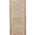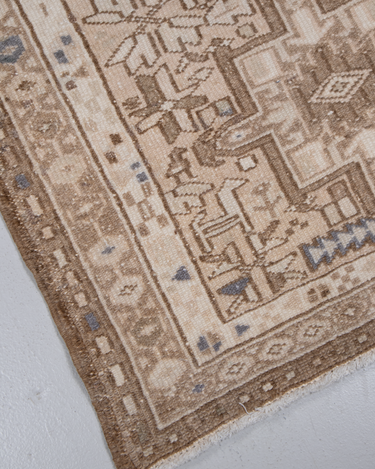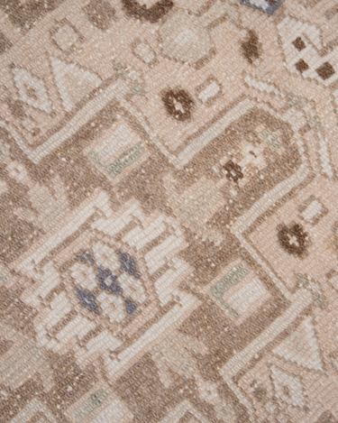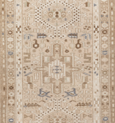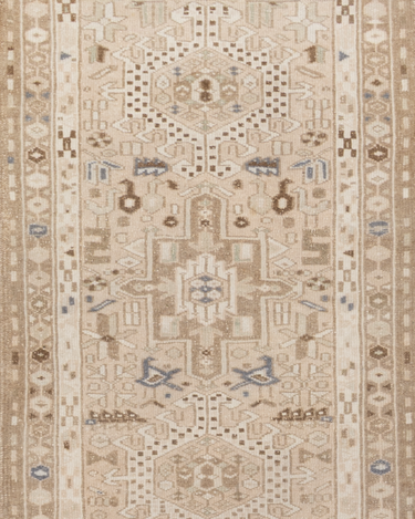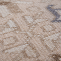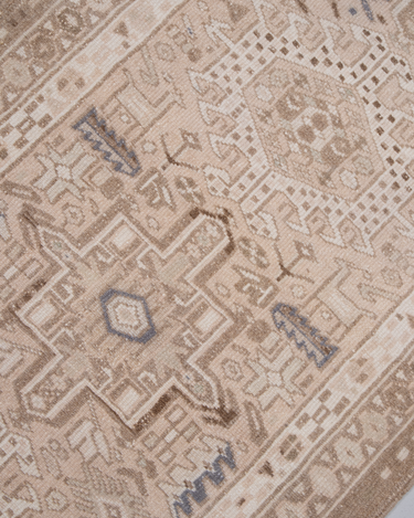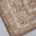 This handwoven Mid Century rug features a striking geometric medallion pattern. Woven with fine wool, its soft neutral color palette and symbolic designs reflect the artistry of the Caucasus & Anatolian regions.