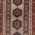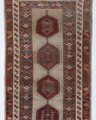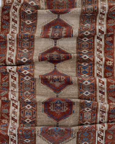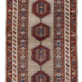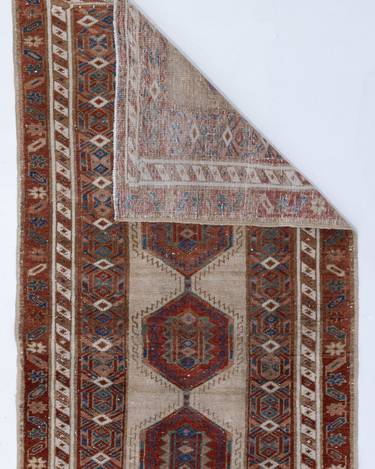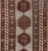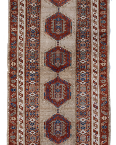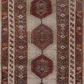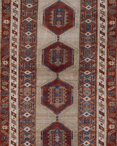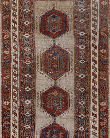 Elegant and simple, this early 20th century camel Serab has a traditional geometric center and classic colors. High knot count with well structured, dense weaving. Heavy weight and sturdy for high traffic areas. The colors are simple at first glance but on closer study, we love seeing how the blue changes to a more jewel toned emerald color.