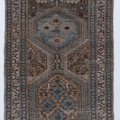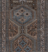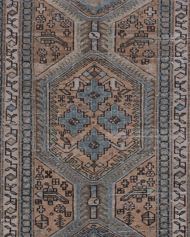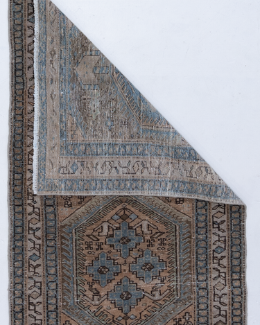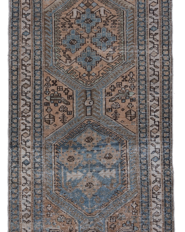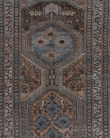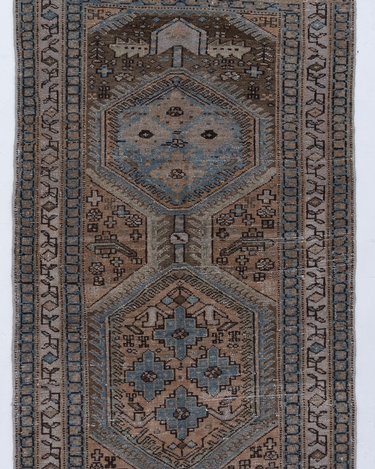 Vintage Persian runner in a beautiful color scheme of warm but faded earthy tones and a contrasting blue. Safe for high traffic areas with gorgeous wear.