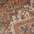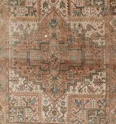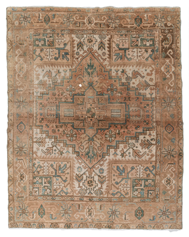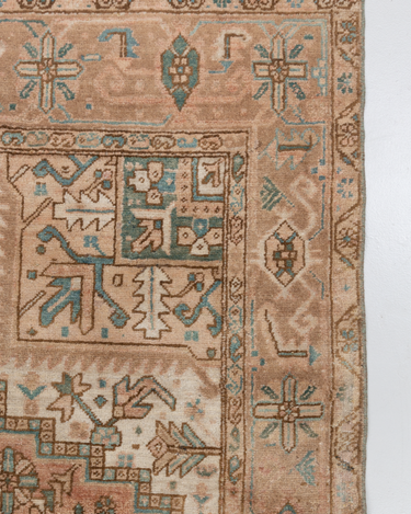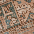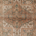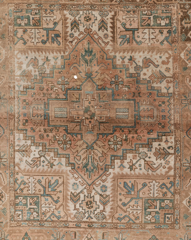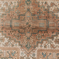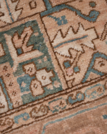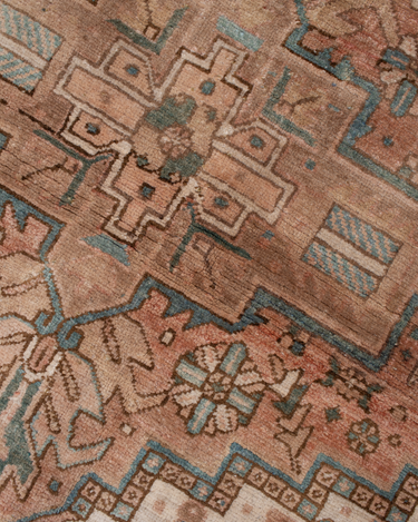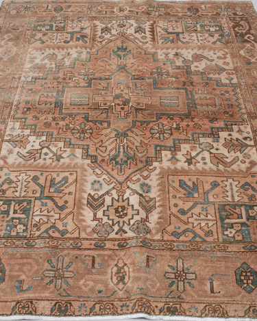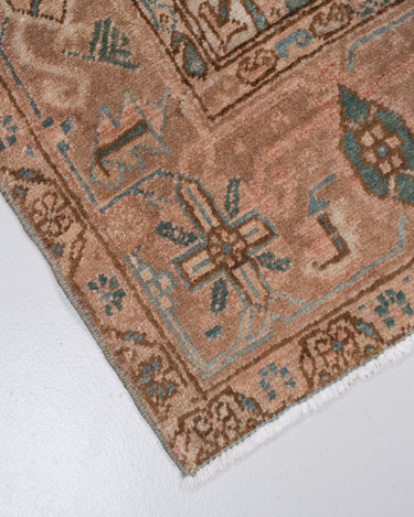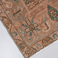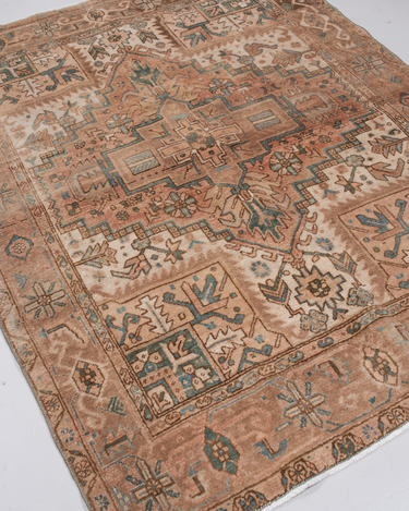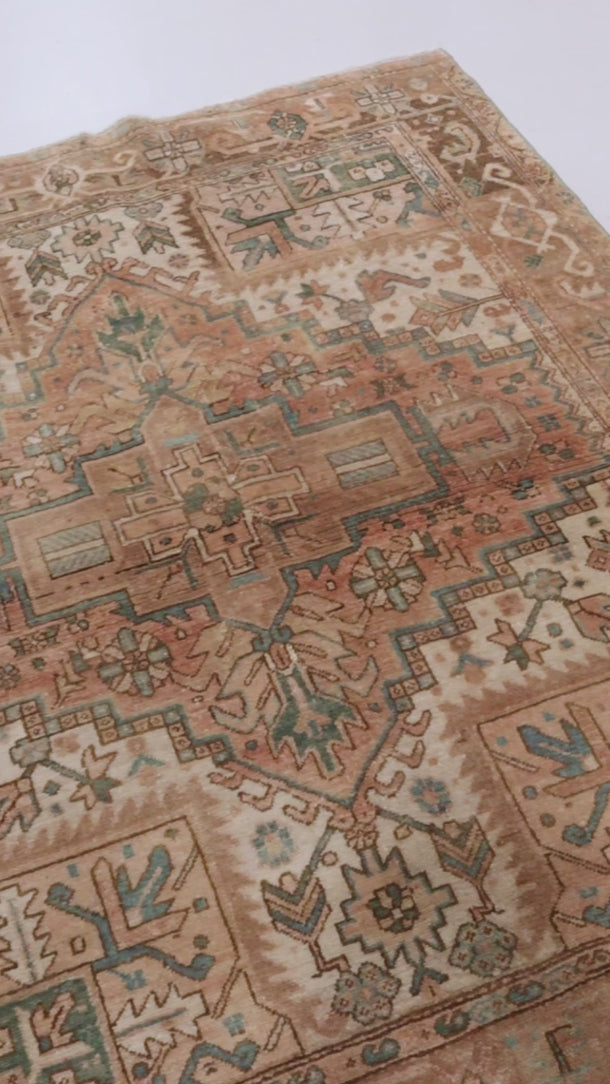 This is an authentic Vintage Persian Heriz scatter rug in a hard-to-find size. The unique color palette of soft rose tones, blue-green tones, and a subtle center medallion is ideal for those looking for a rug native to the Heriz region. It is well-preserved, making it a rare find.