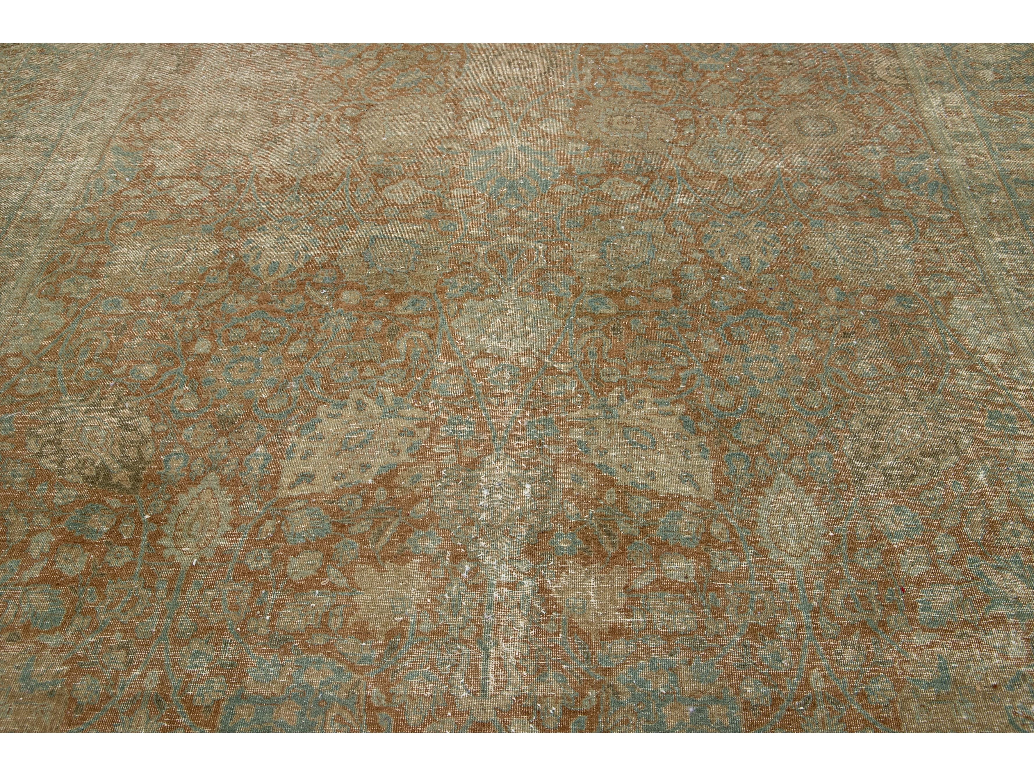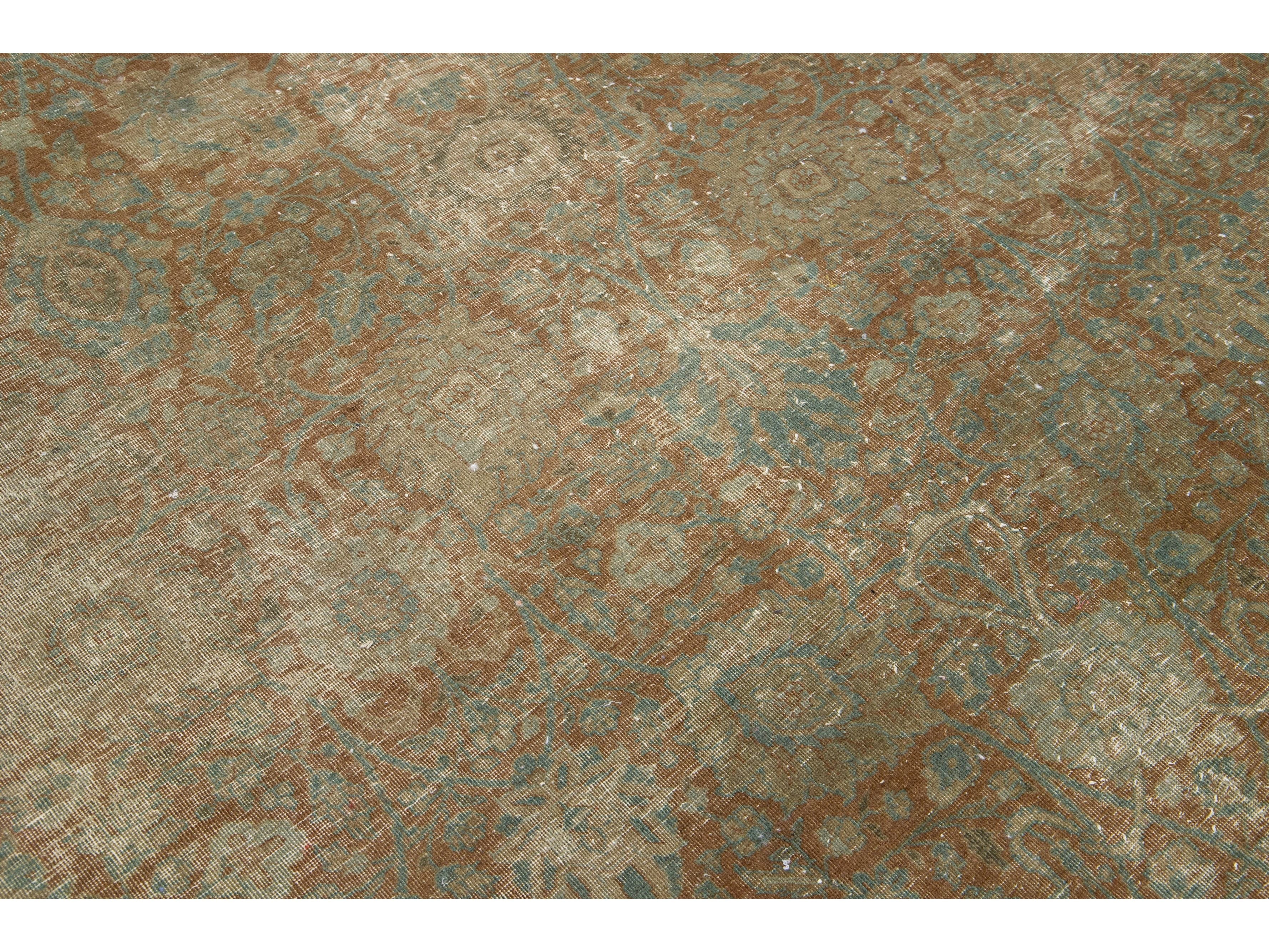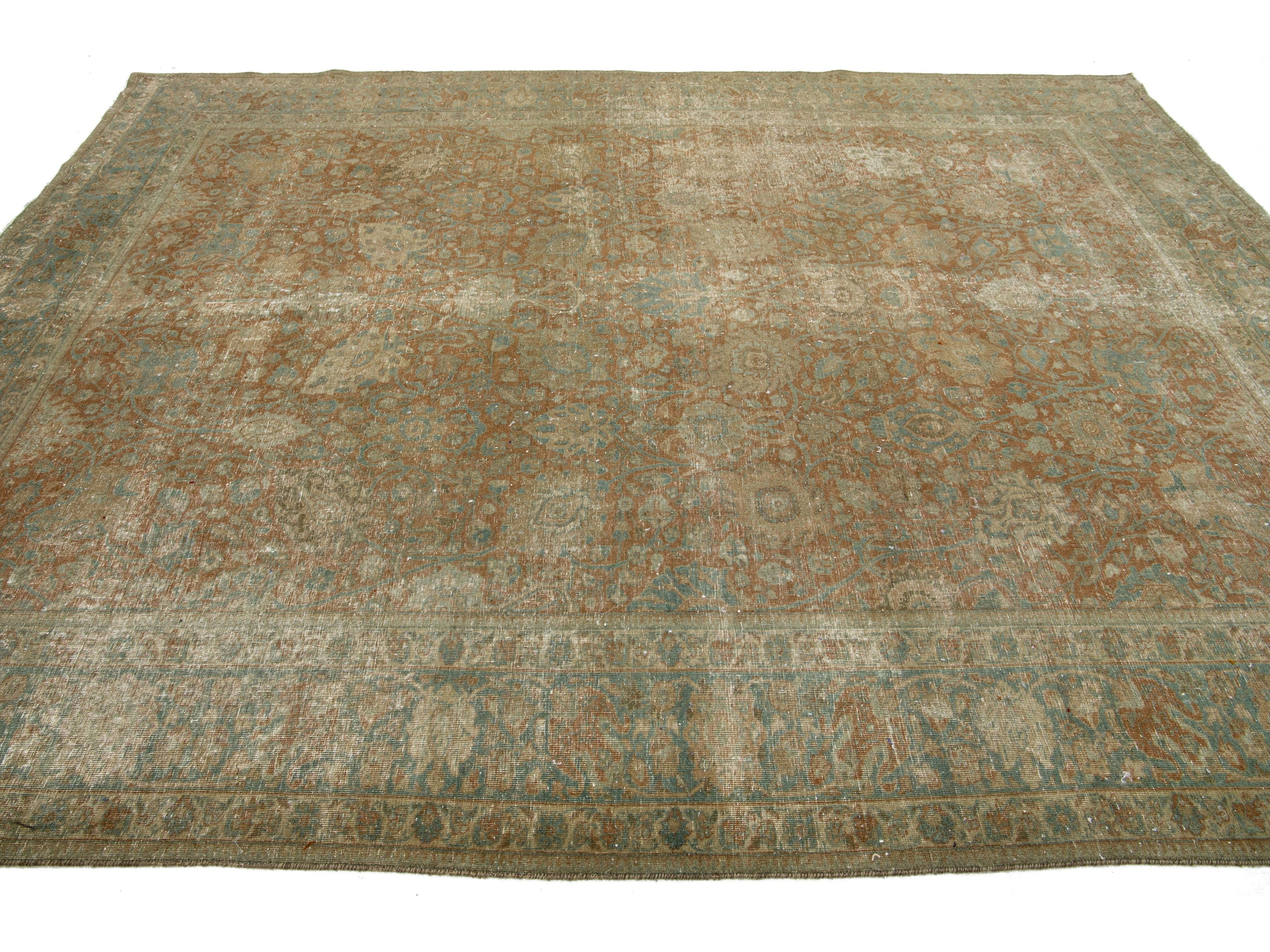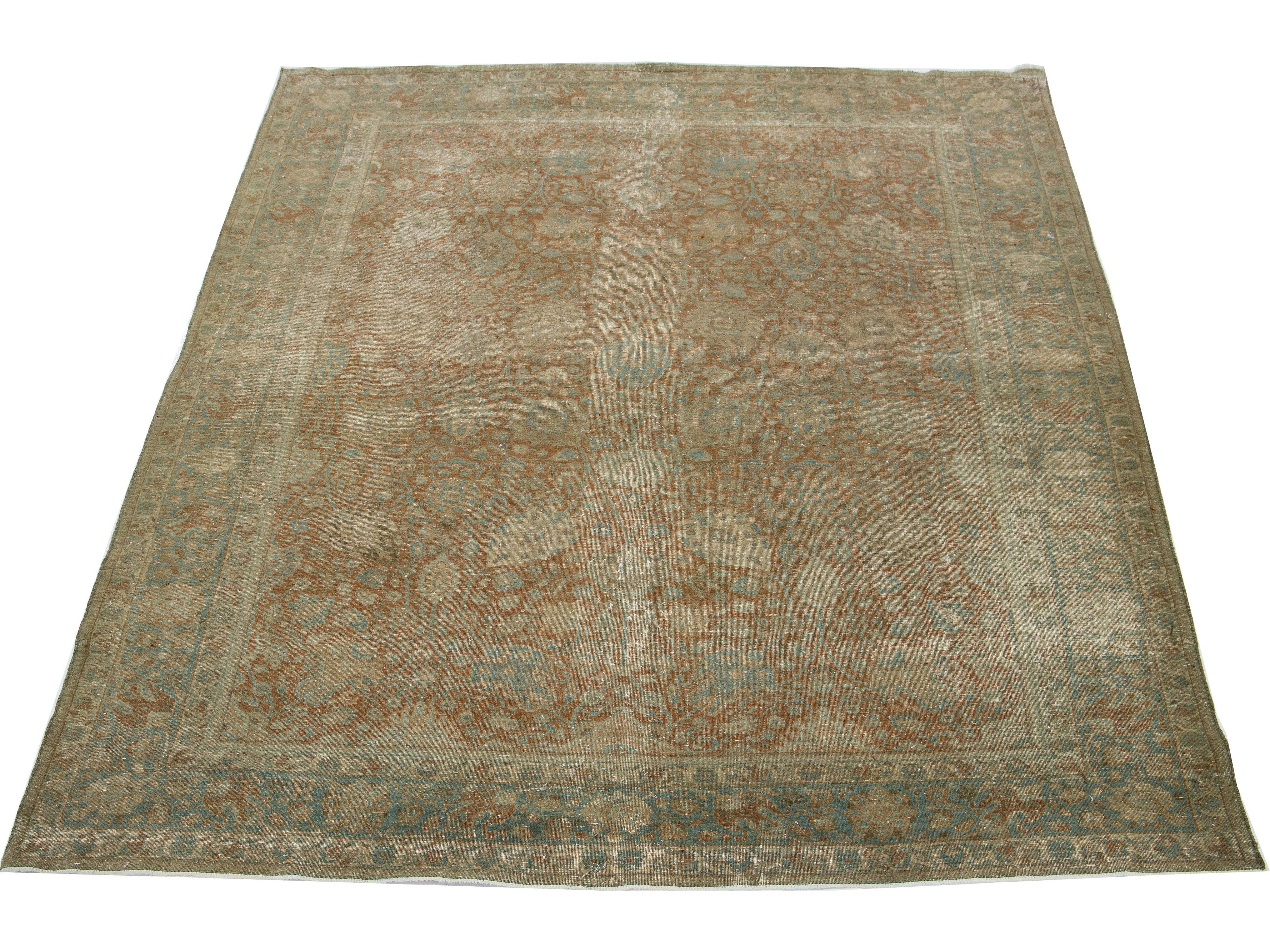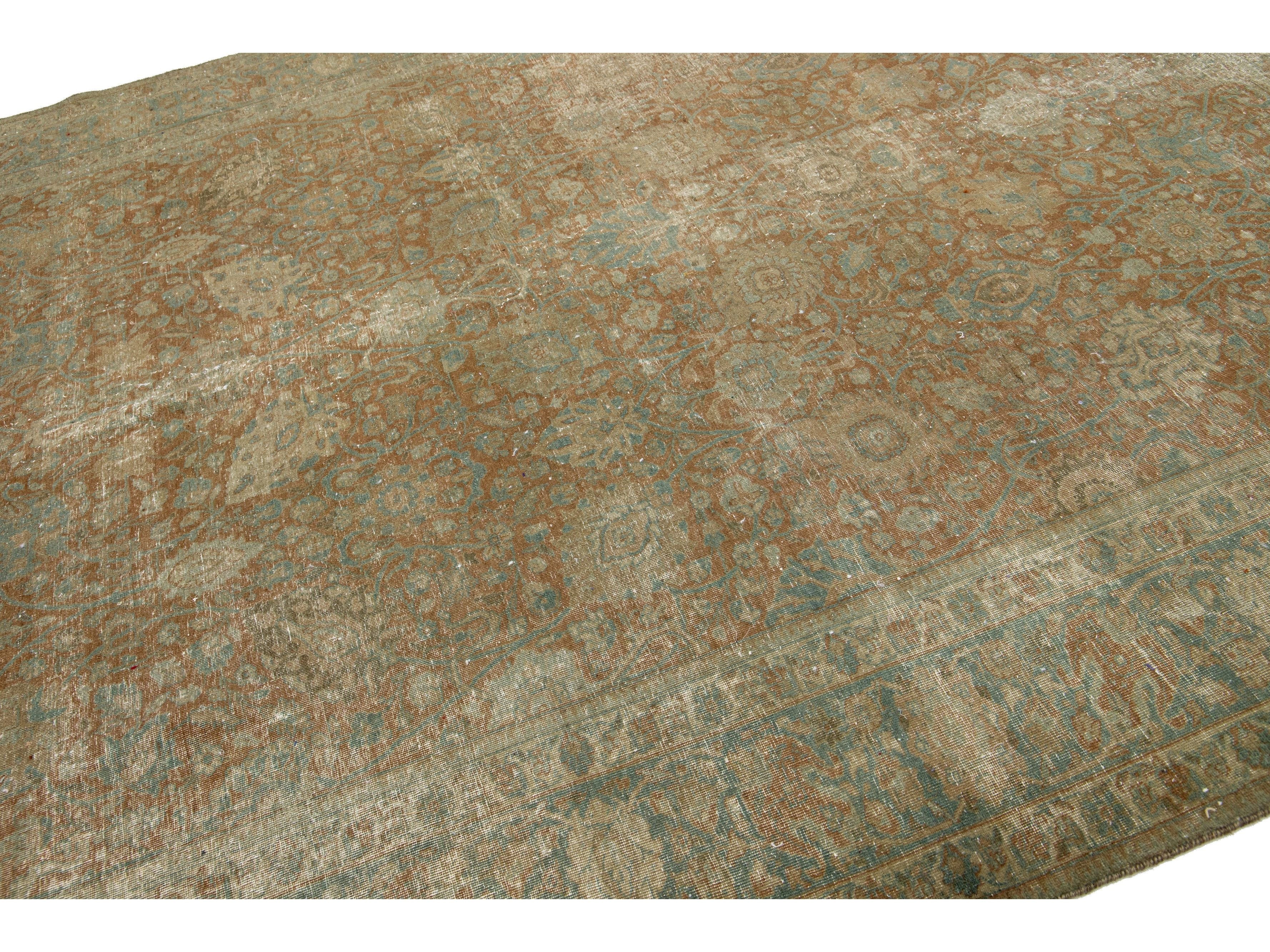 Indulge in the exquisite craftsmanship of this Persian Tabriz wool rug, adorned with a timeless floral motif. A rich brown background with hints of blue and beige make up this opulent masterpiece.