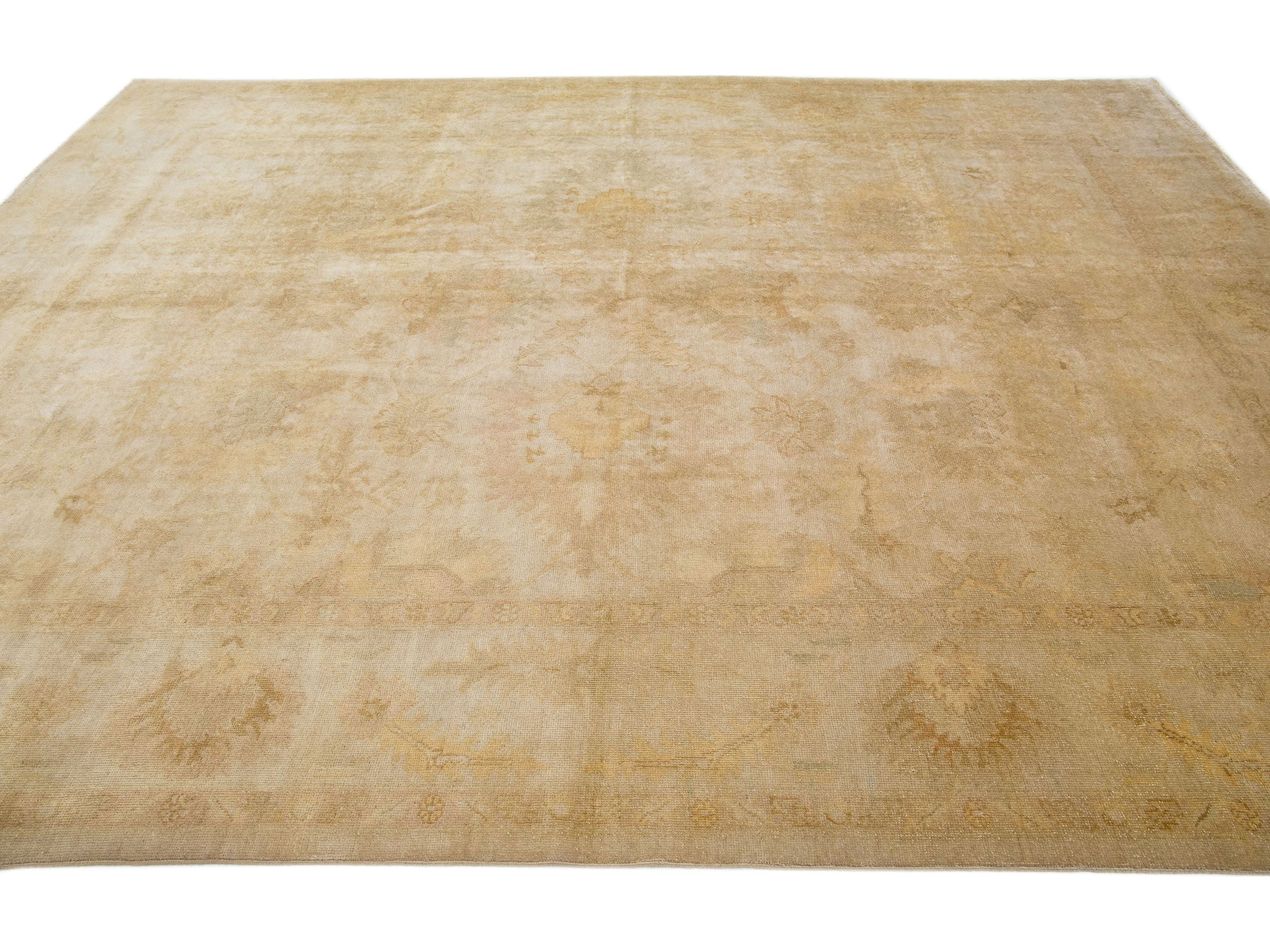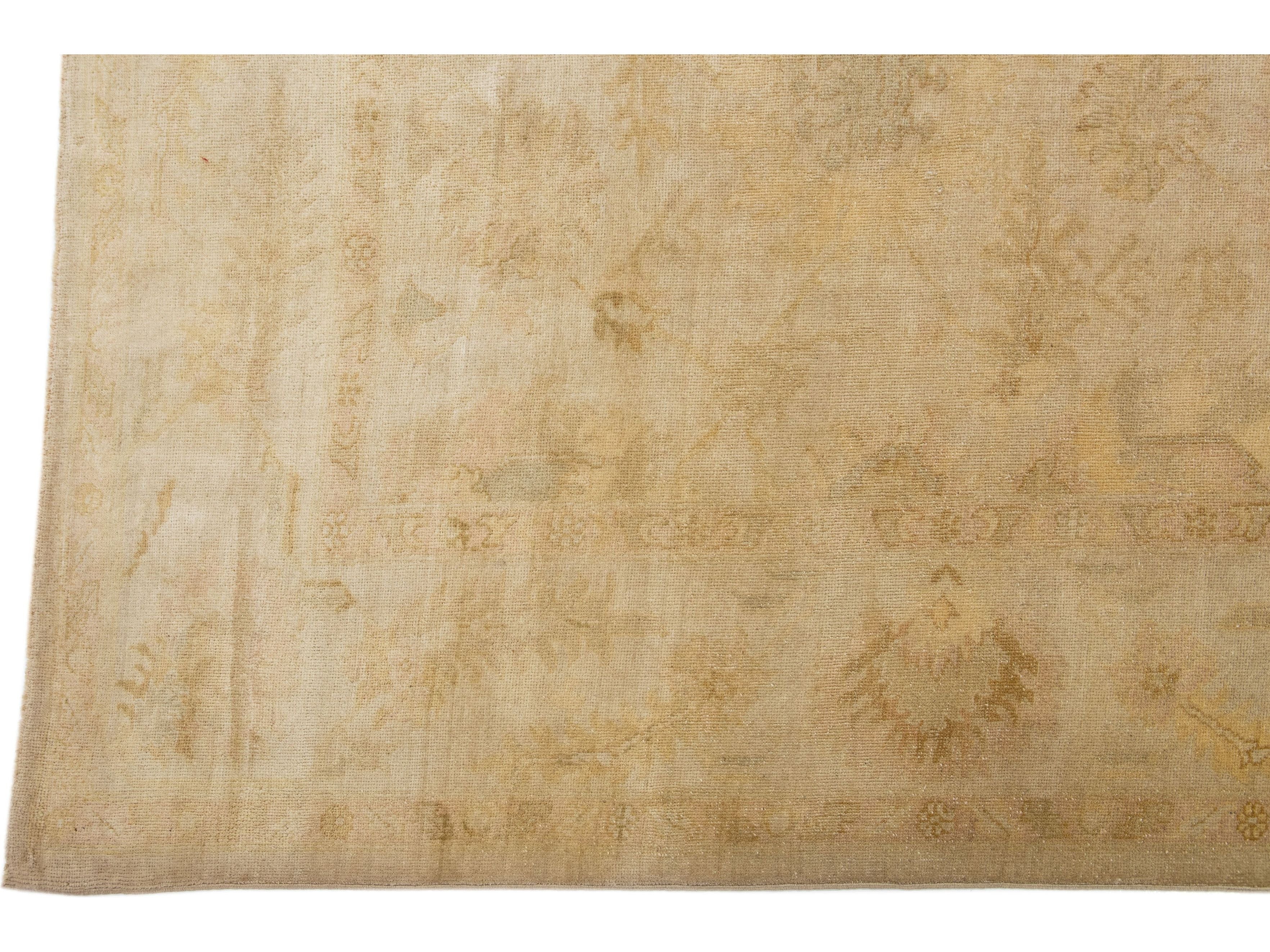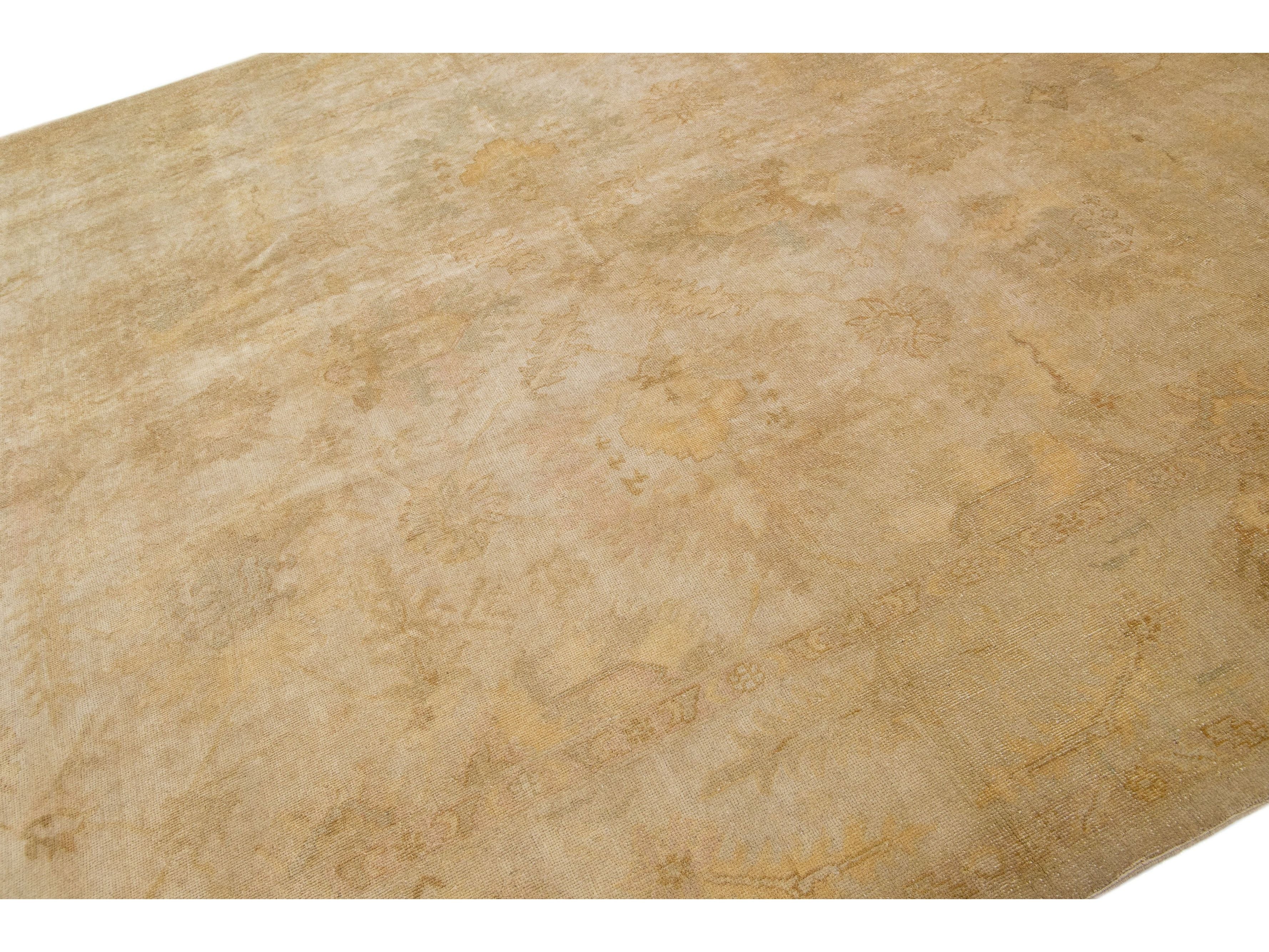 This hand-knotted wool rug boasts a stunning Vintage Oushak design, featuring an elegant beige field complemented by classic floral patterns in shades of brown and tan.
