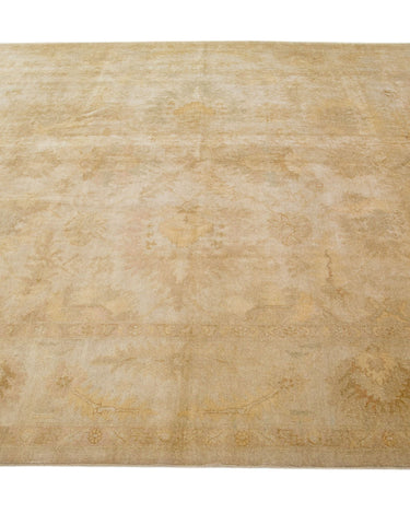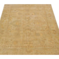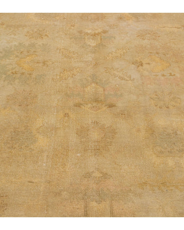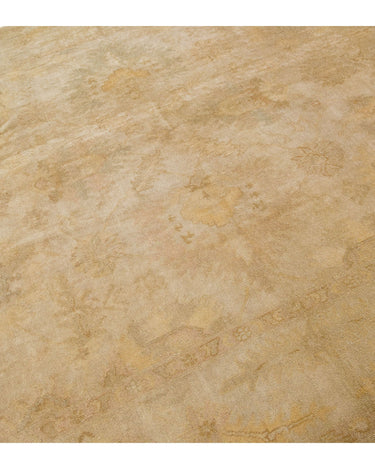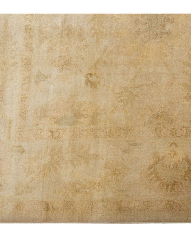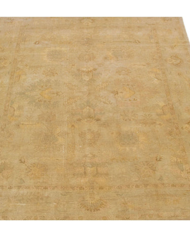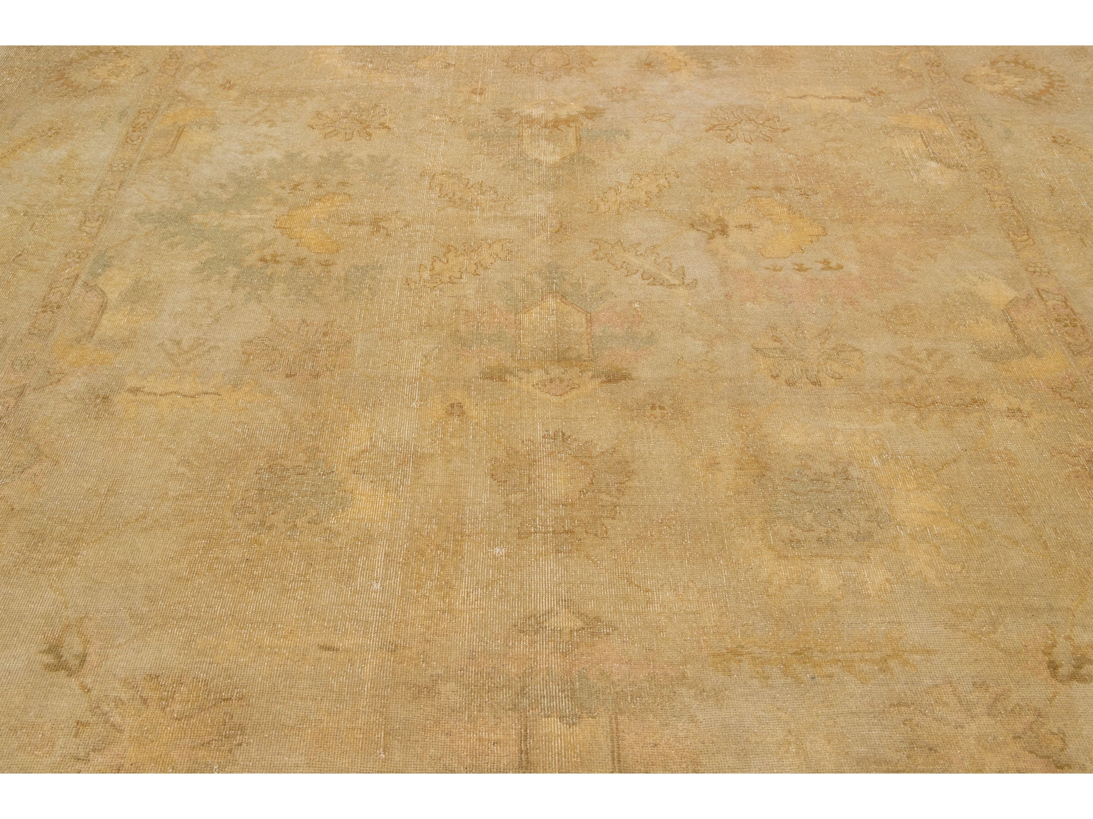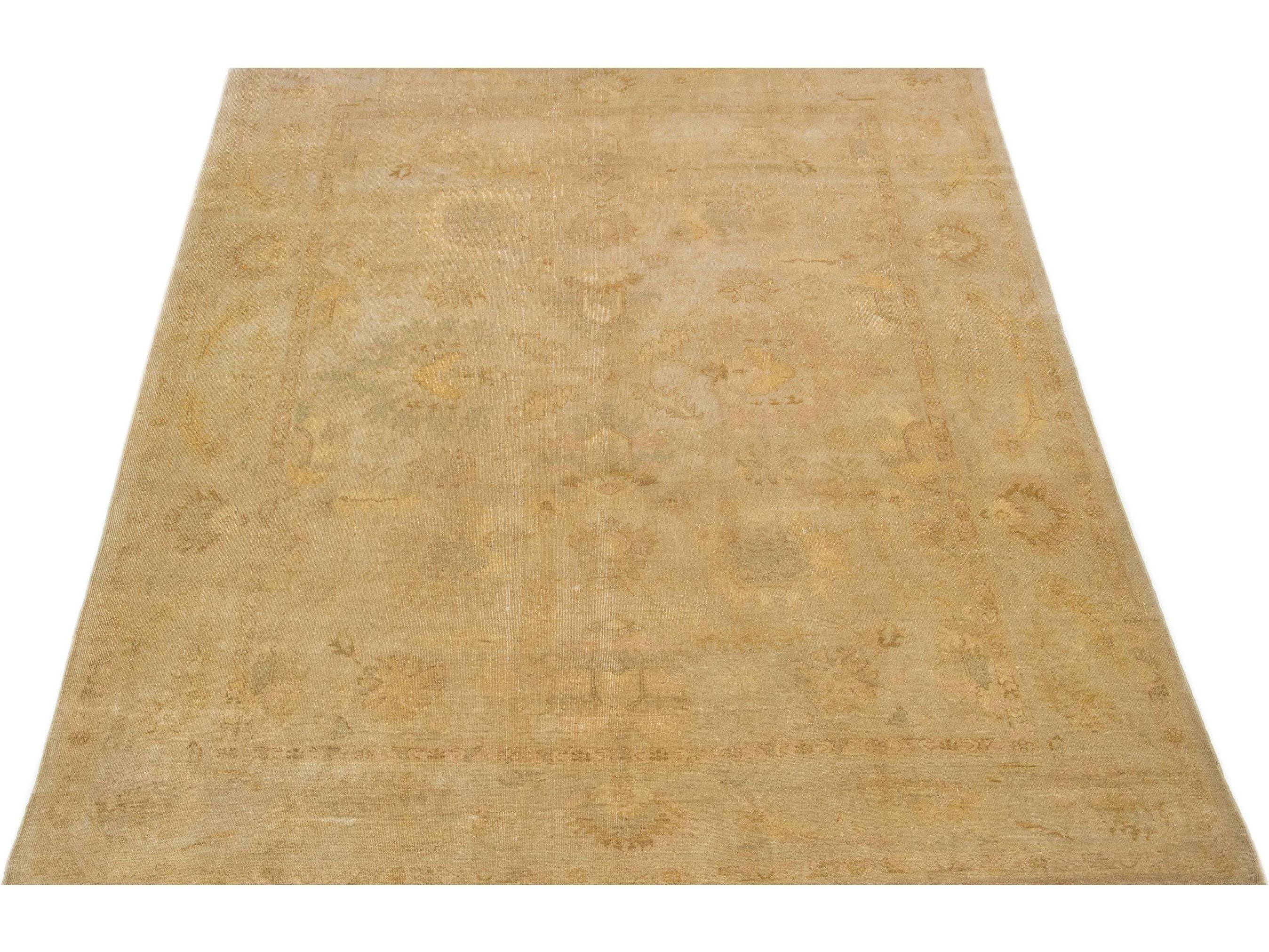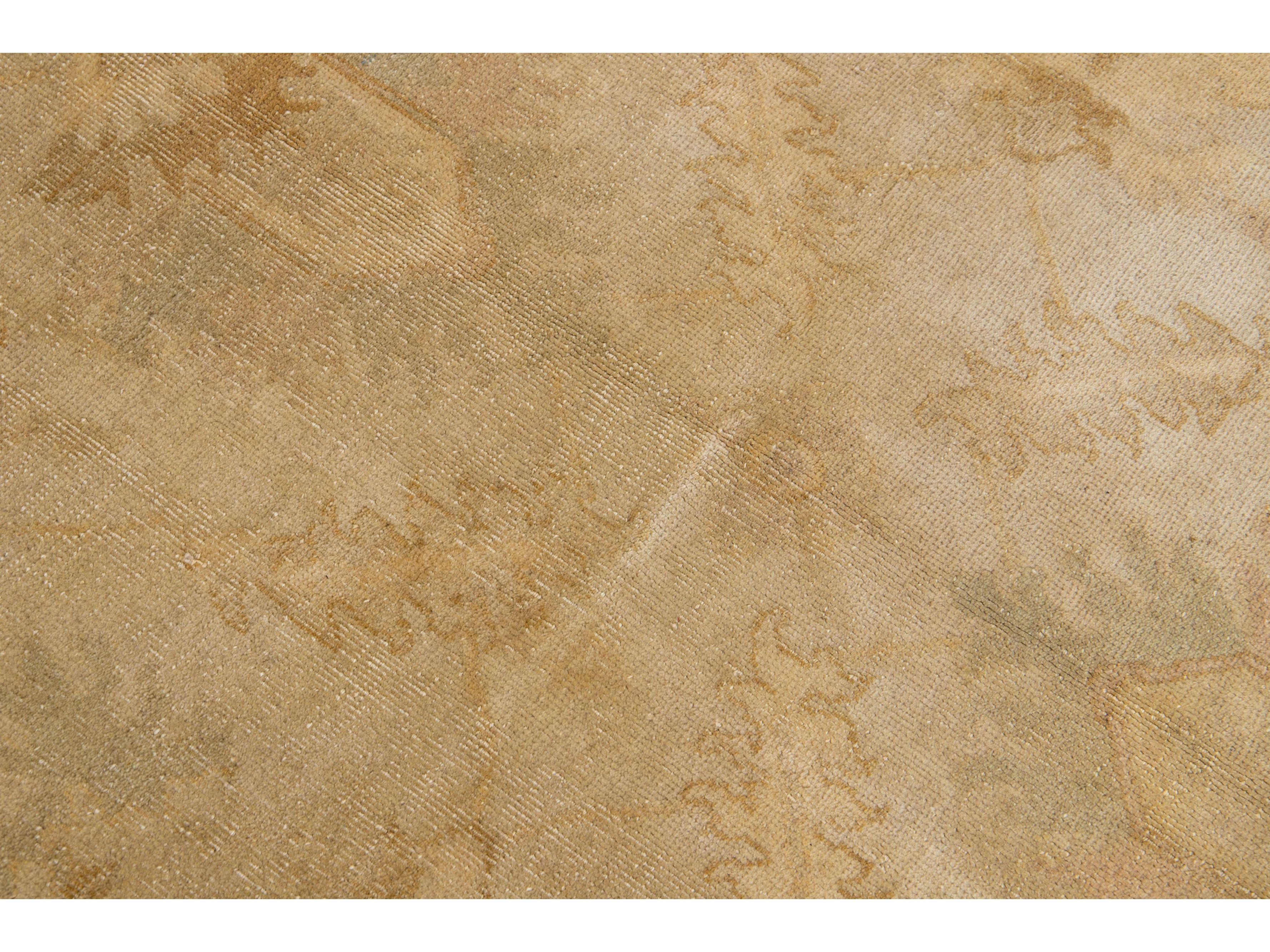 This hand-knotted wool rug boasts a stunning Vintage Oushak design, featuring an elegant beige field complemented by classic floral patterns in shades of brown and tan.