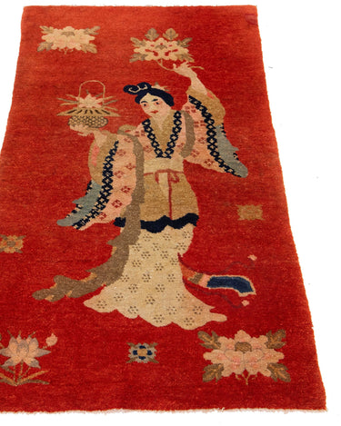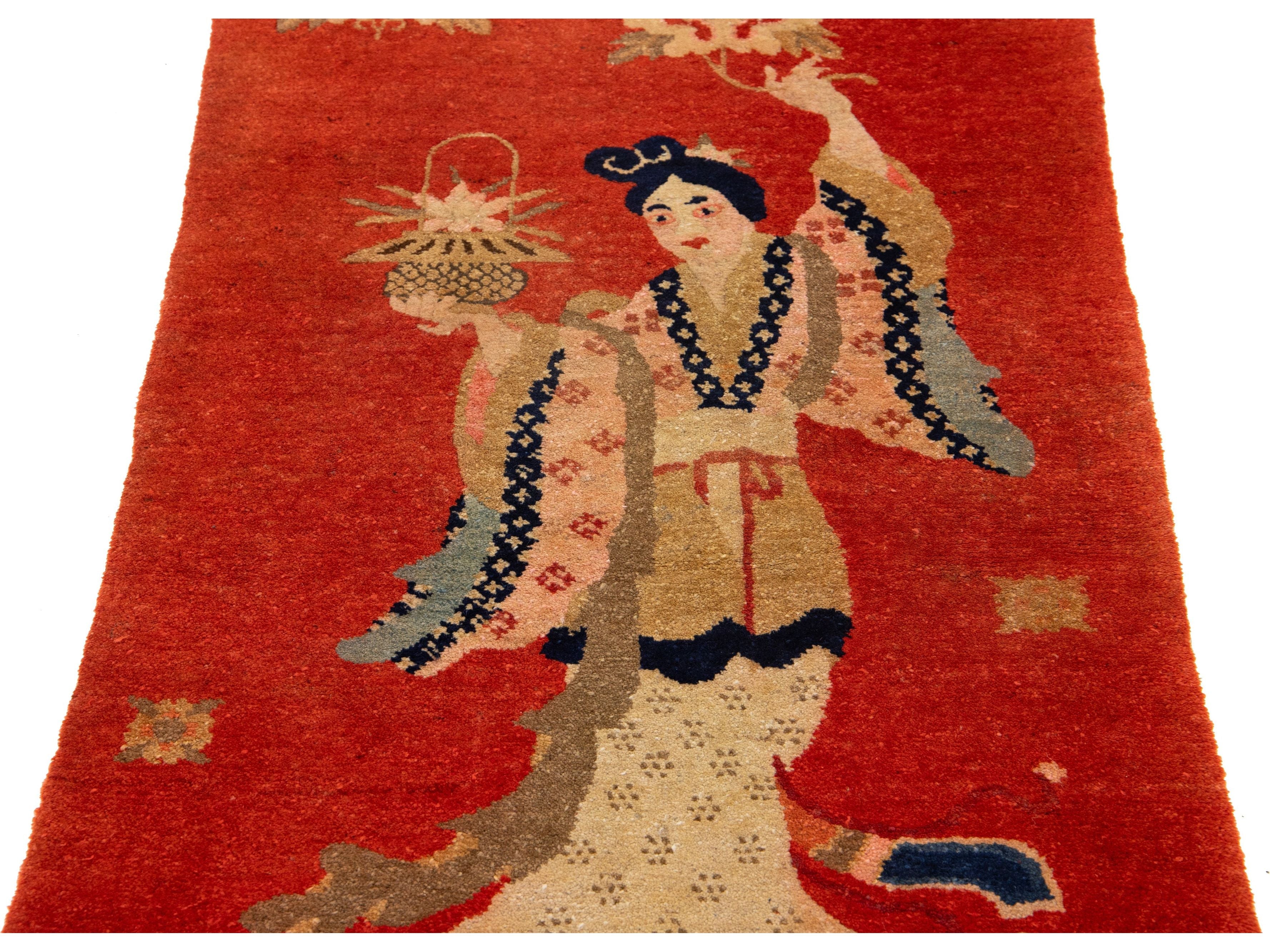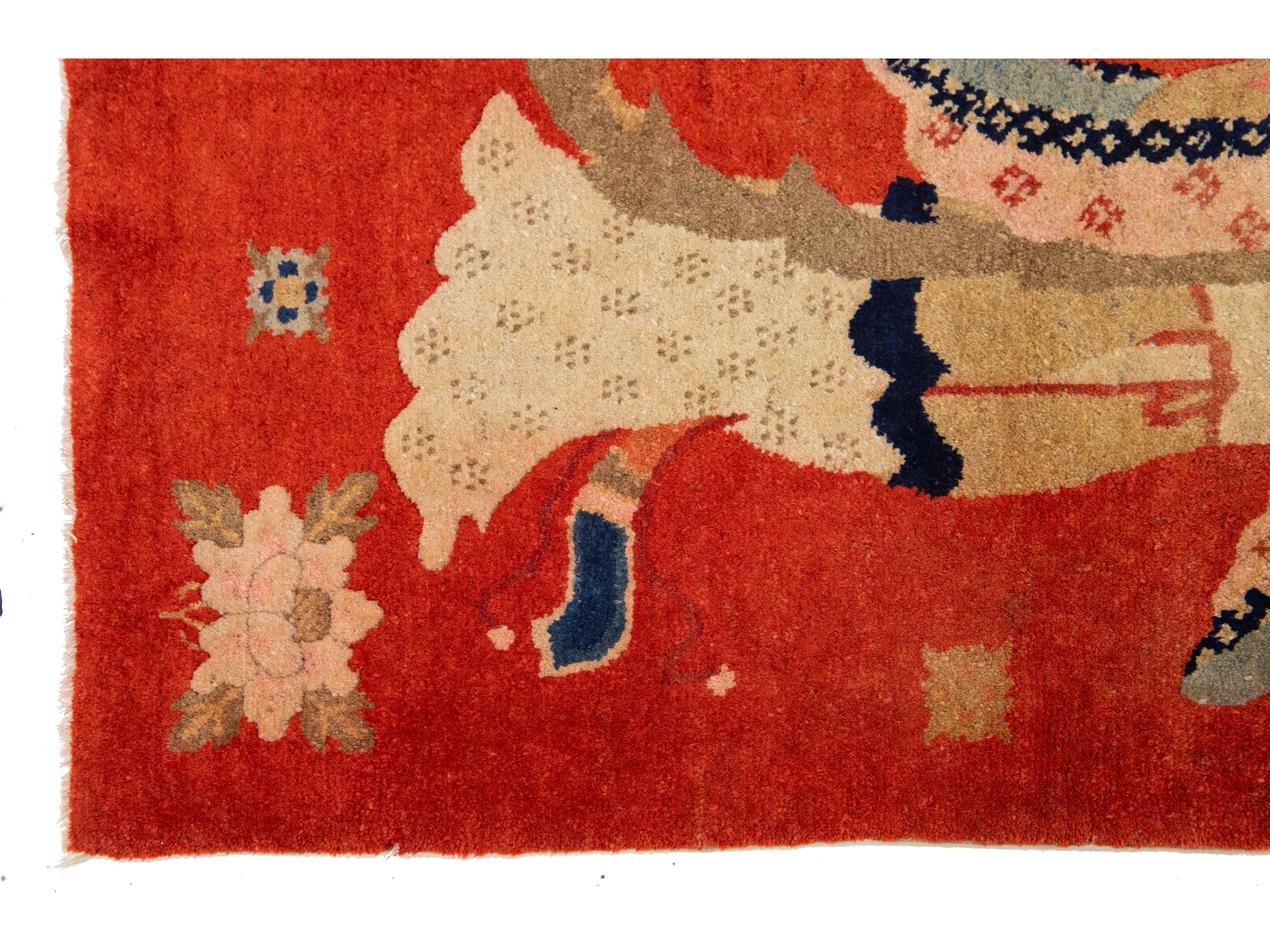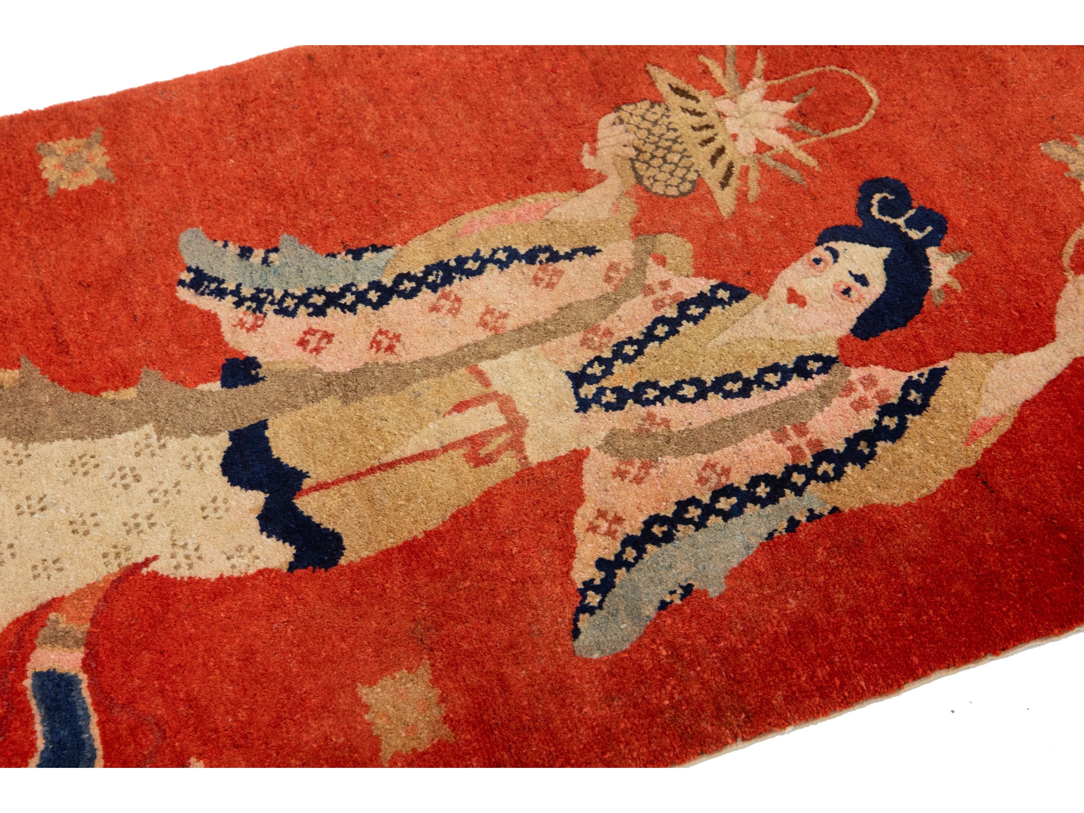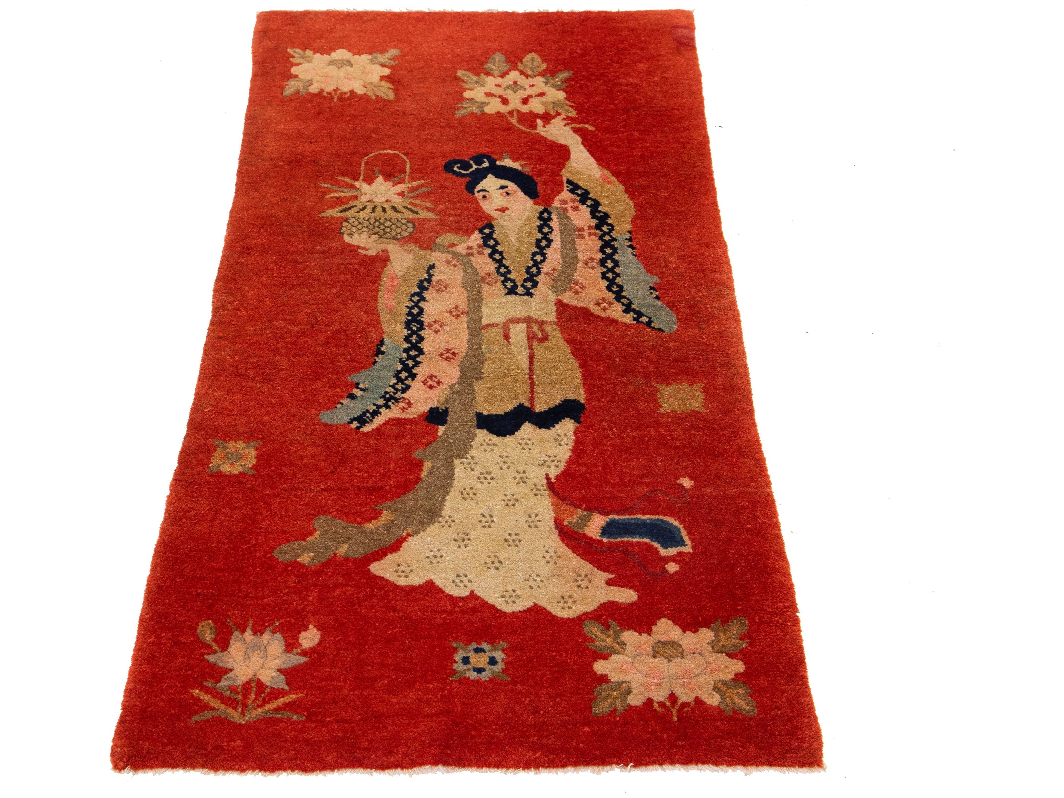 An Antique Chinese Art Deco rug, hand-knotted from wool with a red background. It features a multicolor pictorial design. This rug measures 2'2'' x 4'1''.