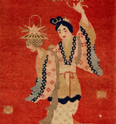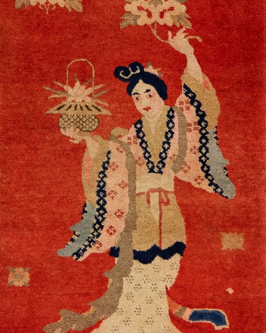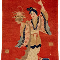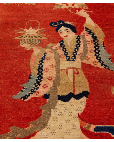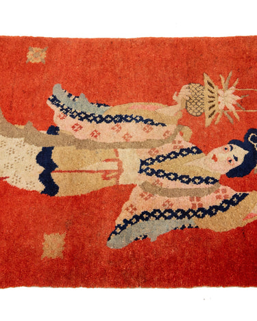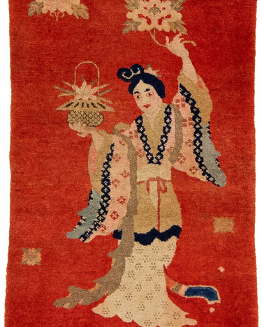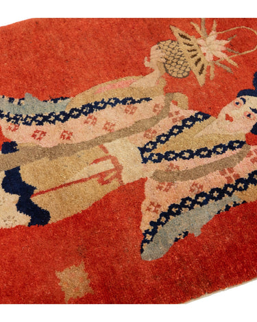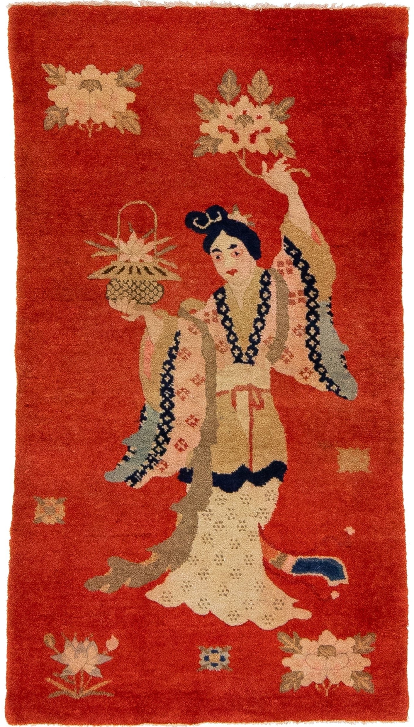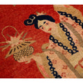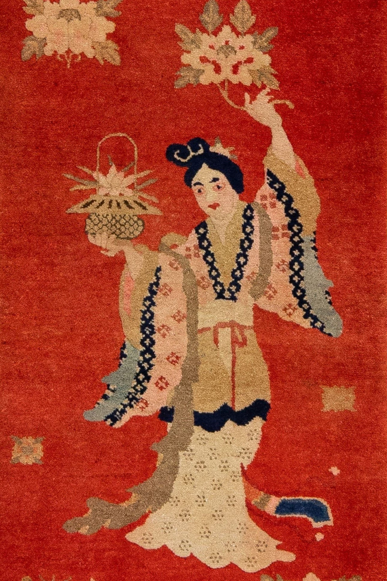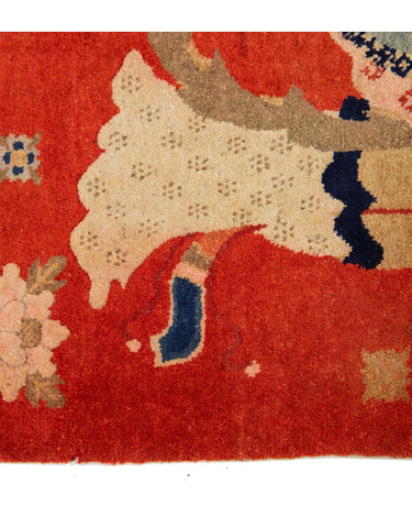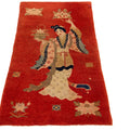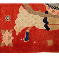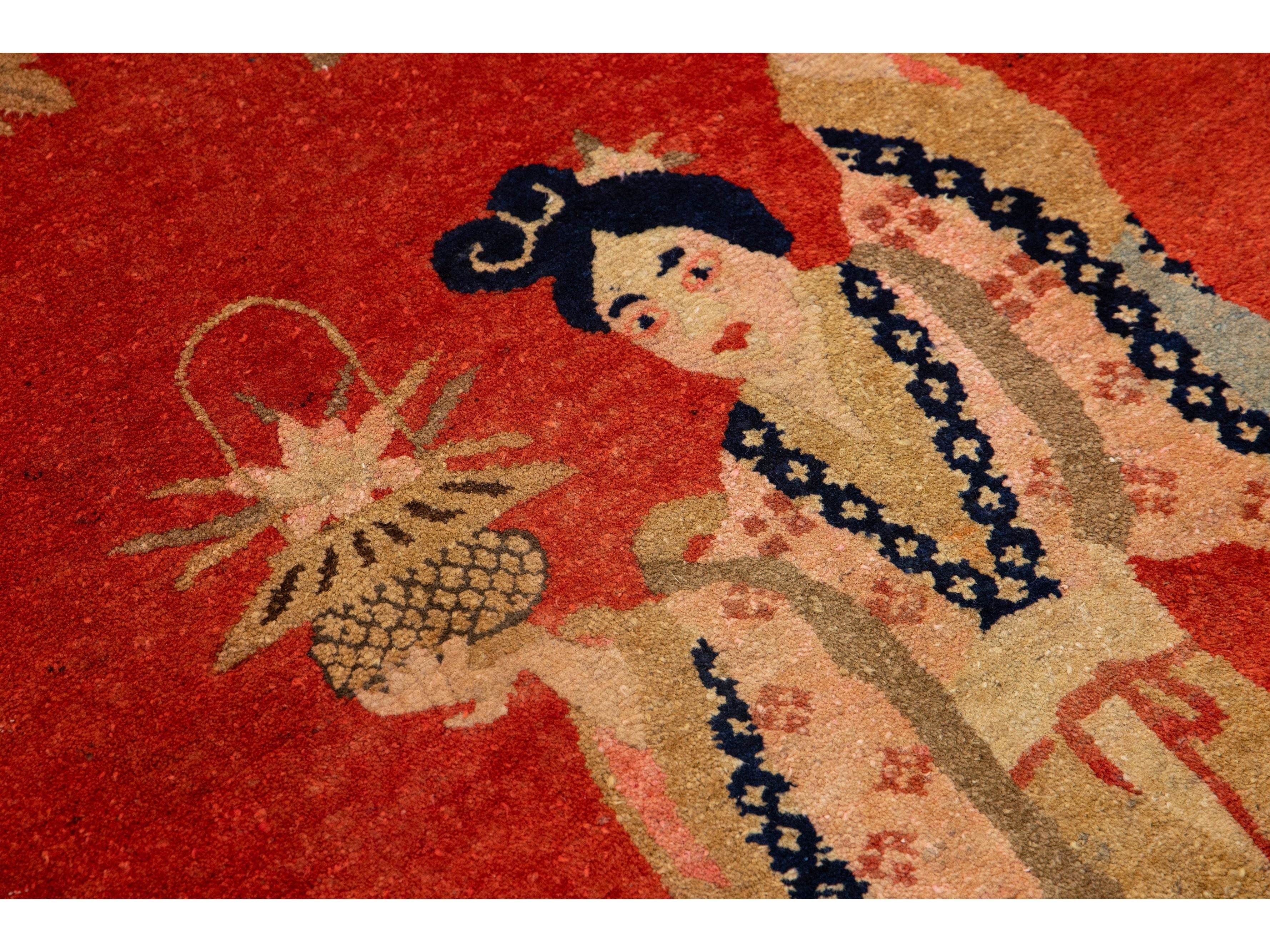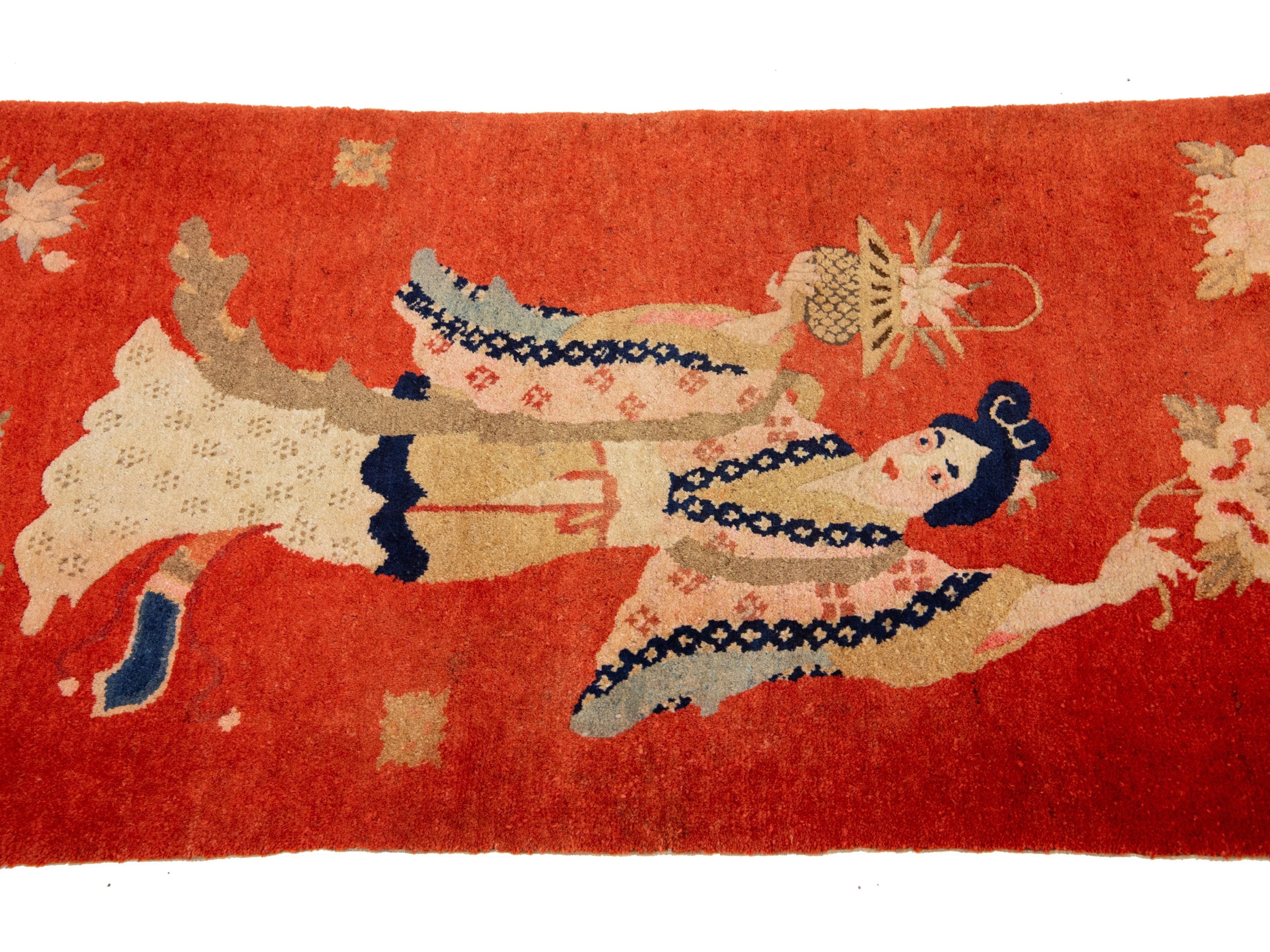 An Antique Chinese Art Deco rug, hand-knotted from wool with a red background. It features a multicolor pictorial design. This rug measures 2'2'' x 4'1''.