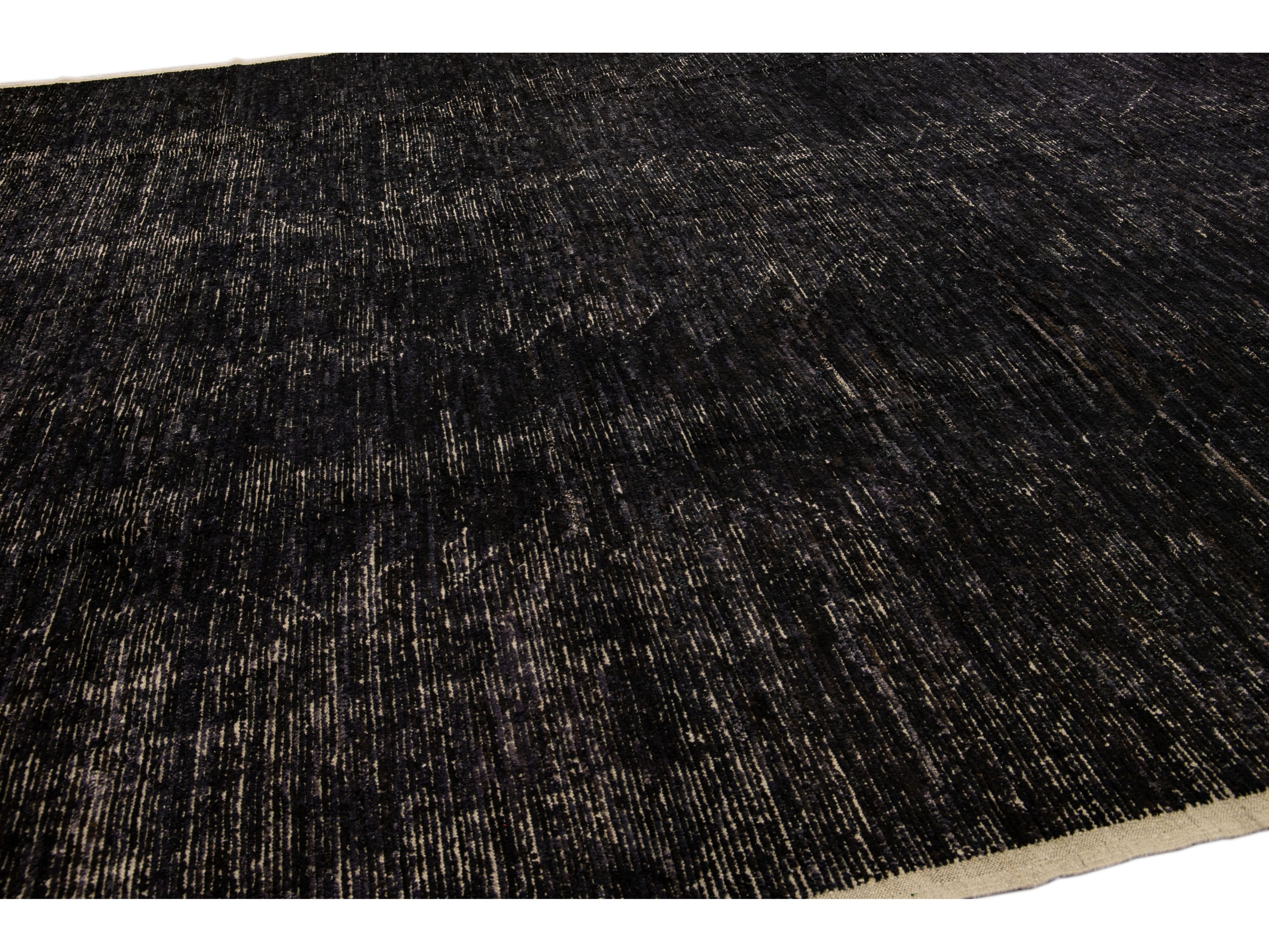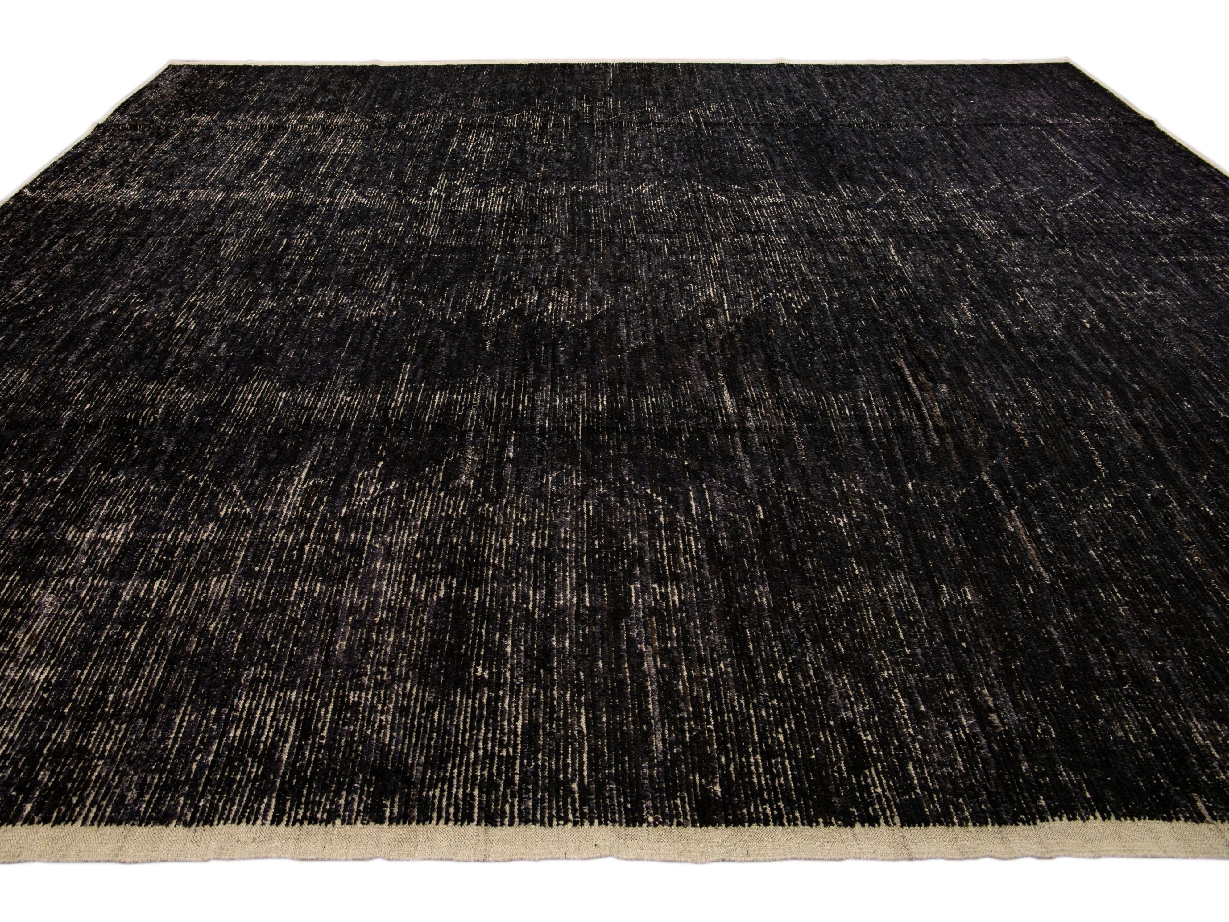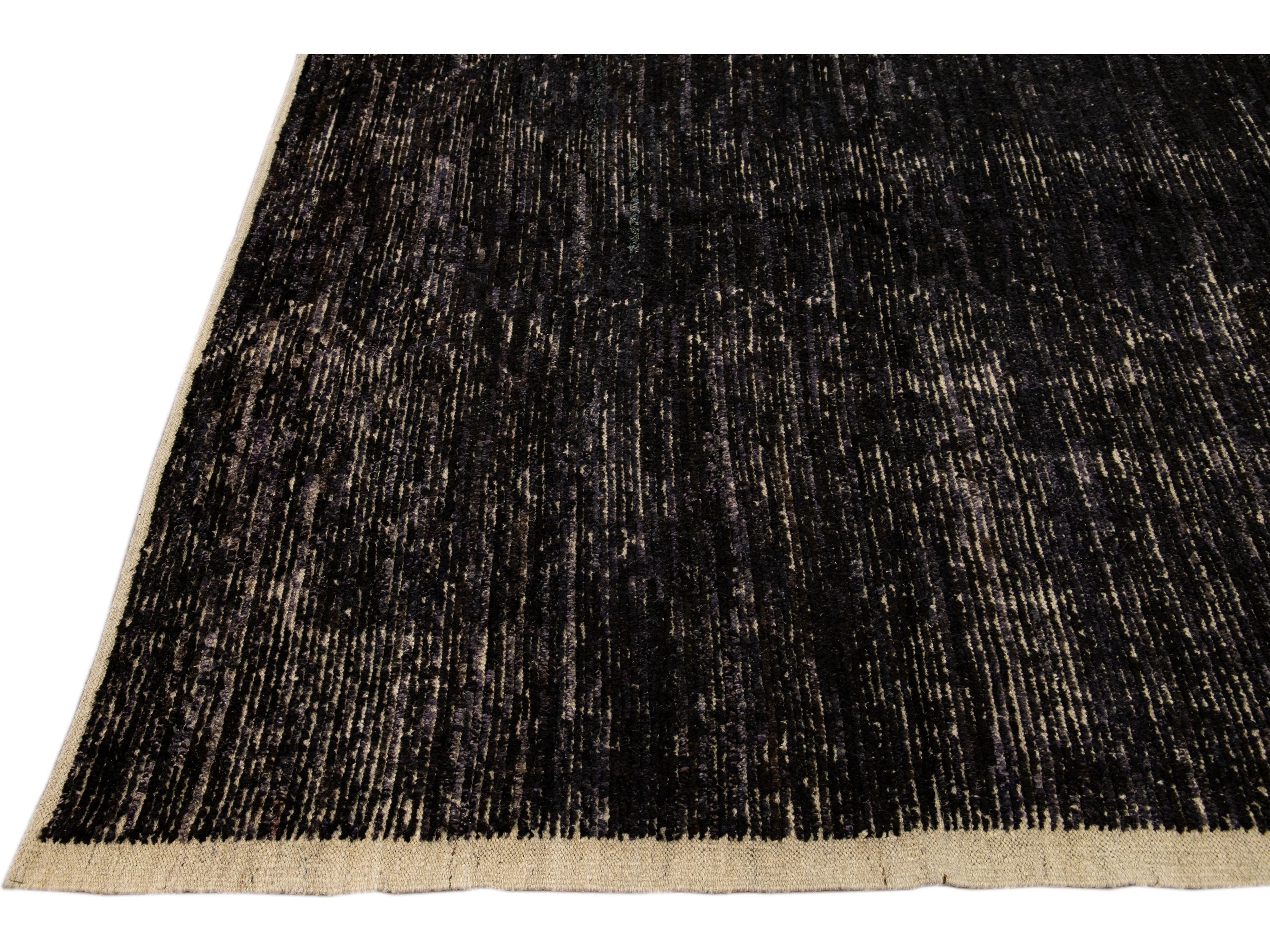 Beautiful Moroccan style handmade wool rug with a black field. This Modern rug has beige accents featuring a gorgeous all-over geometric boho-chic design.