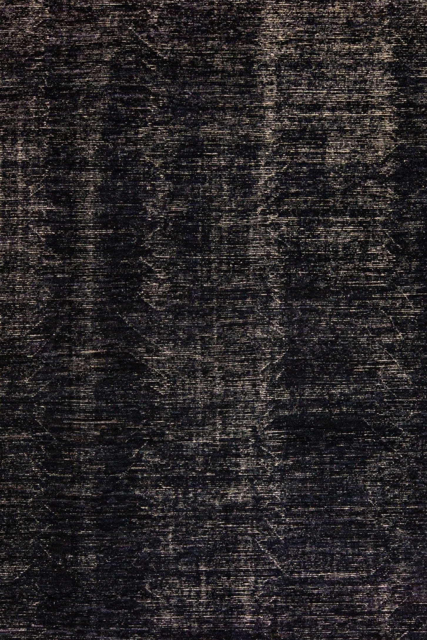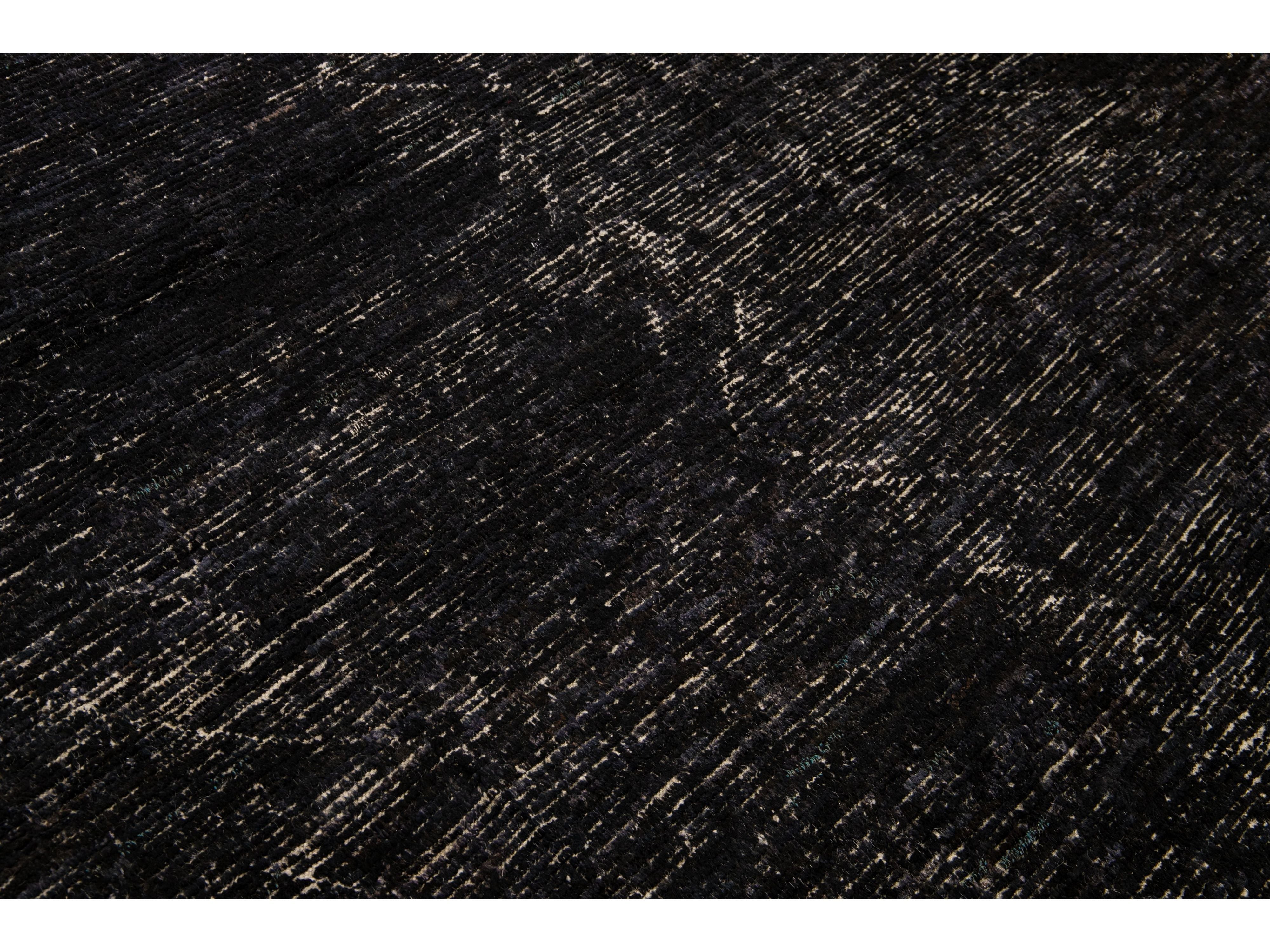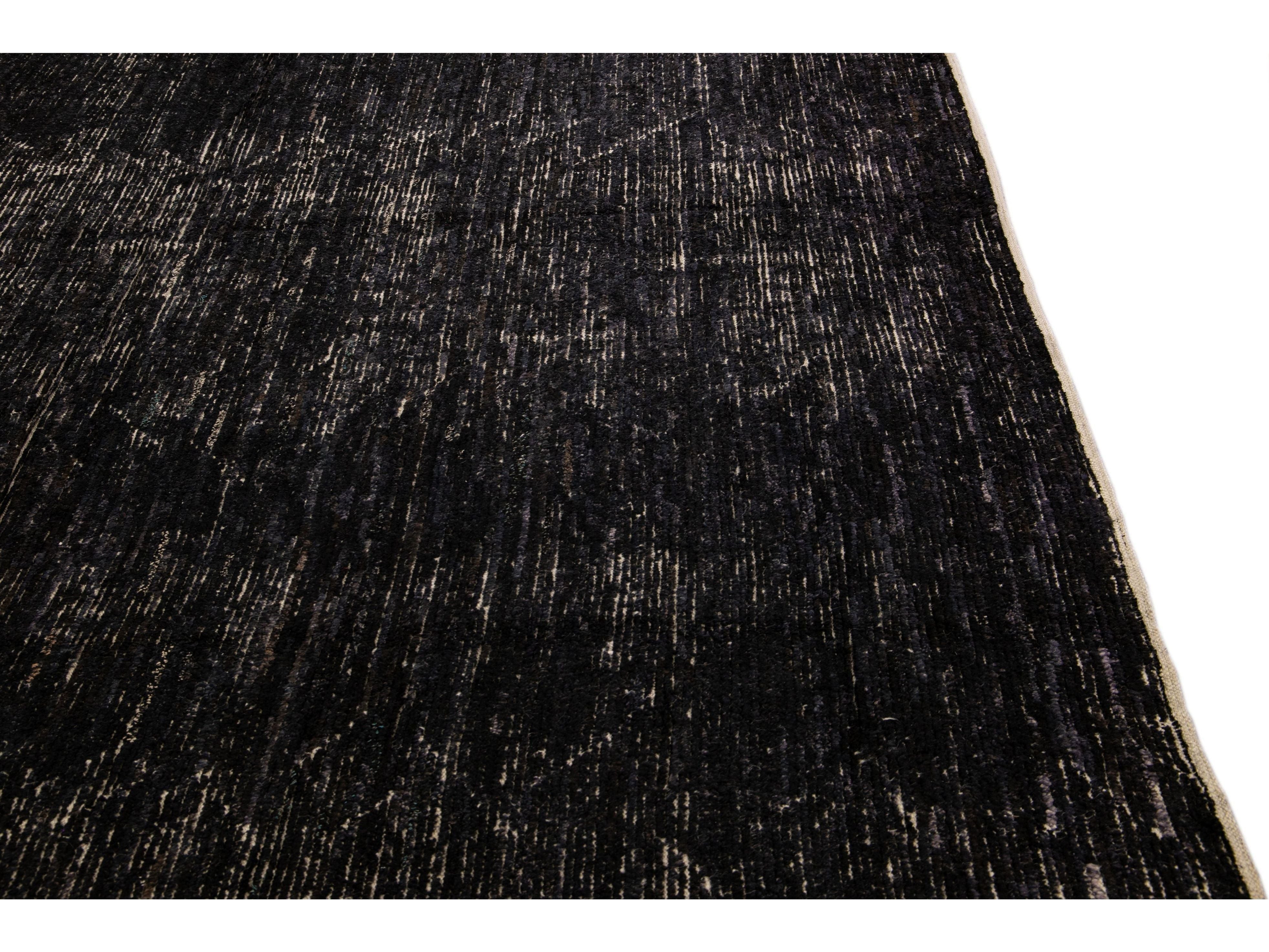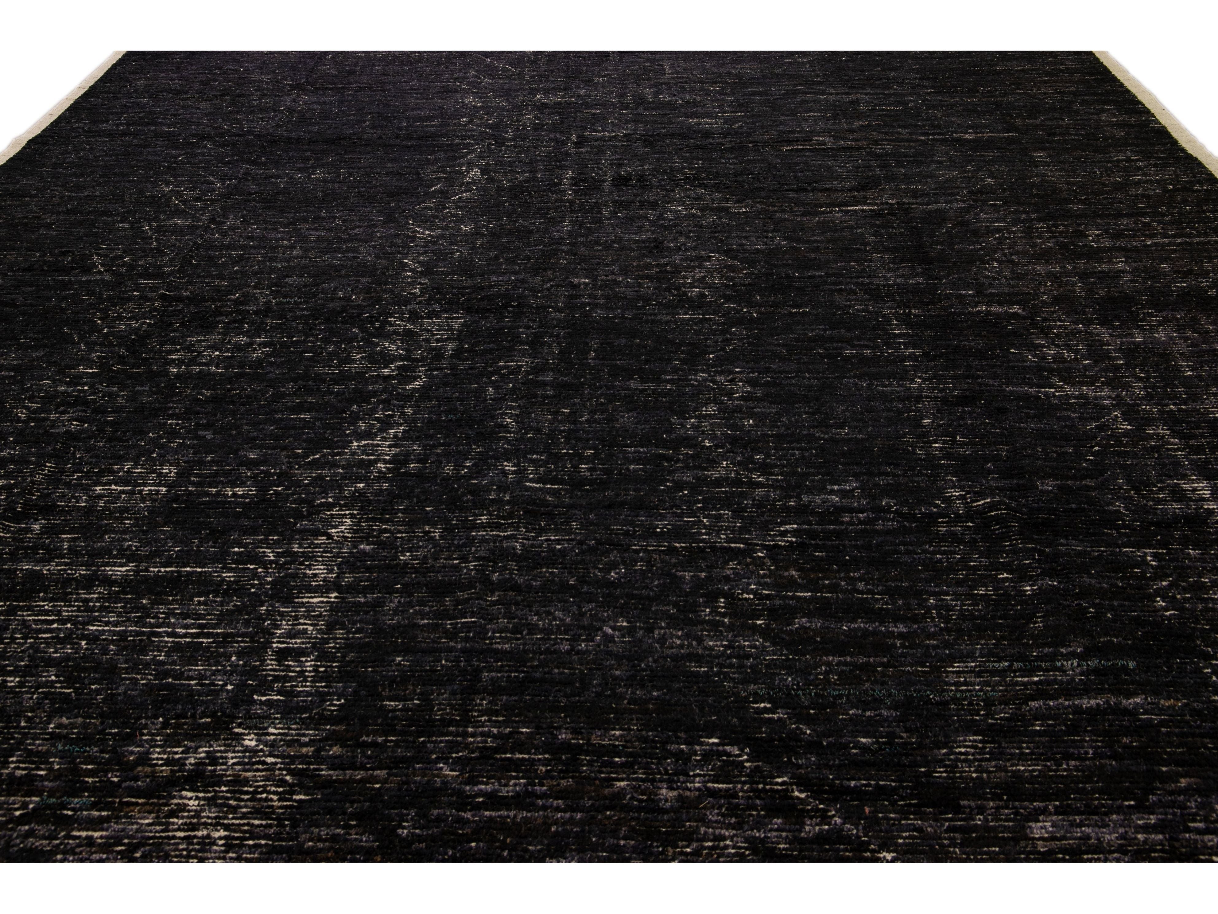Beautiful Moroccan style handmade wool rug with a black field. This Modern rug has beige accents featuring a gorgeous all-over geometric boho-chic design.