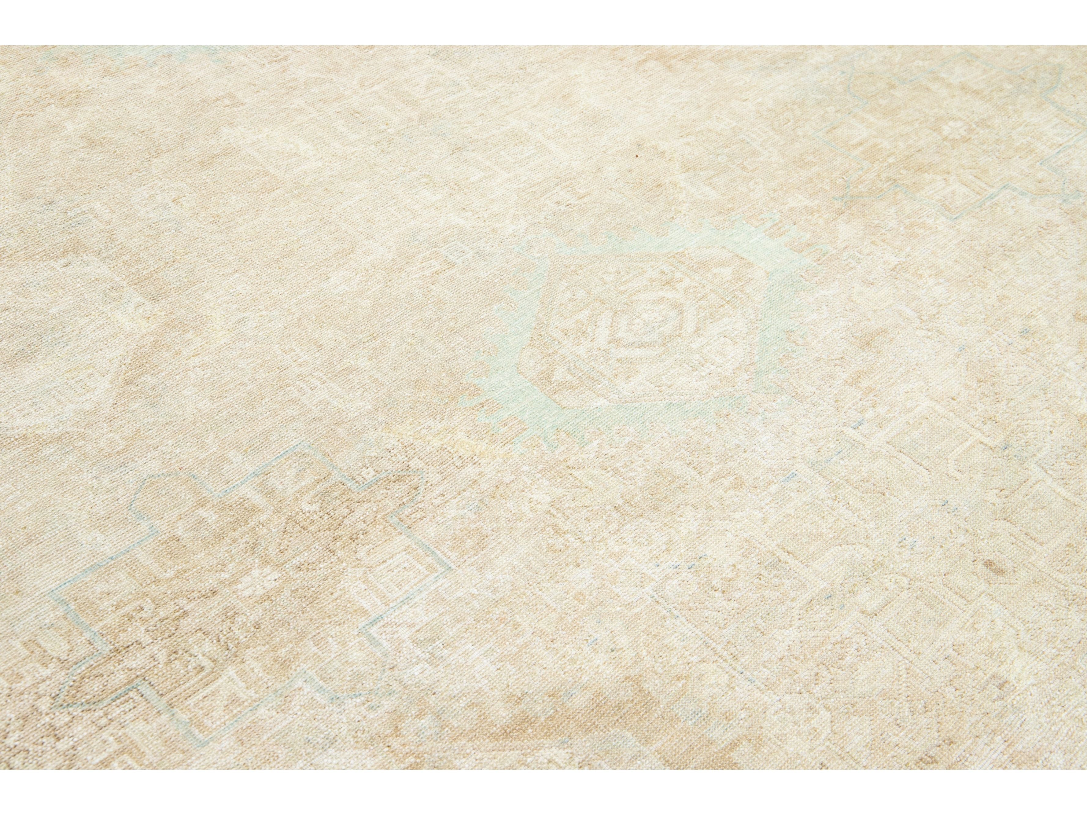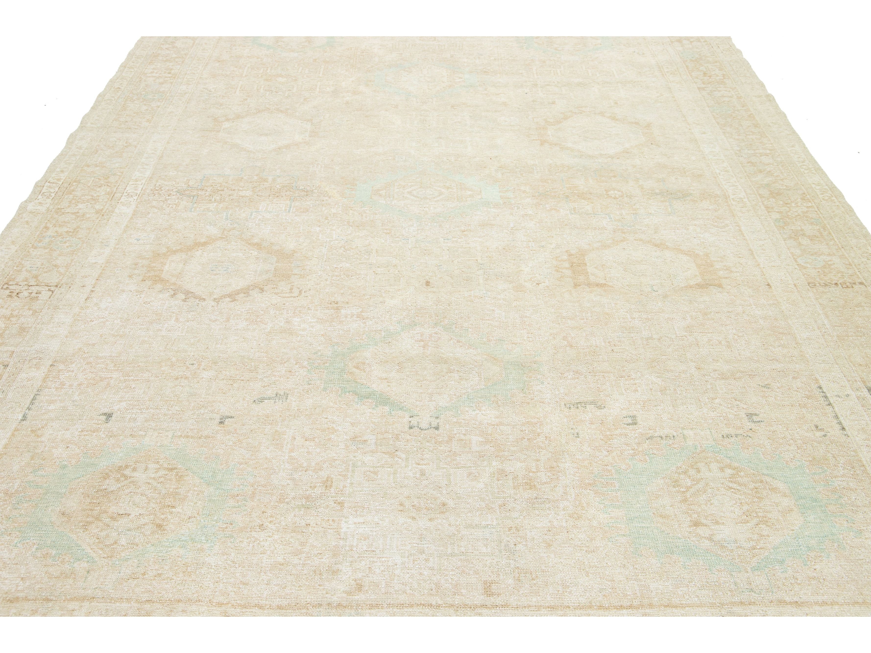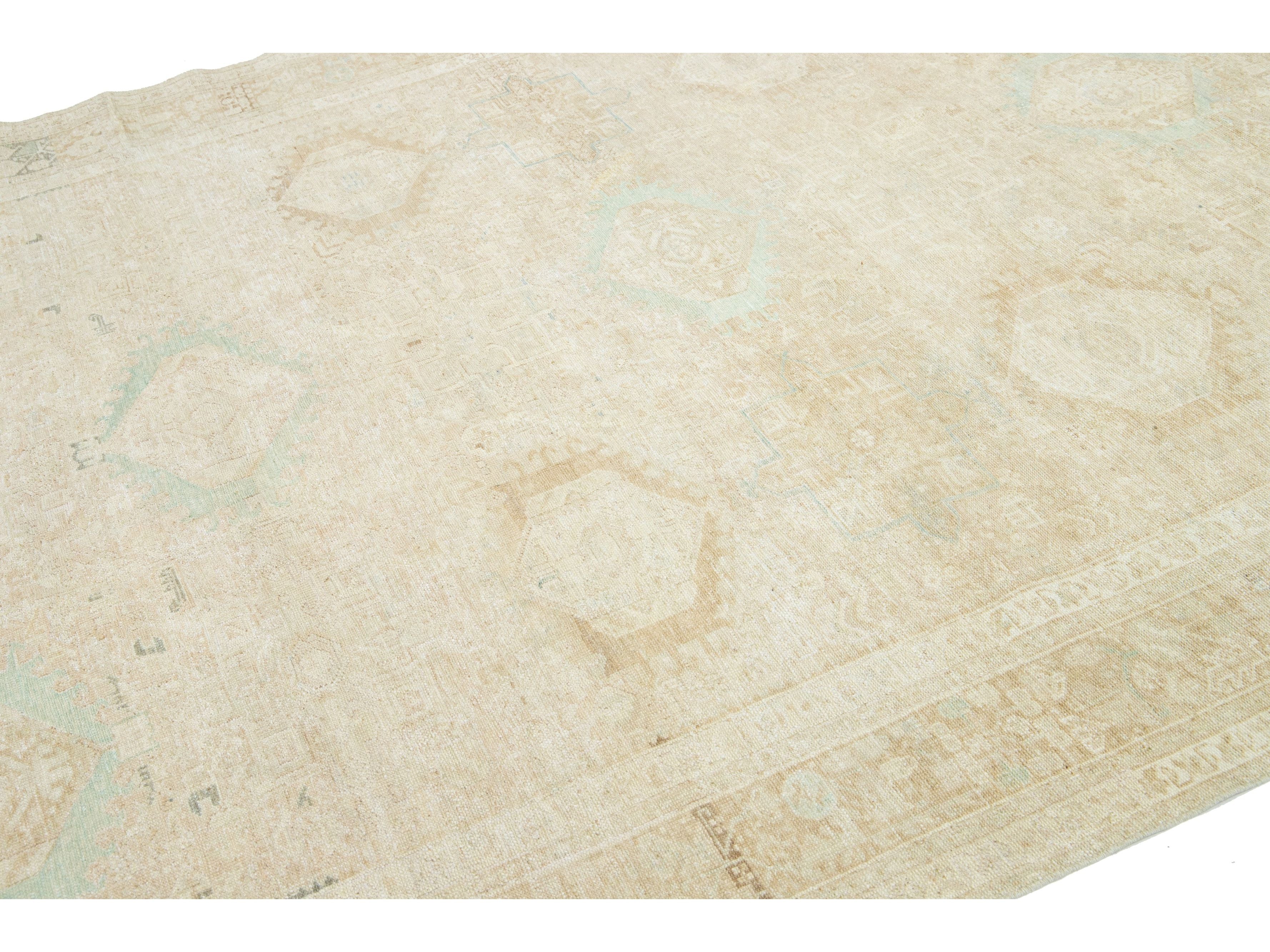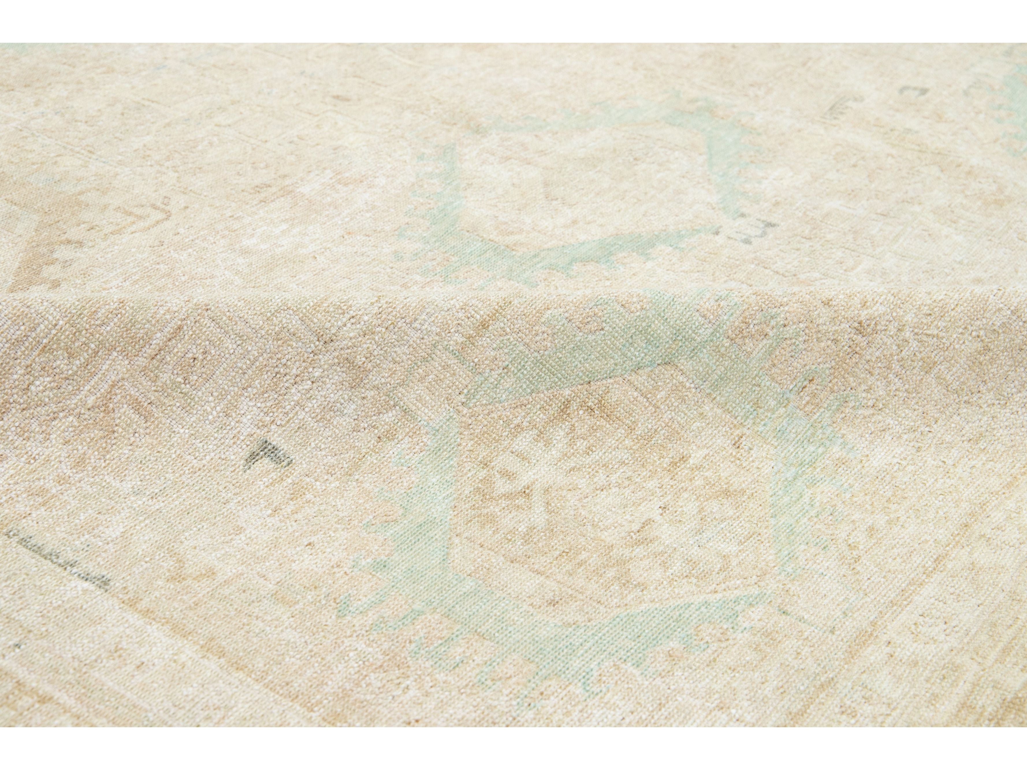 This exquisite antique Persian Heriz wool rug showcases a captivating green design that beautifully enhances a luxurious deep beige background.