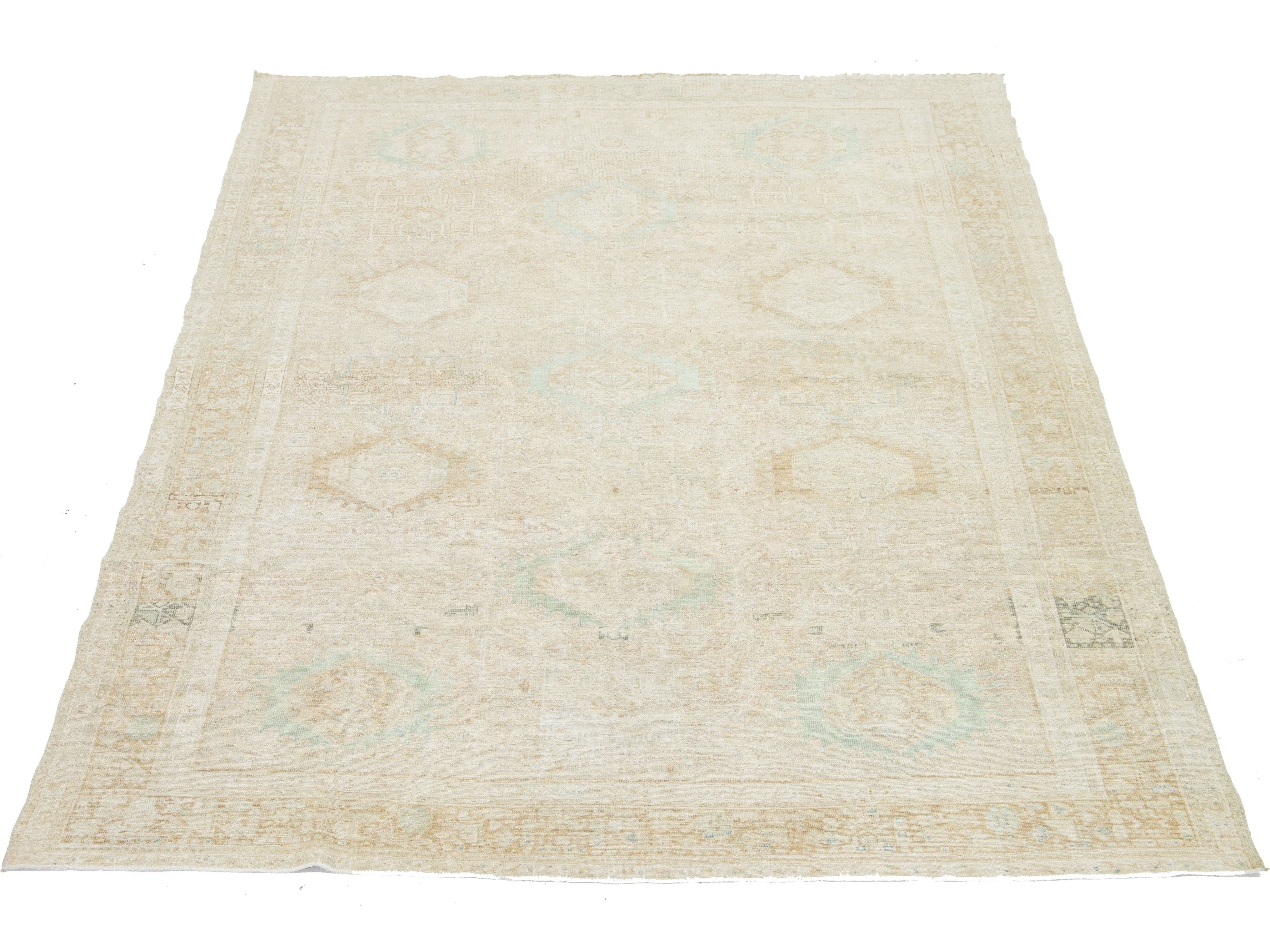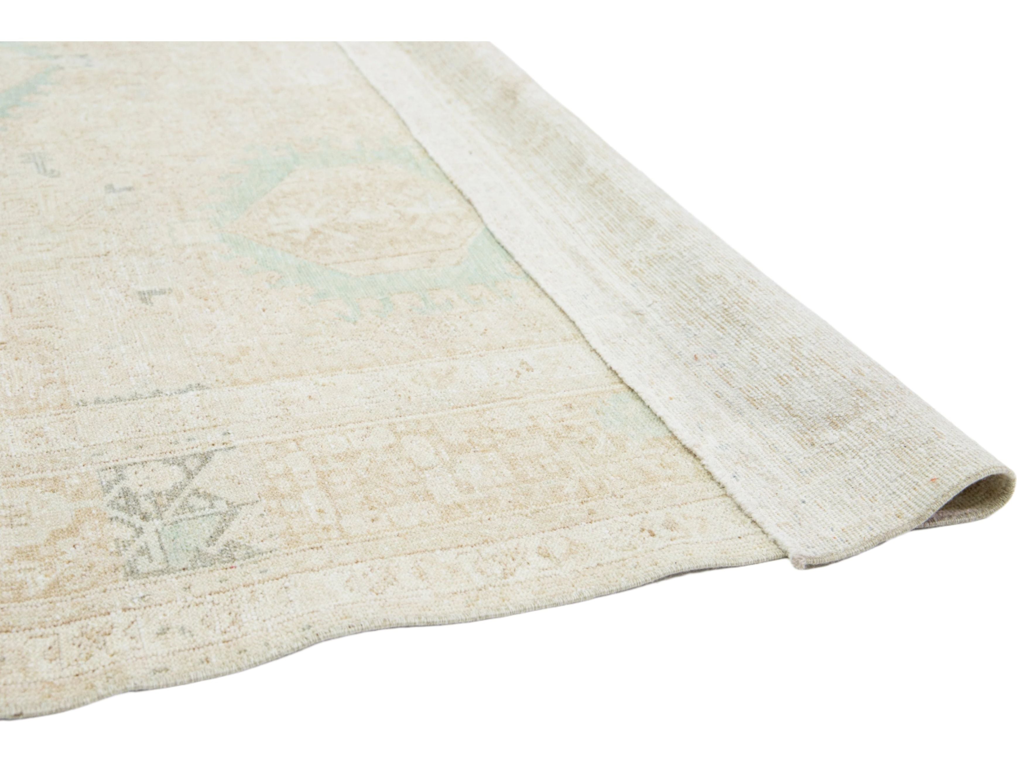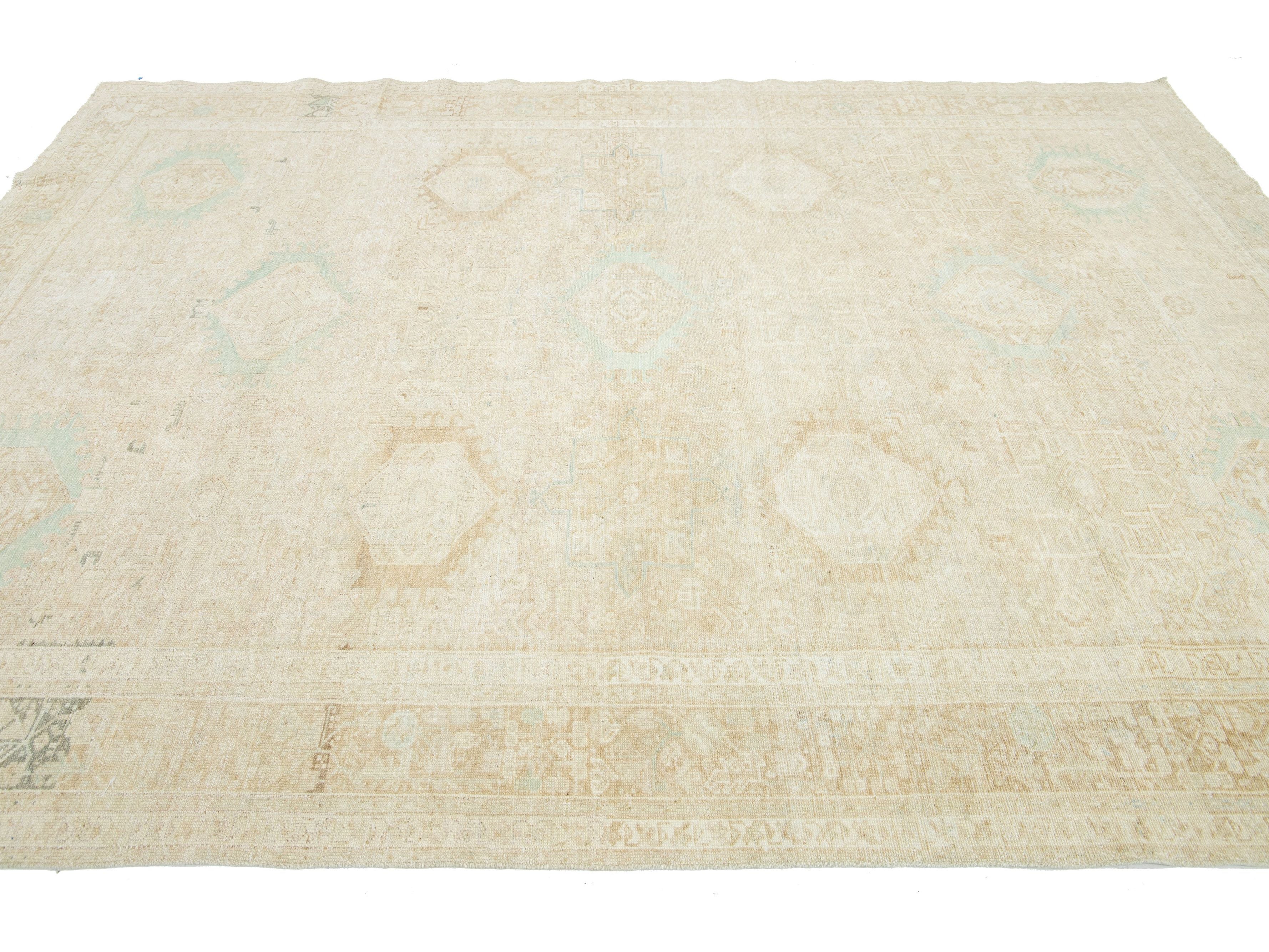 This exquisite antique Persian Heriz wool rug showcases a captivating green design that beautifully enhances a luxurious deep beige background.