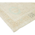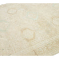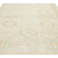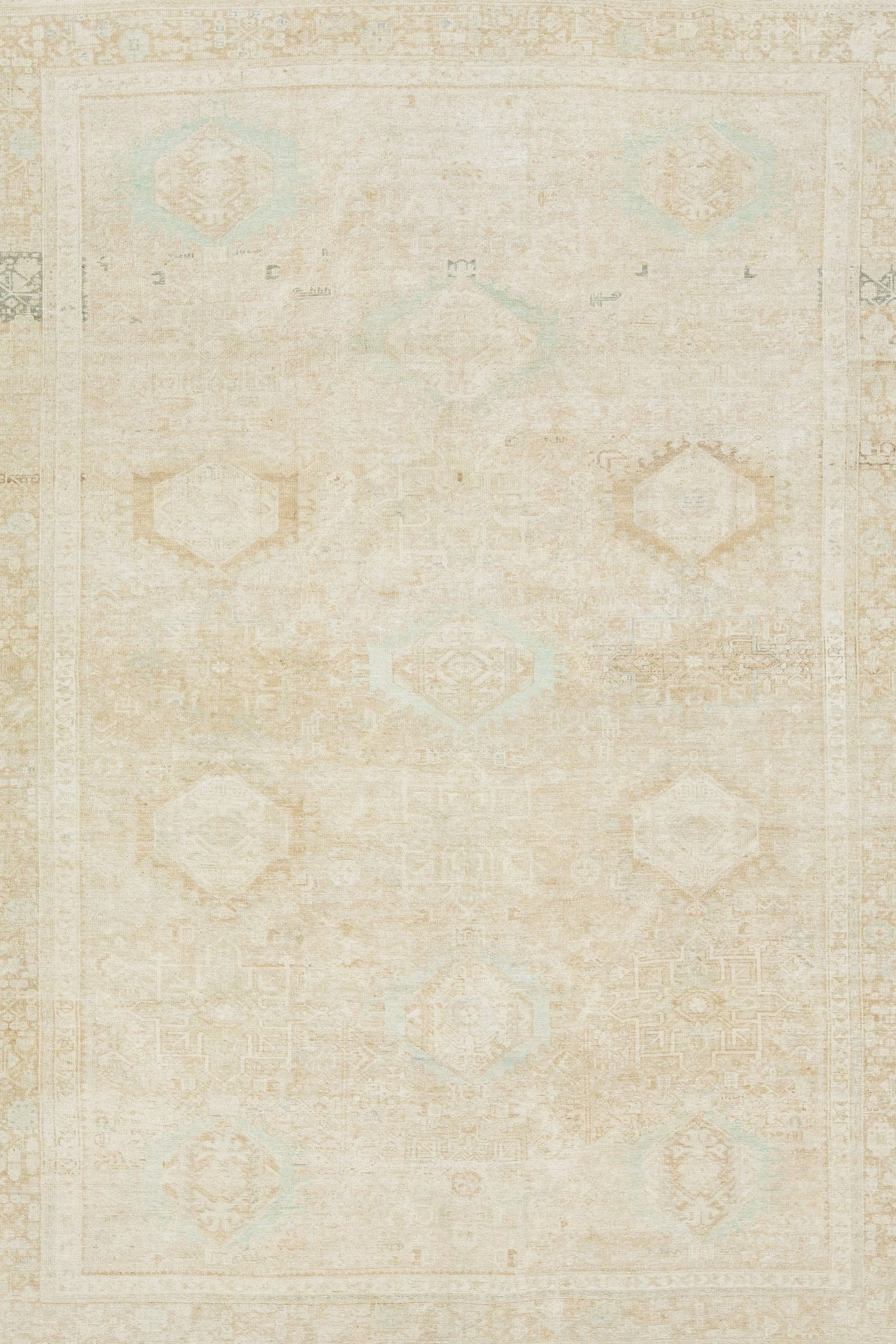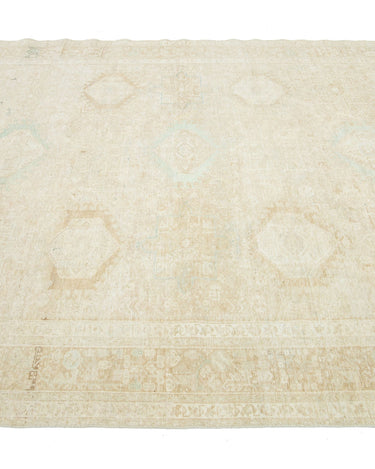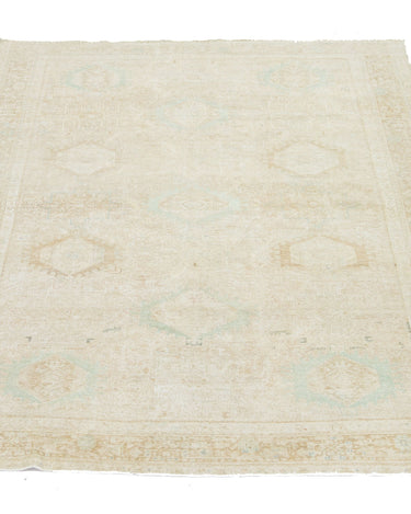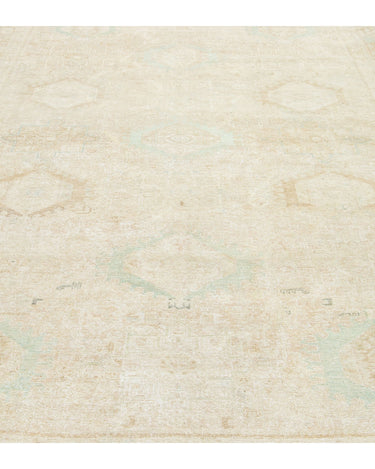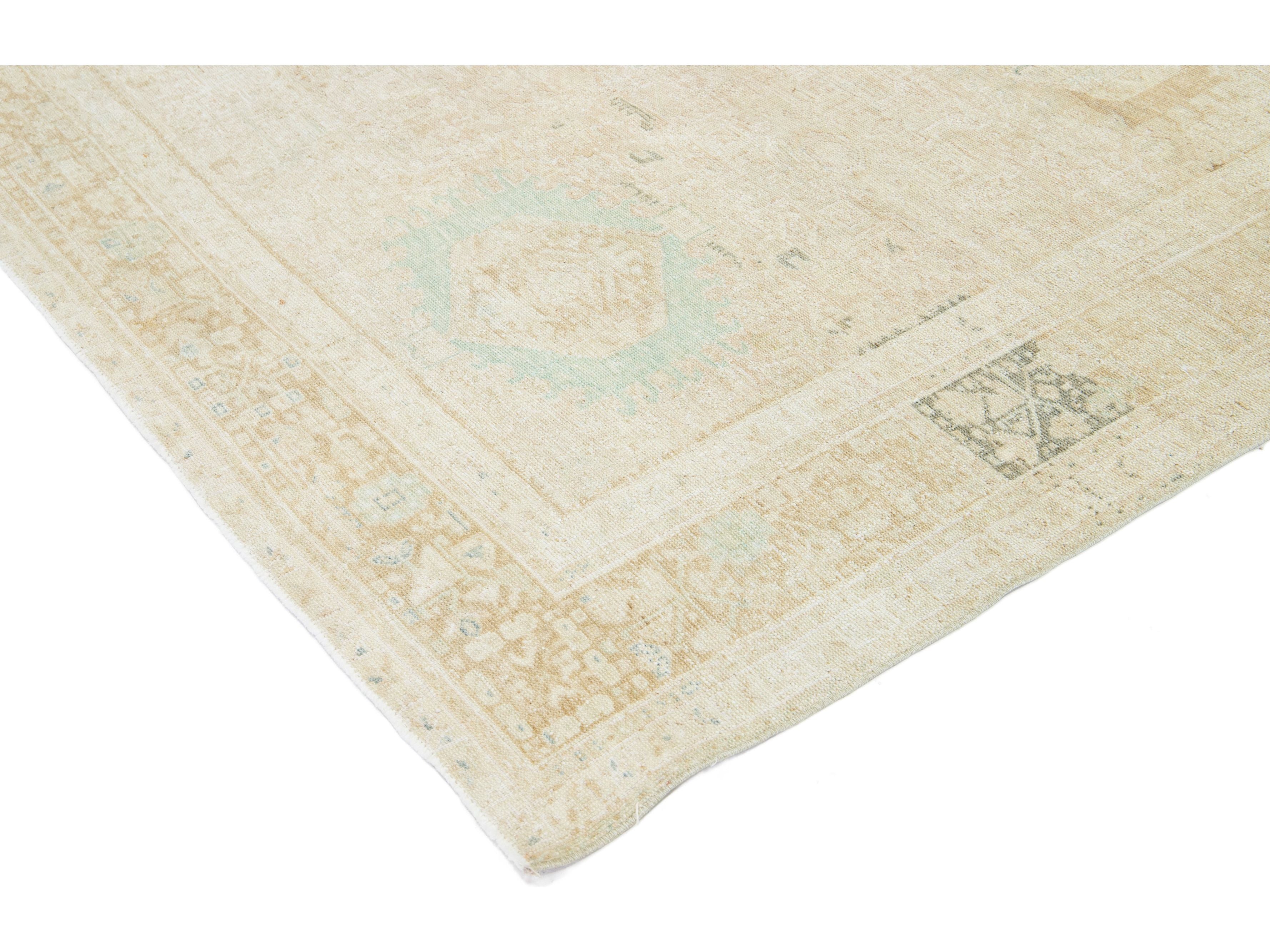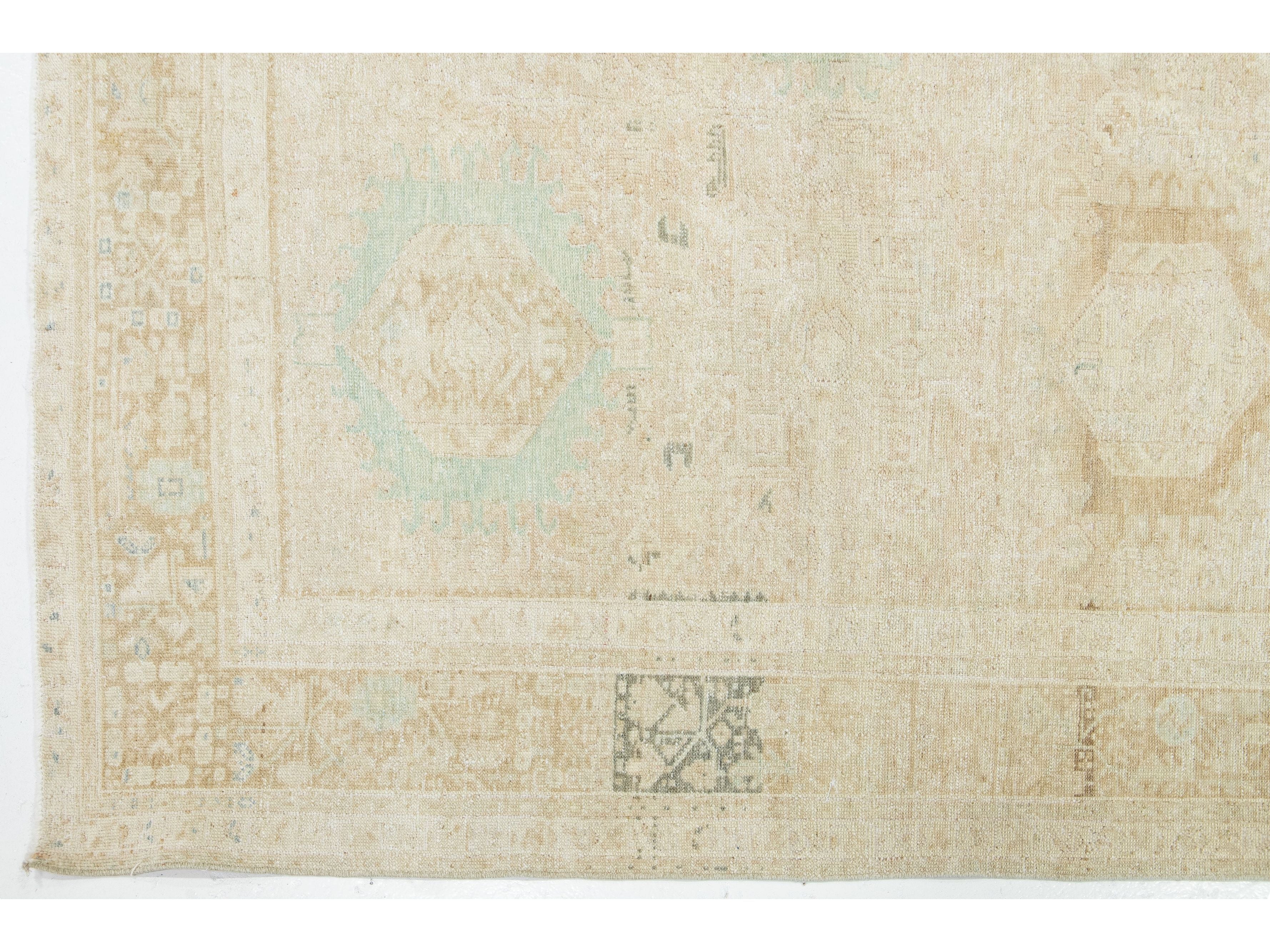 This exquisite antique Persian Heriz wool rug showcases a captivating green design that beautifully enhances a luxurious deep beige background.