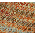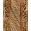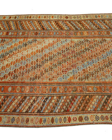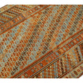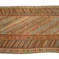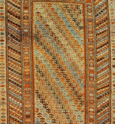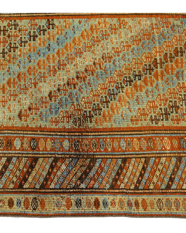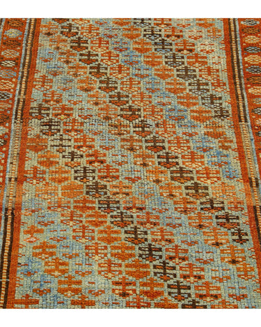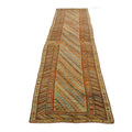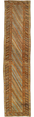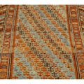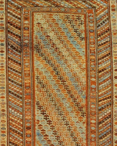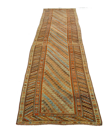 Beautiful Kurdish hand-knotted wool runner with a geometric design on a beige field. Accents of blue, orange, and brown throughout the piece.