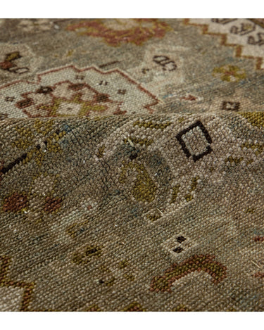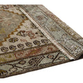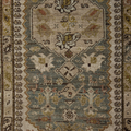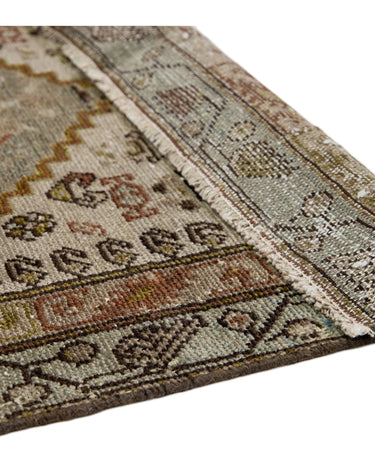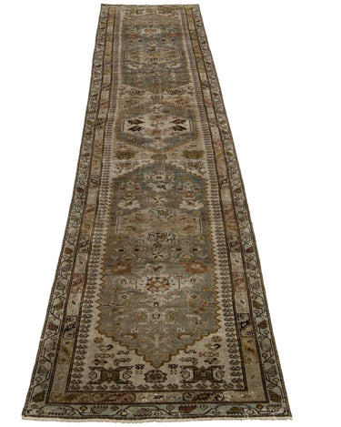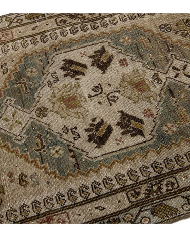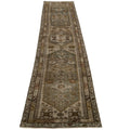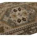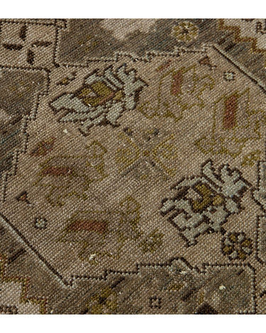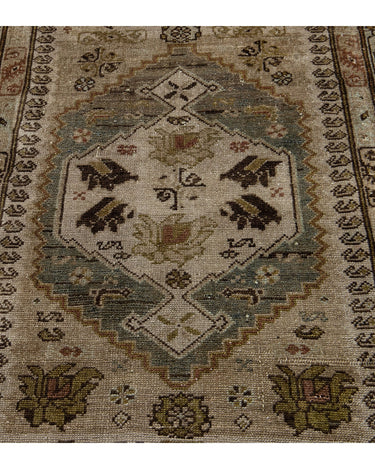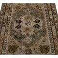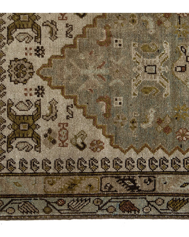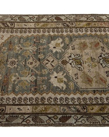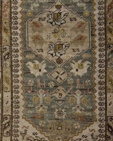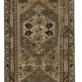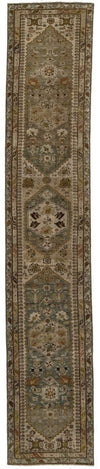 Elevate your space with this antique Persian wool rug. Hand-knotted in a light brown hue, its tribal pattern is enriched with rust, blue, and green. Measures 2'11" x 15'8".