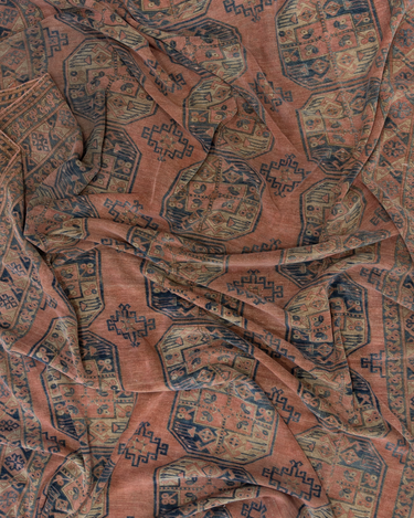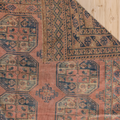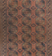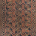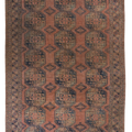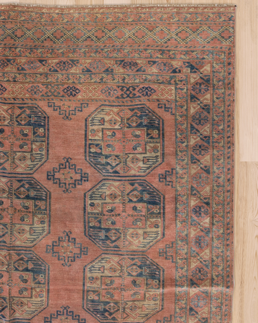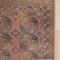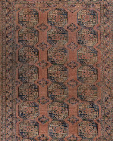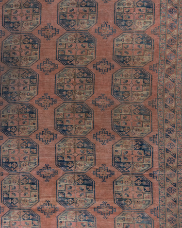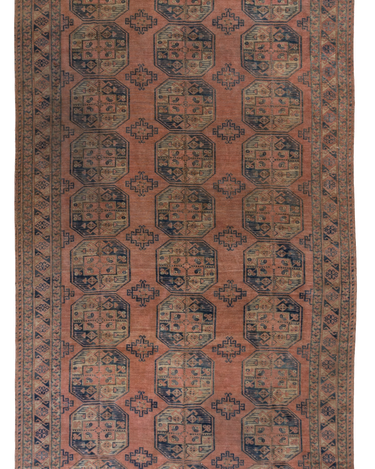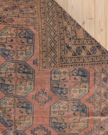 Beautiful salmon field Ersari with traditional guls in navy blue. Soft underfoot with a lovely original pile and a thin drapery feel.
