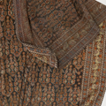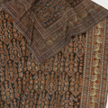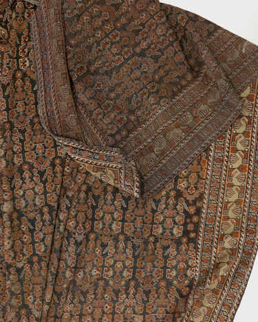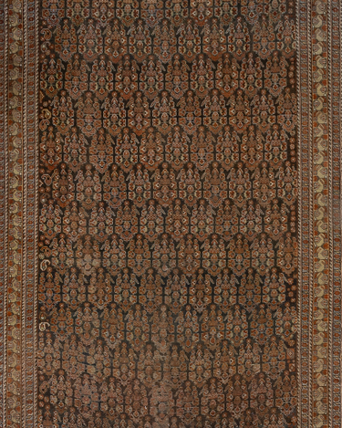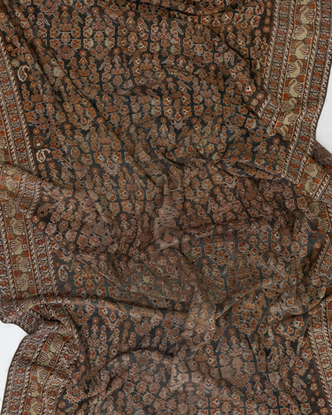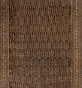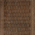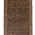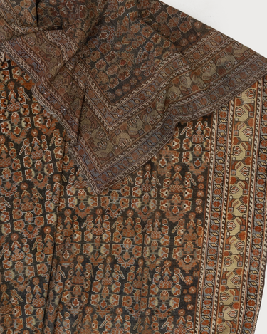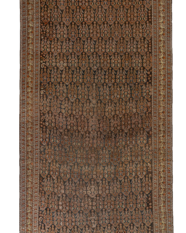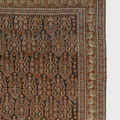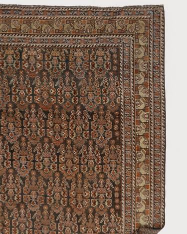 Gorgeous tribal antique Persian Shiraz rug woven in the early 1900's. Deep kohl black field filled with repeating seed like symbols that are well preserved. The highly detailed geographic border blends beautifully into the rug for a look that is easy to style. Wool on wool in overall good antique condition with a few well done repairs that are consistent with age.