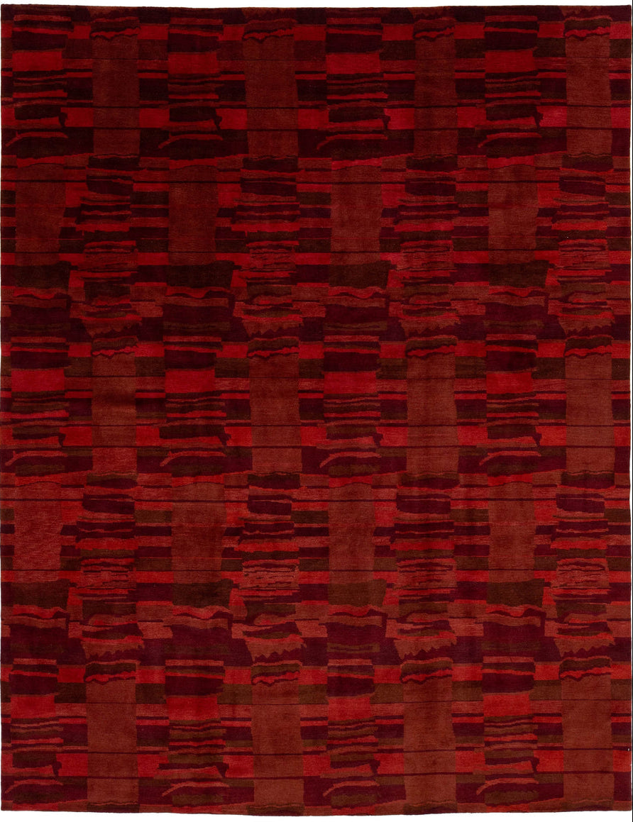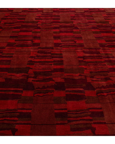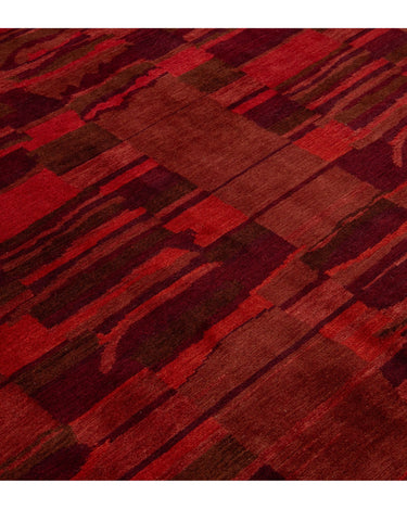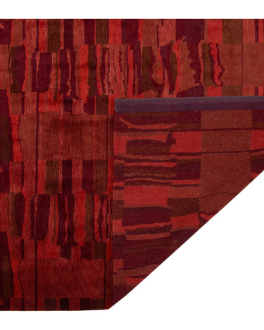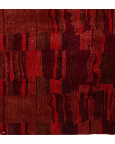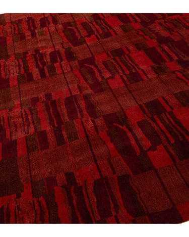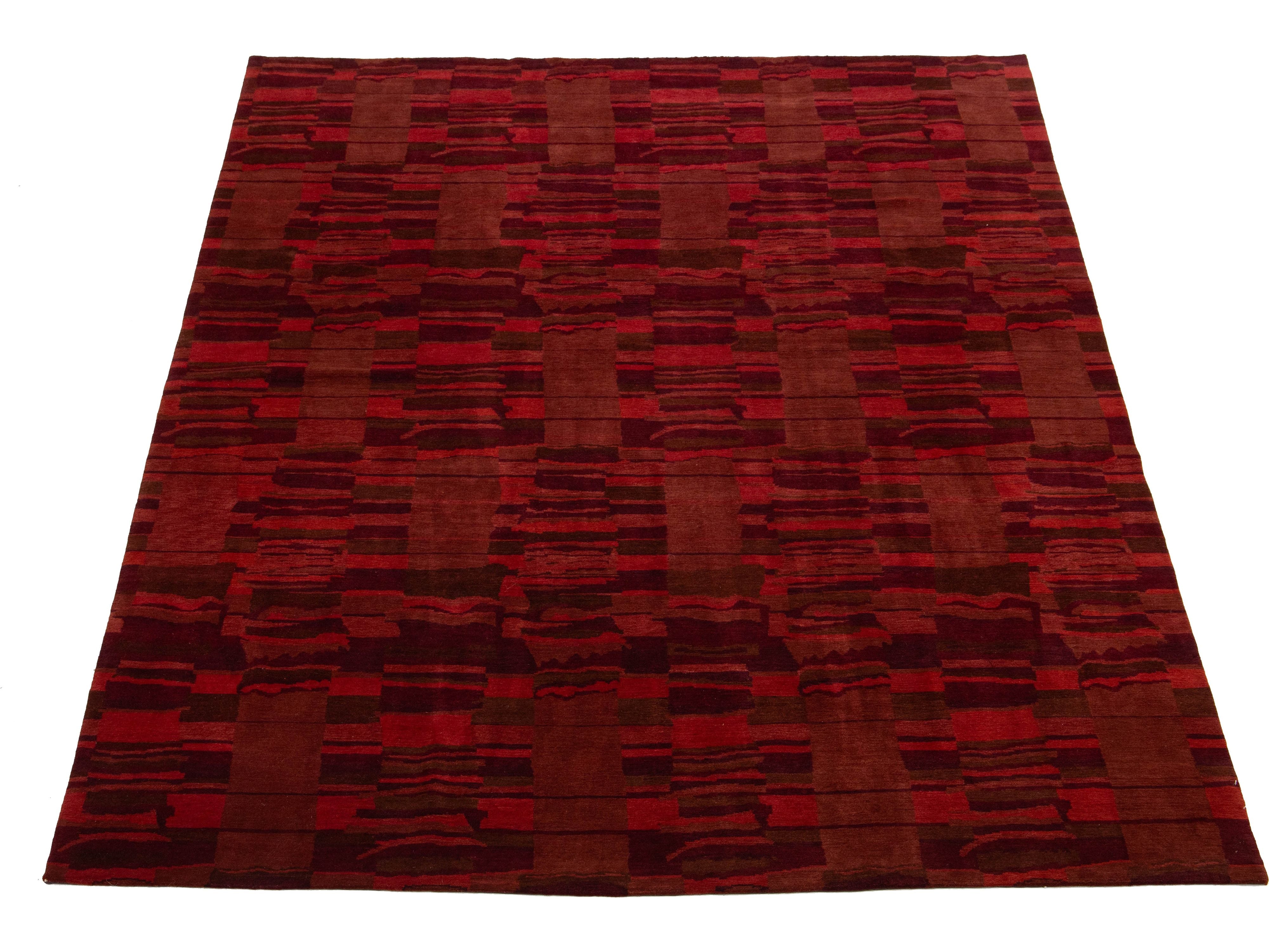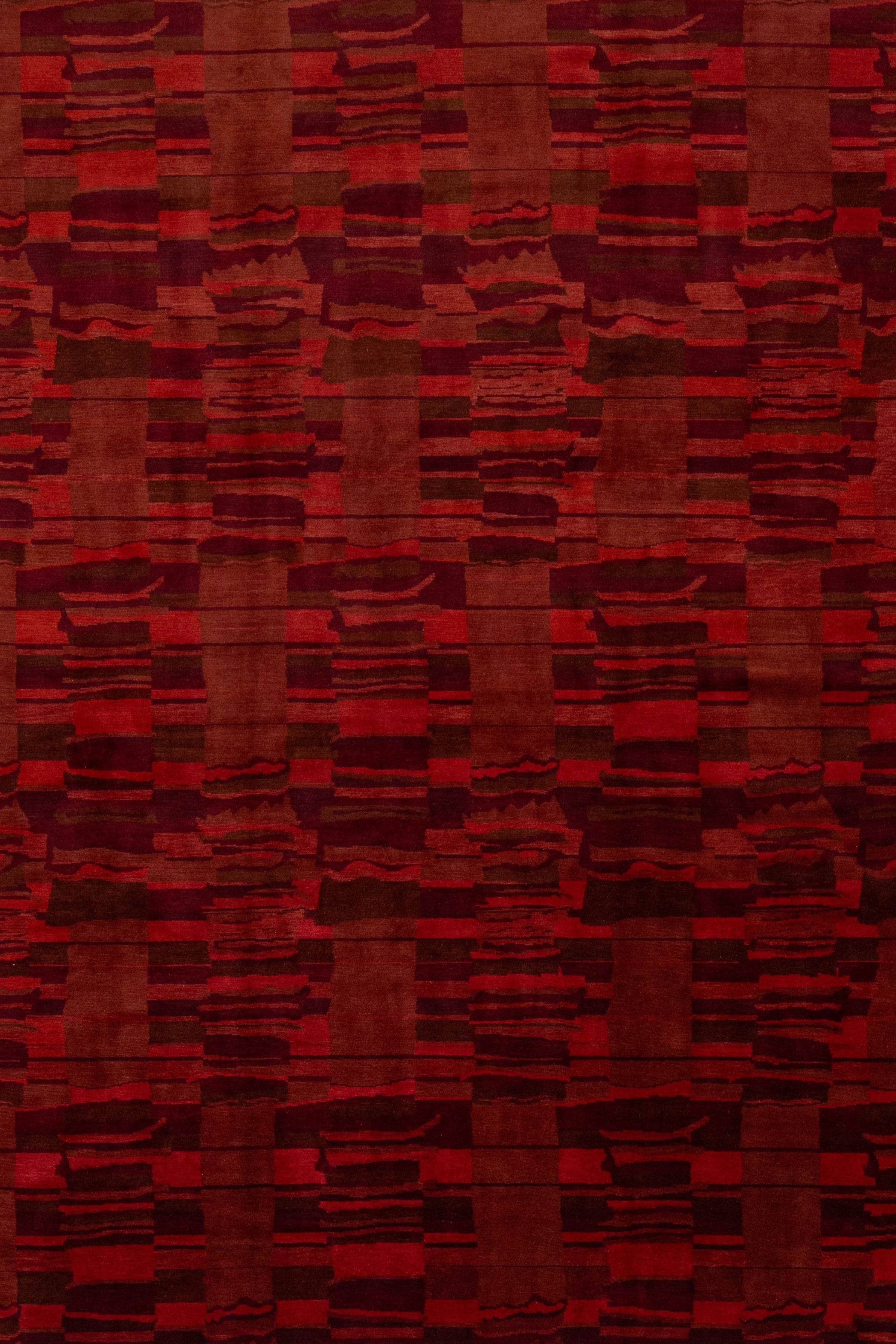 This contemporary Tibetan weave rug showcases a captivating abstract design. Made from premium Tibetan wool or silk, it highlights intricate details that reveal stunning shades of red, adding a vibrant touch to any space.
